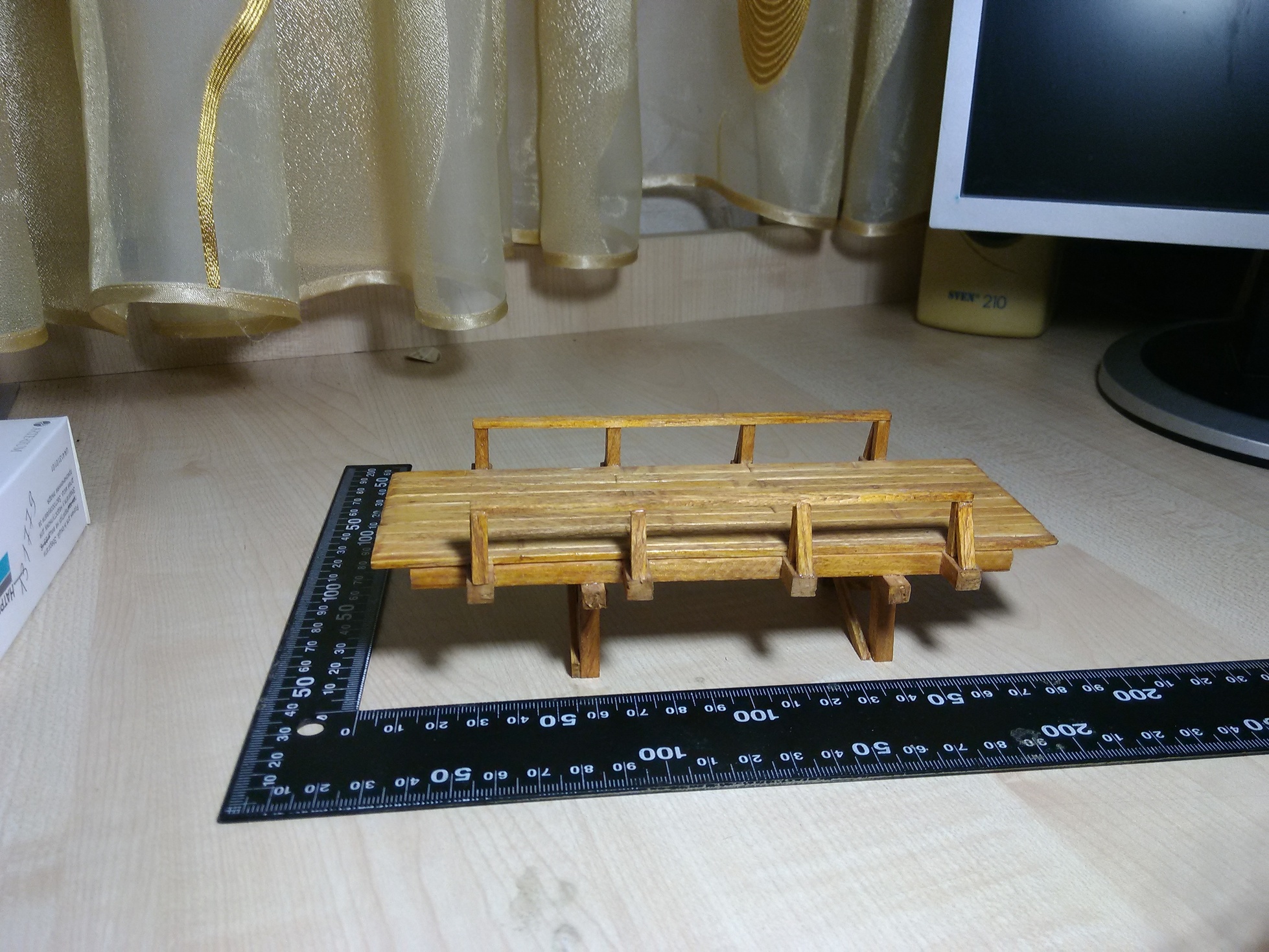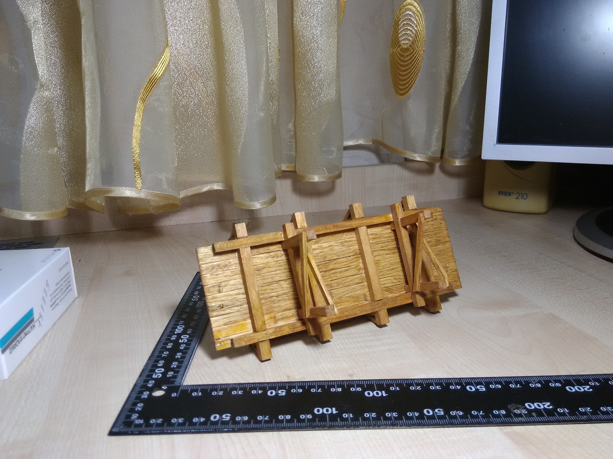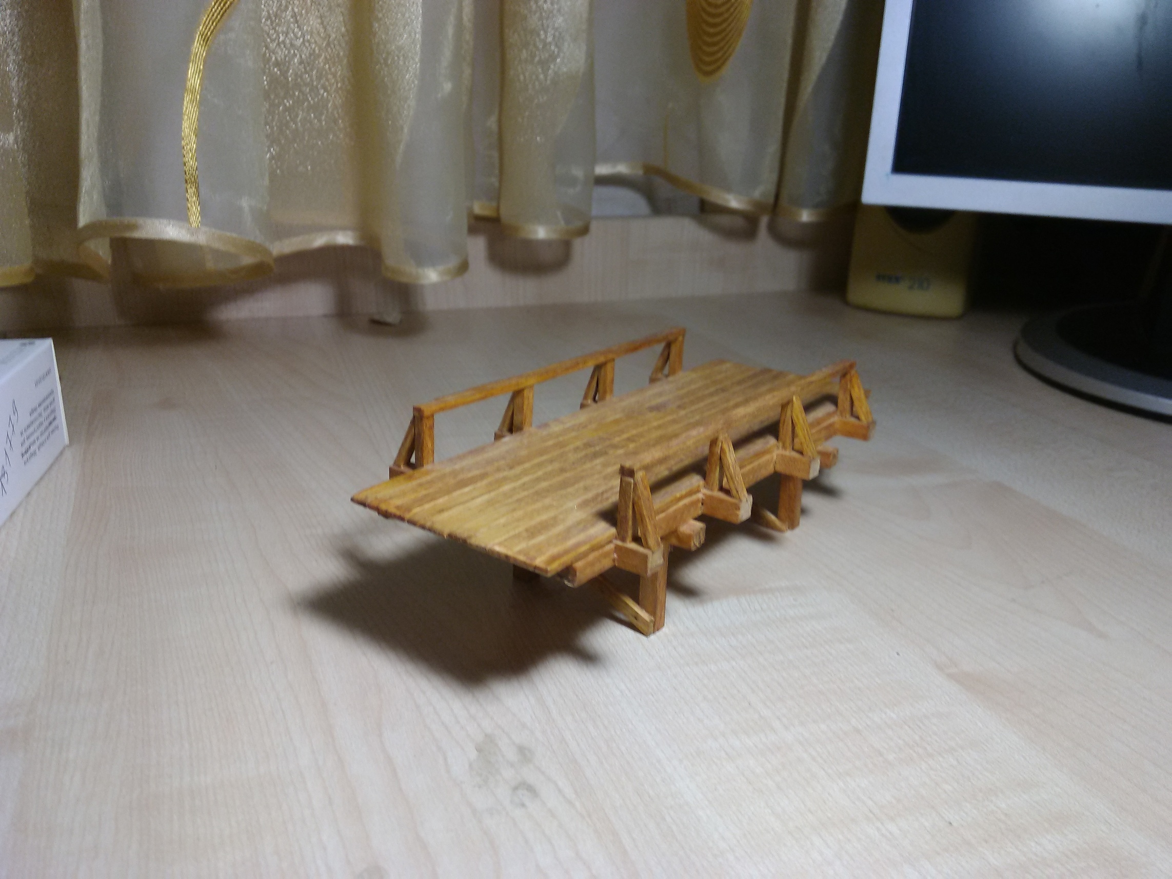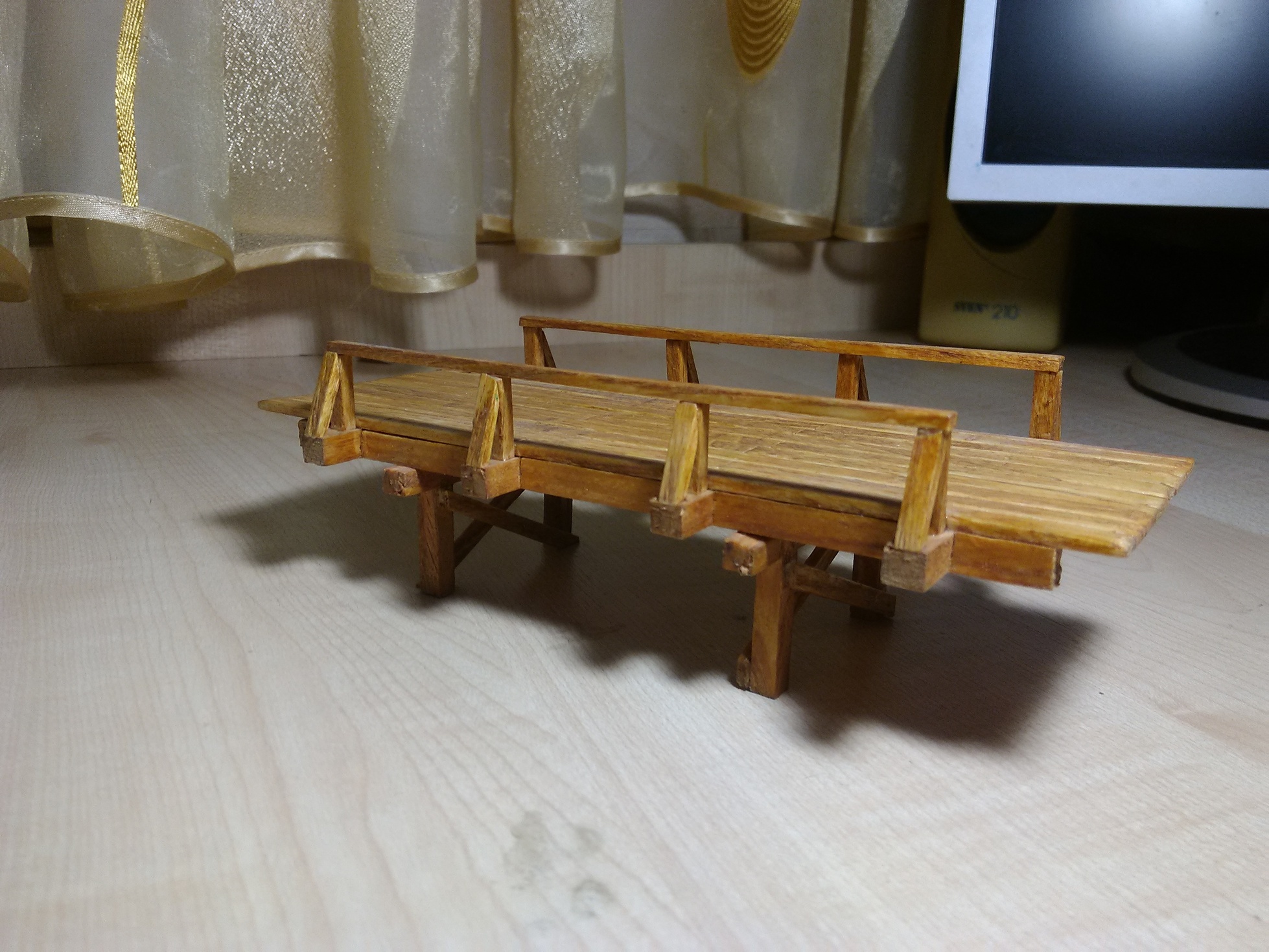Ну и напоследок. Сын (7 лет) сильно захотел озеро. Грит, хочу озеро для фермы, и все. Пришлось делать озеро. Ну а что за озеро без мельницы и моста. Сваяли такой мост междк берегами будет стоять. Материал для настила - деревянный ящик для фруктов, балки моста - сосновая реечка (летом покупали сладкую вату, на эту палочку ее наматывали). Настил набирался из отдельных досок. Клеилось все ПВА.