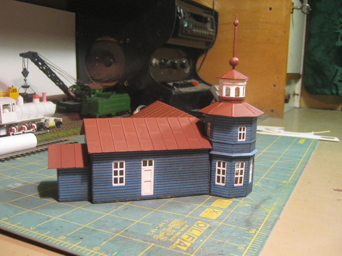 Нарисовался облик некоего деревенского адмиралтейства... Все детали крыши, включая башню, пока просто приложены. До финиша ещё далеко потому, что предстоит сделать массу мелочёвки, а специально для этой модели время не выделяется. Всё делается как обычно - в перекуре...
