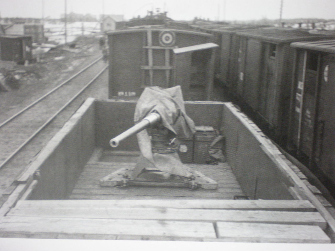 - "был изготовлен в 1932 году в память о каком-то местном революционном бронепоезде и соответственно поставлен как памятник. Во время войны при отступлении его закопали. После освобождения откопали и поставили обратно. В качестве основы для него взята 30-футовая платформа, кстати видны следы снятых шпренгелей. Самое ценное на этом вагоне - буксы."