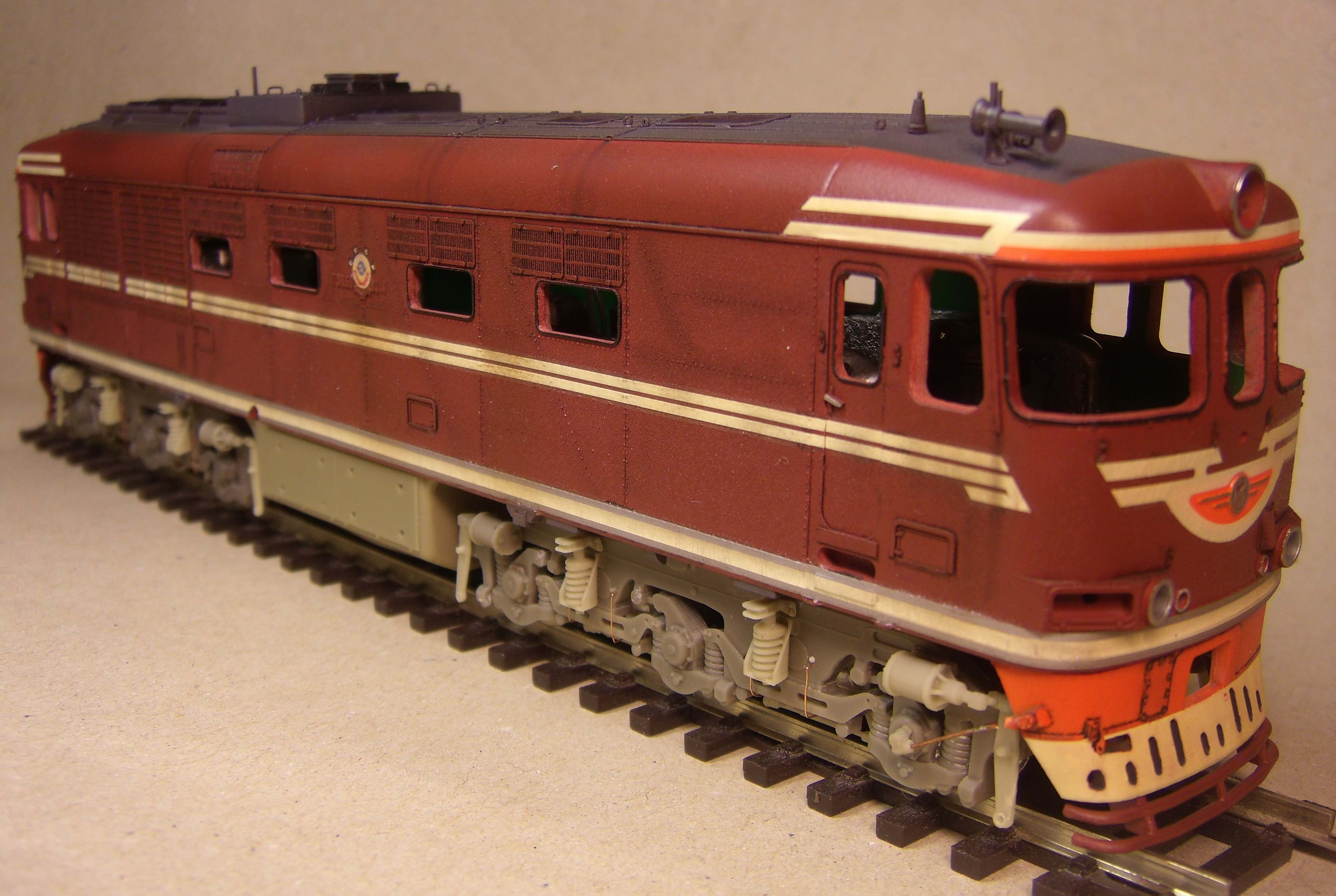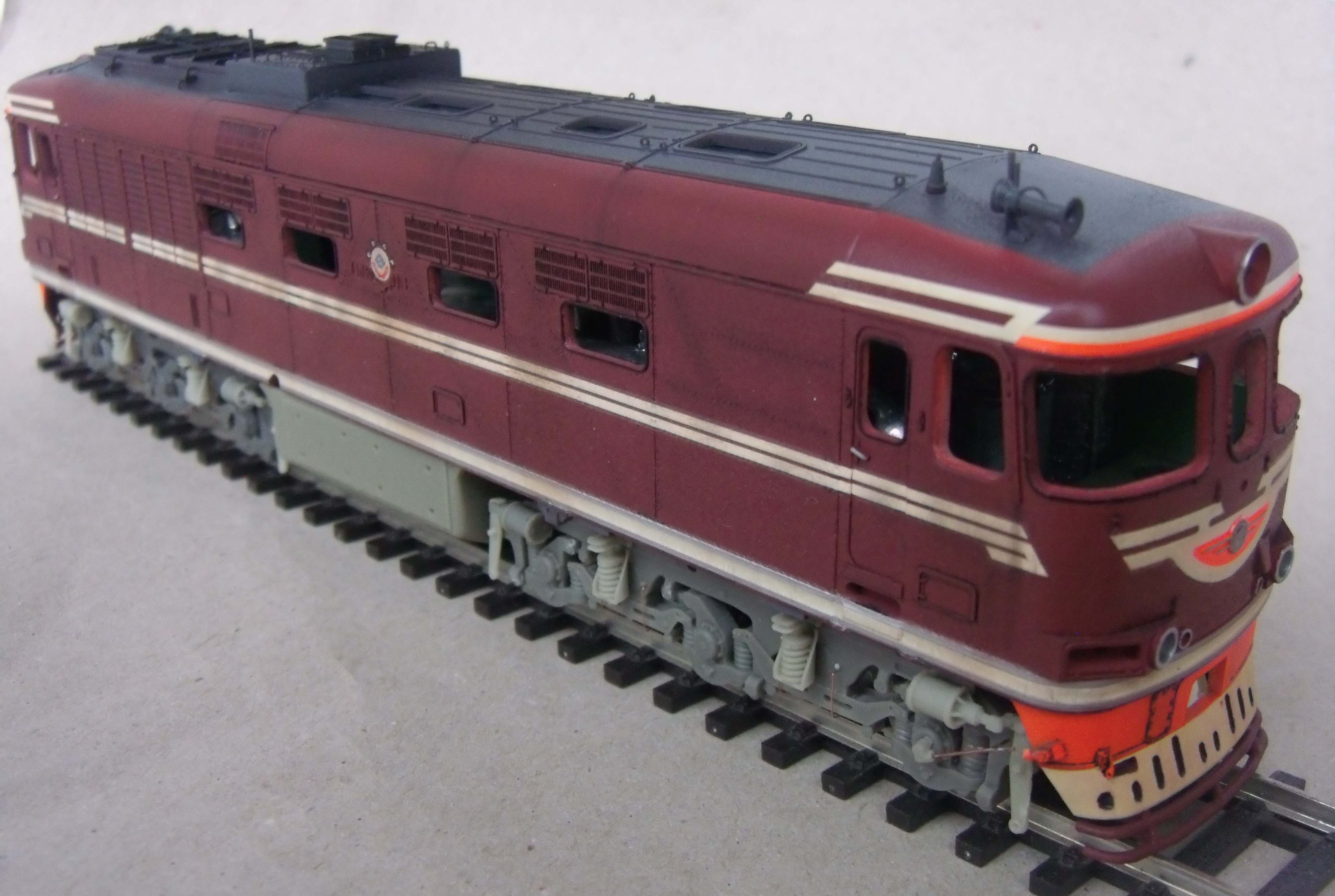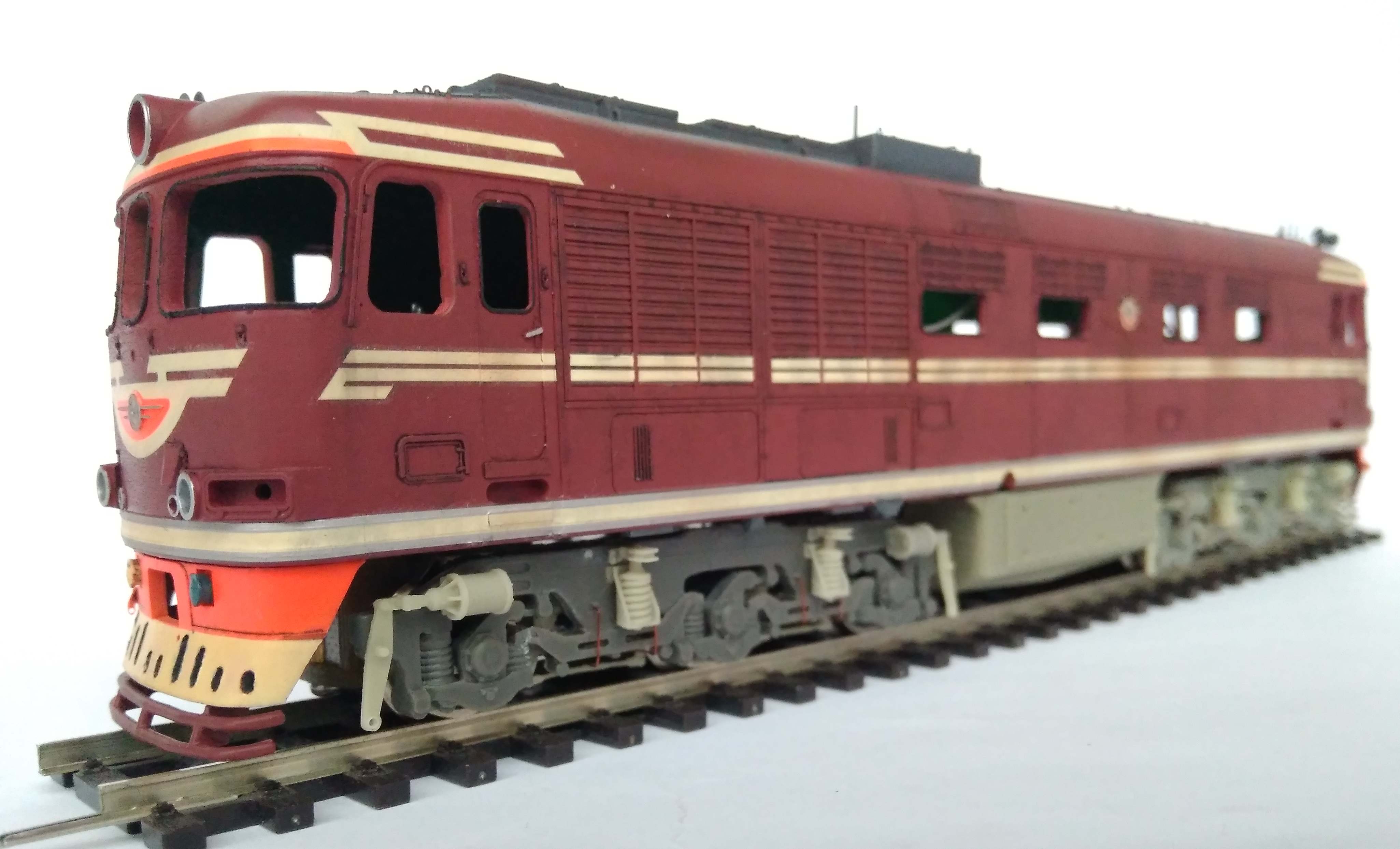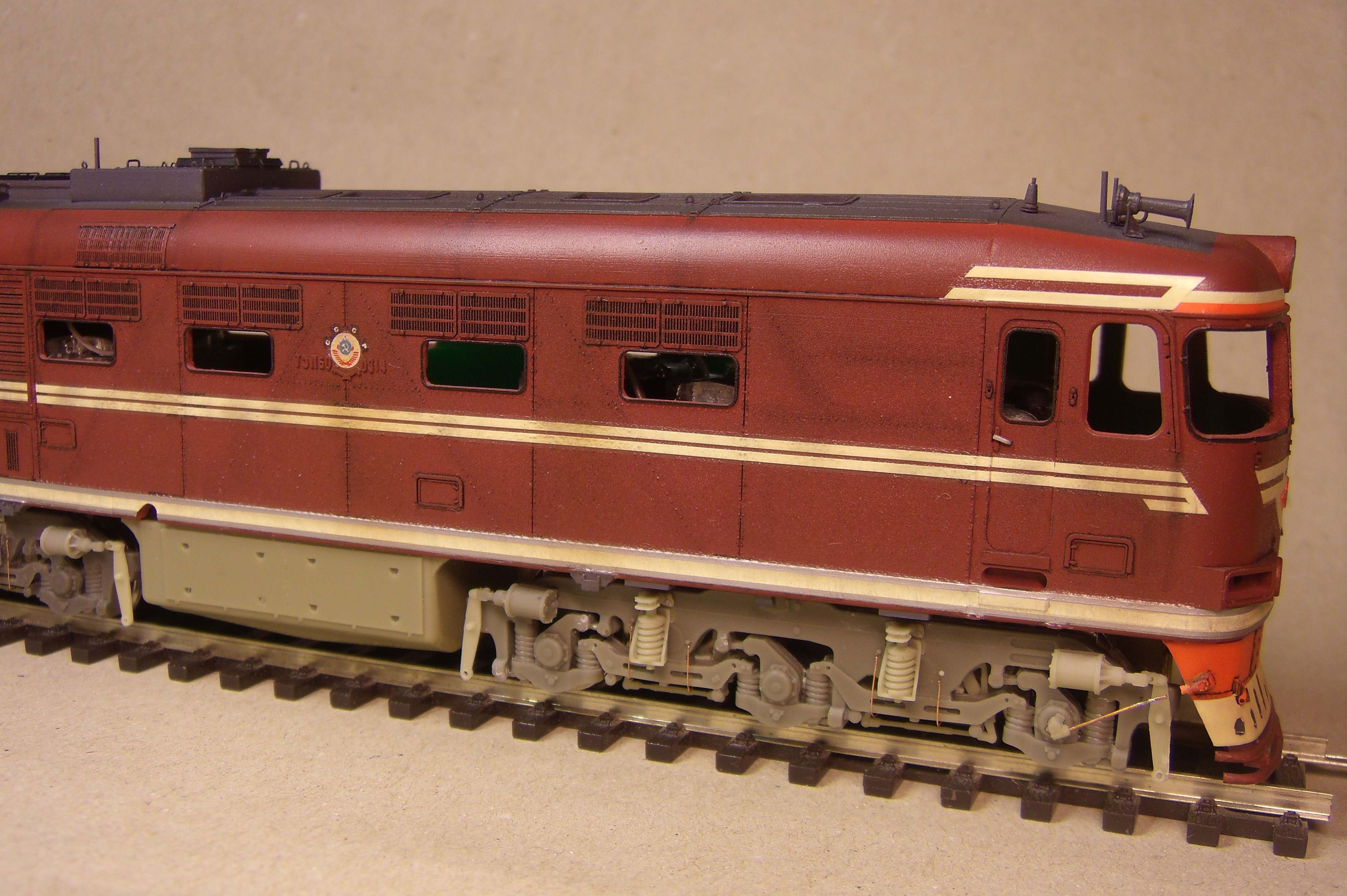 Ставили мы перед собой задачу делать машину "в повседневной эксплуатации", вот как получилось... Лично меня больше всего ошеломляют до восторга потёки с крыши к водостоку, они как бы доказывают зрителю стопроцентно что это не просто выделенные смывкой детали, а именно художественно нарисованные элементы, как на картине, которые связывают всё вместе, и создают ощущение действующего тепловоза...