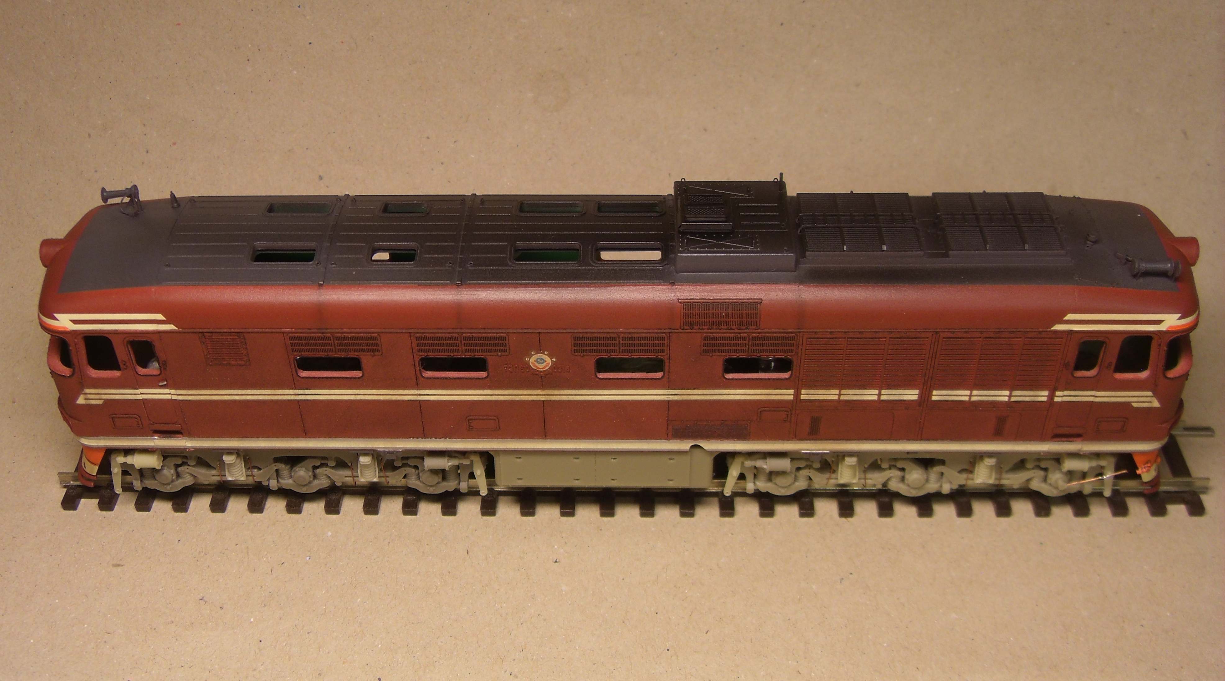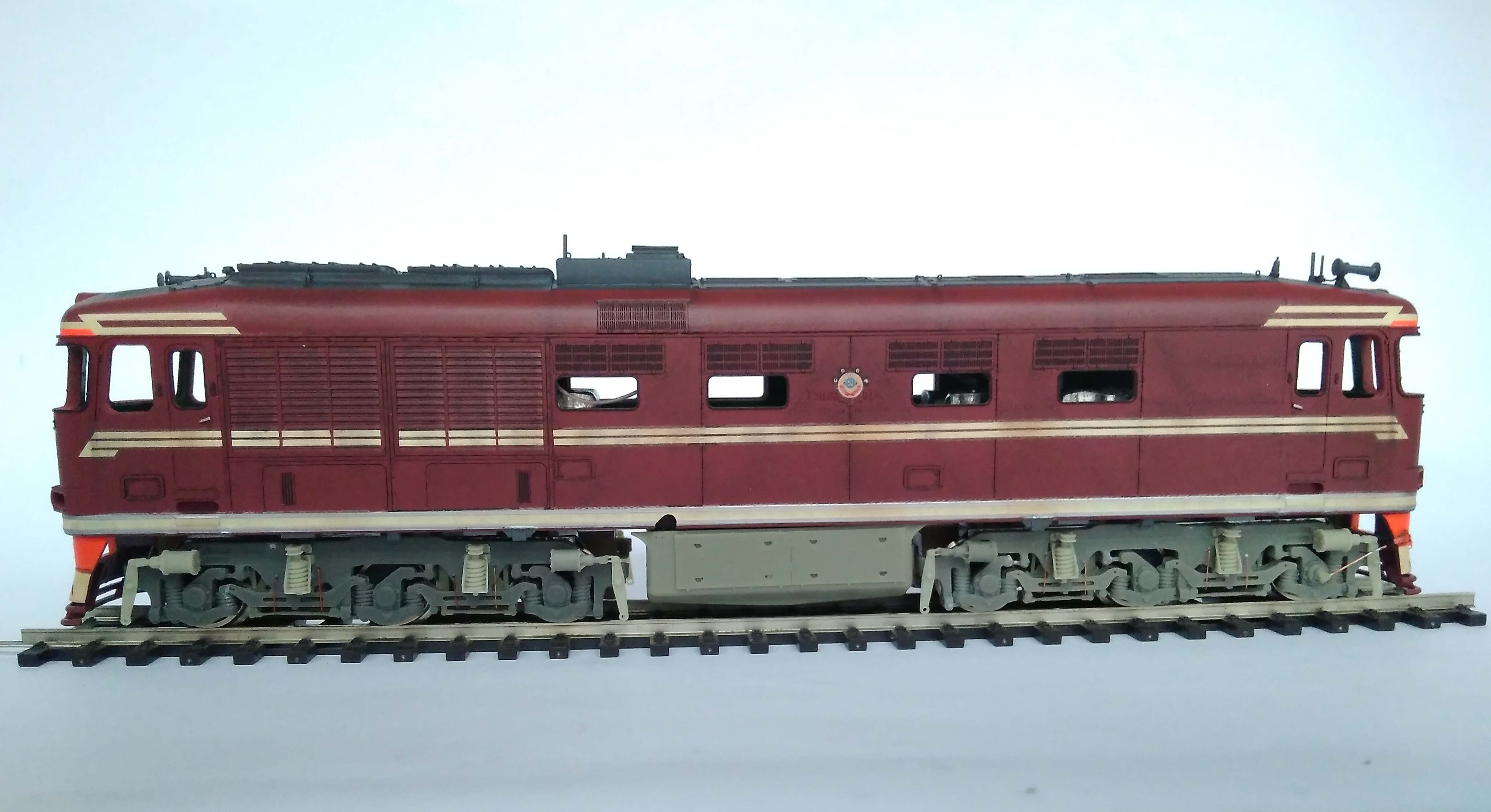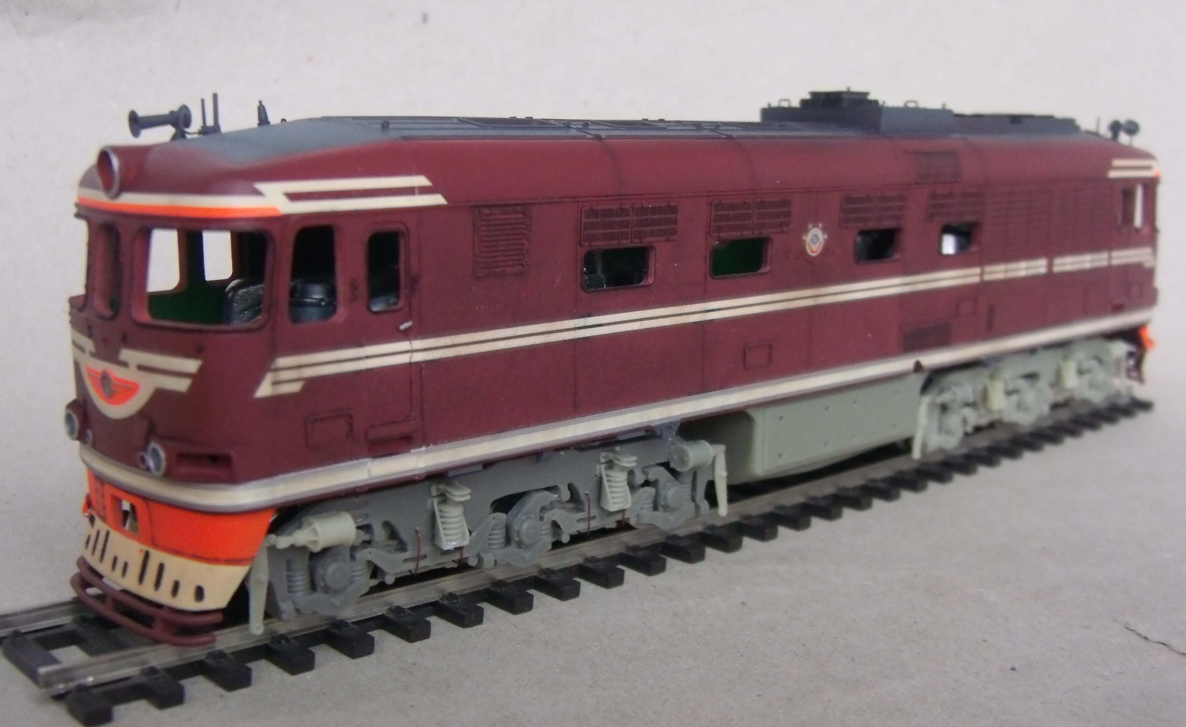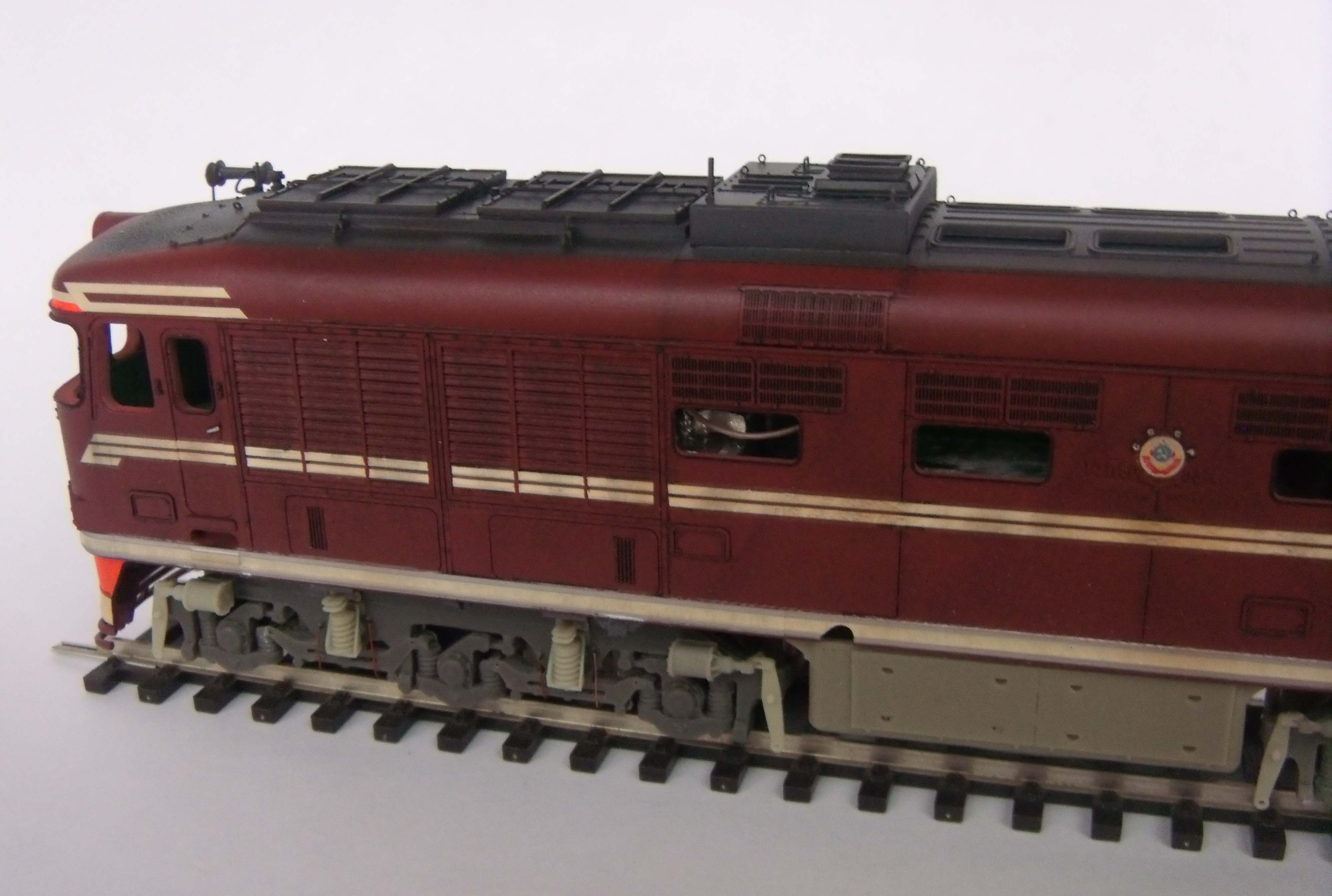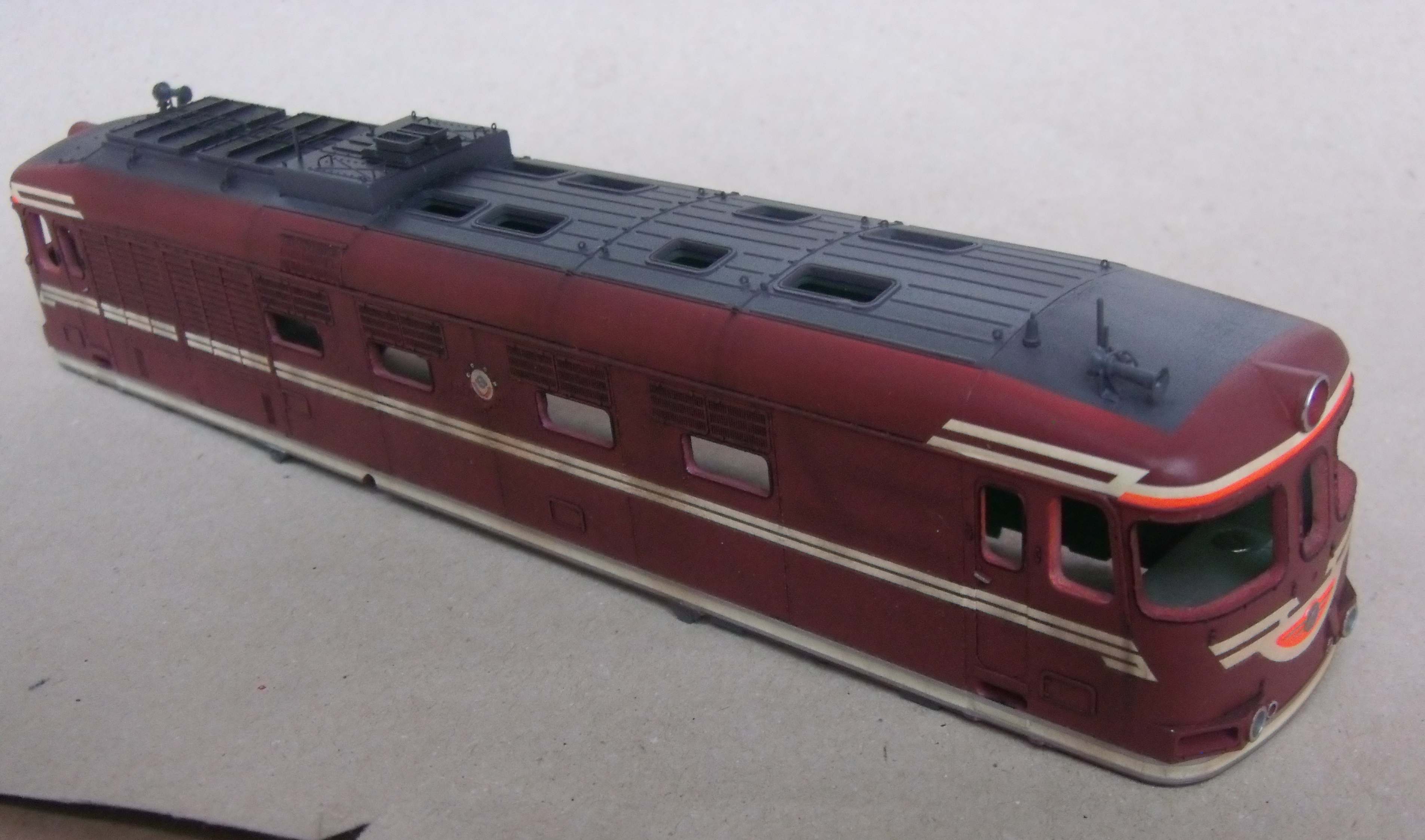 Ставили мы перед собой задачу делать машину "в повседневной эксплуатации", вот как получилось... Лично меня больше всего ошеломляют до восторга потёки с крыши к водостоку, они как бы доказывают зрителю стопроцентно что это не просто выделенные смывкой детали, а именно художественно нарисованные элементы, как на картине, которые связывают всё вместе, и создают ощущение действующего тепловоза...