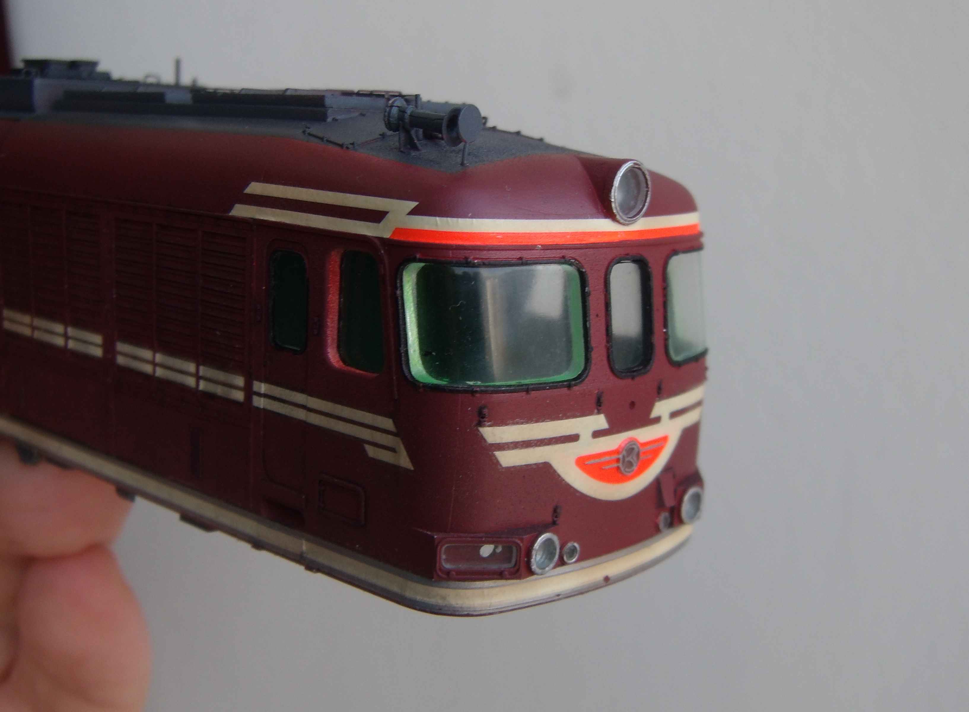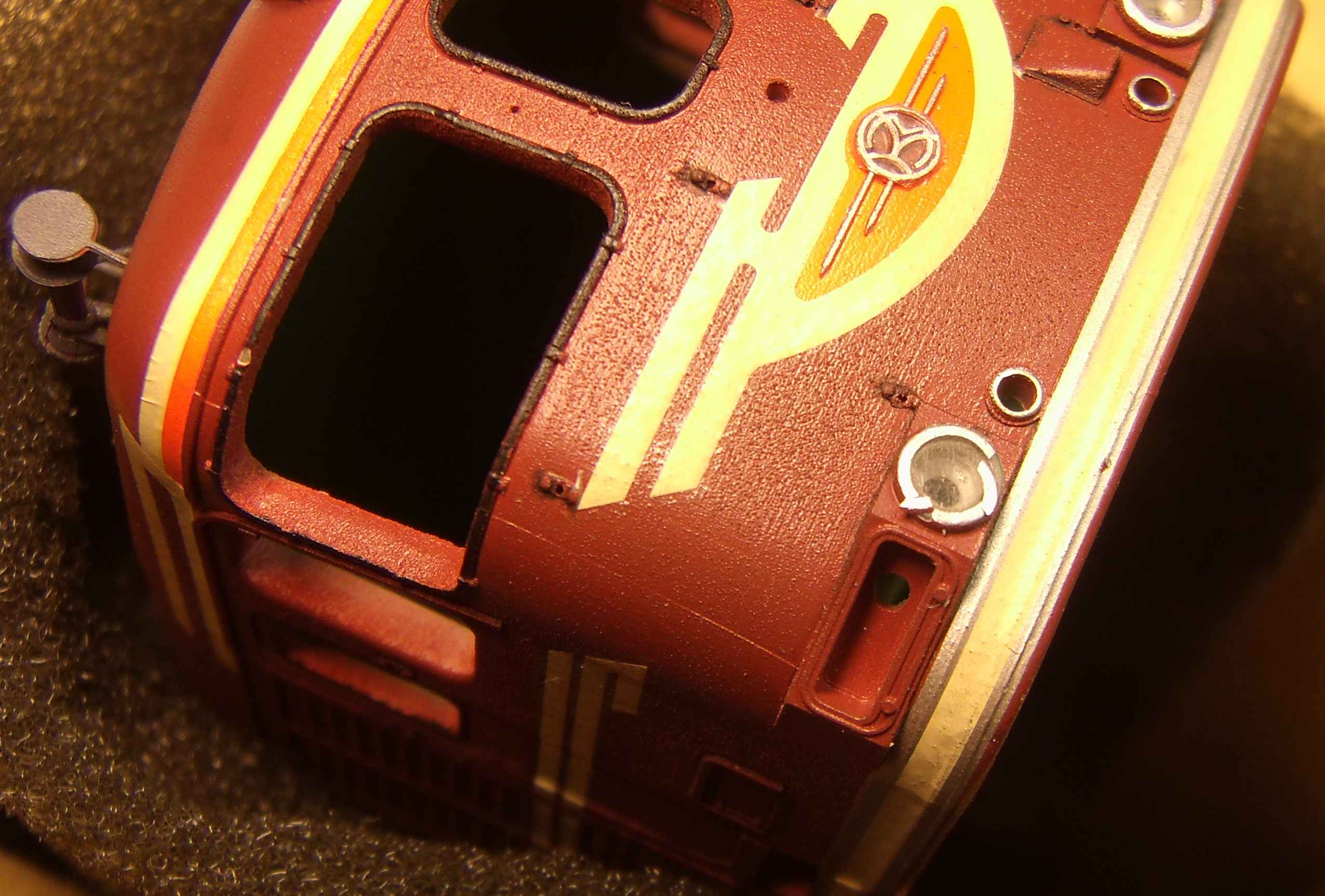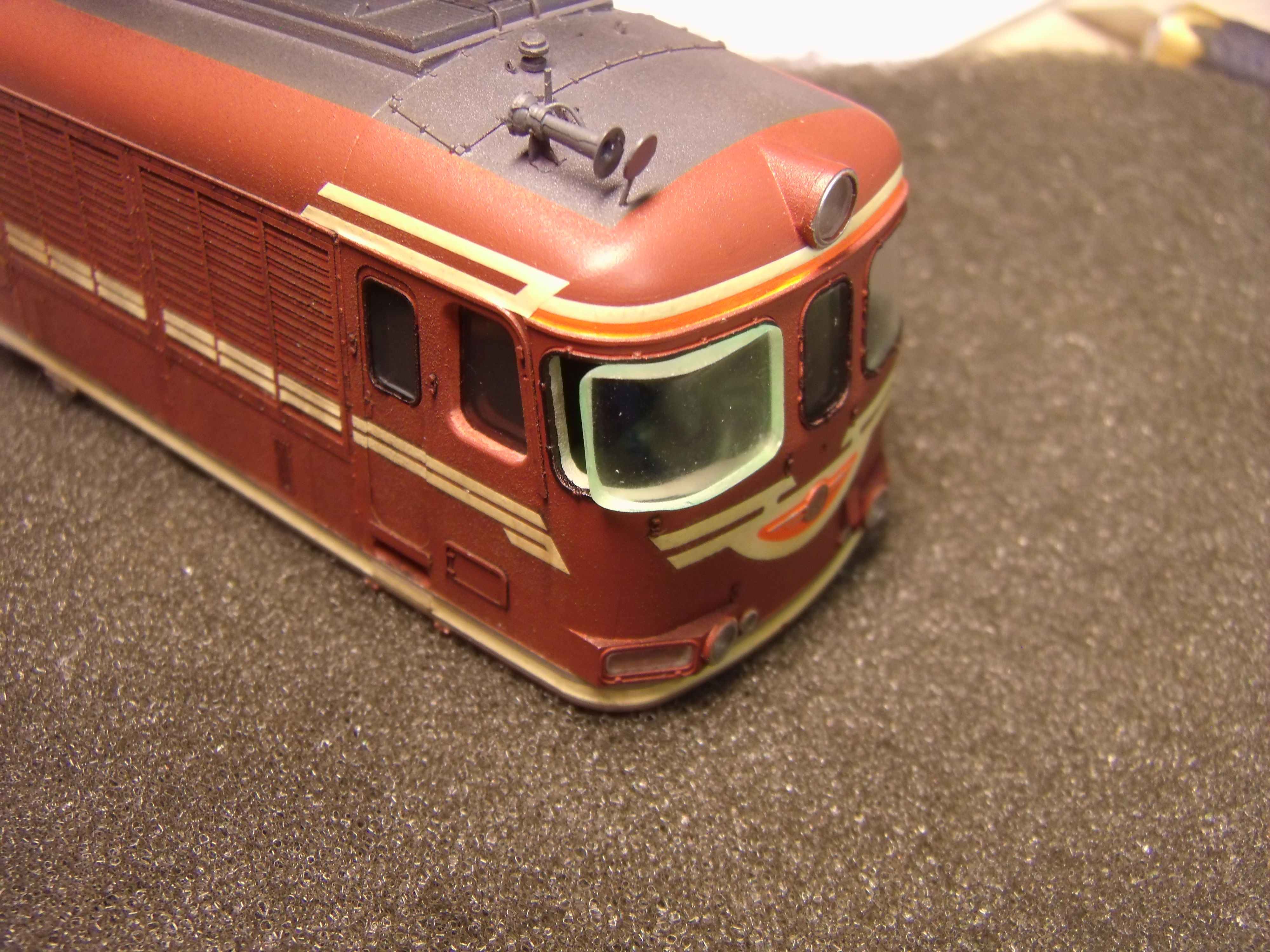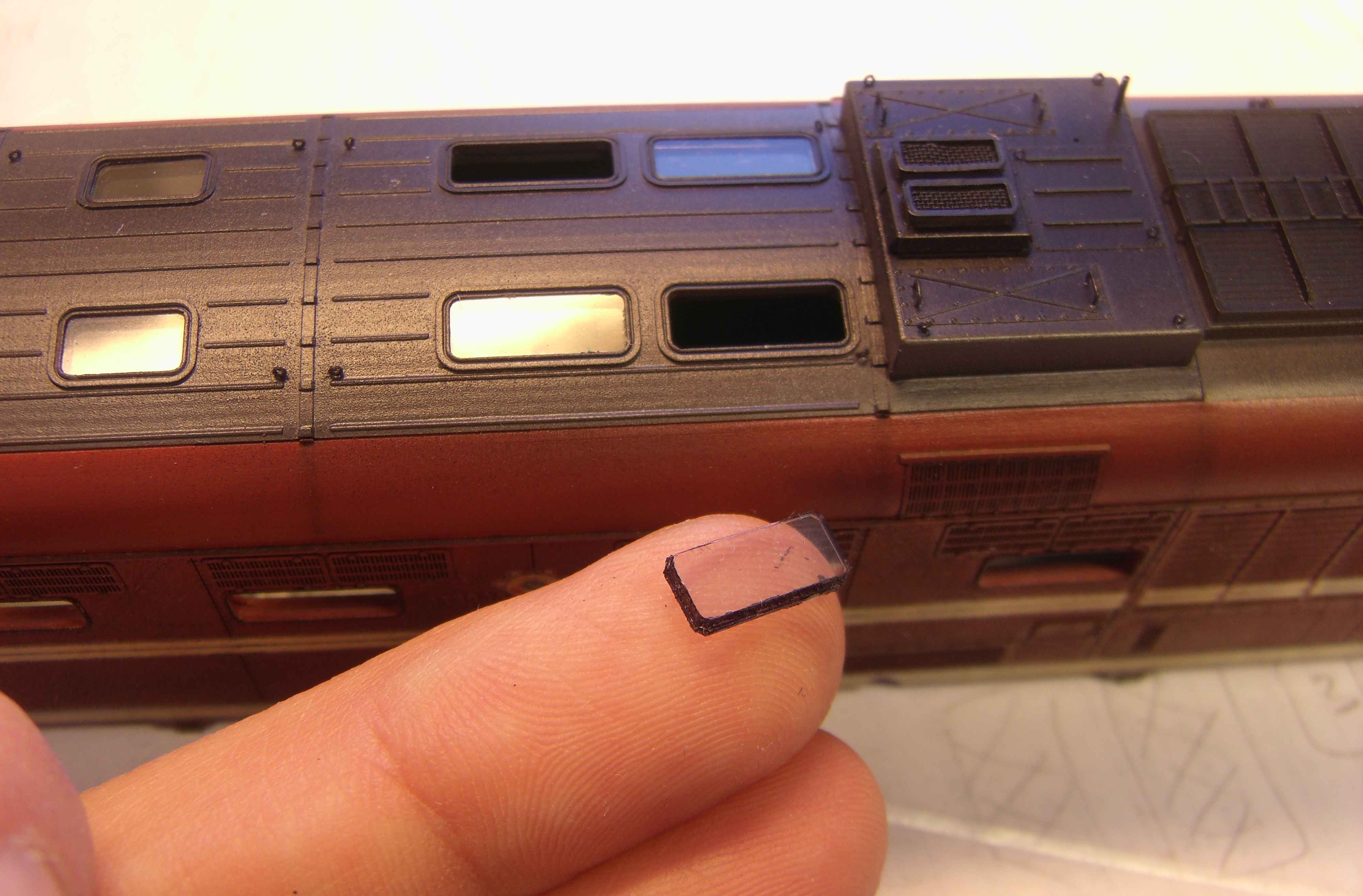 Первая сторона, с попыткой имитации окантовки внутри кабины... здесь периметр стекла при подготовке полностью выровнен... Вторая сторона, просто вставил стёкла... здесь внутренний периметр стекла на срезан по краям, и он превратился в упор при установке... Процесс... сопровождался редкими неприятными сколами краски... труднее всего было установить стёкла буферных фонарей, особенно маленьких, и прожектора... а легче всего стёкла на крыше...