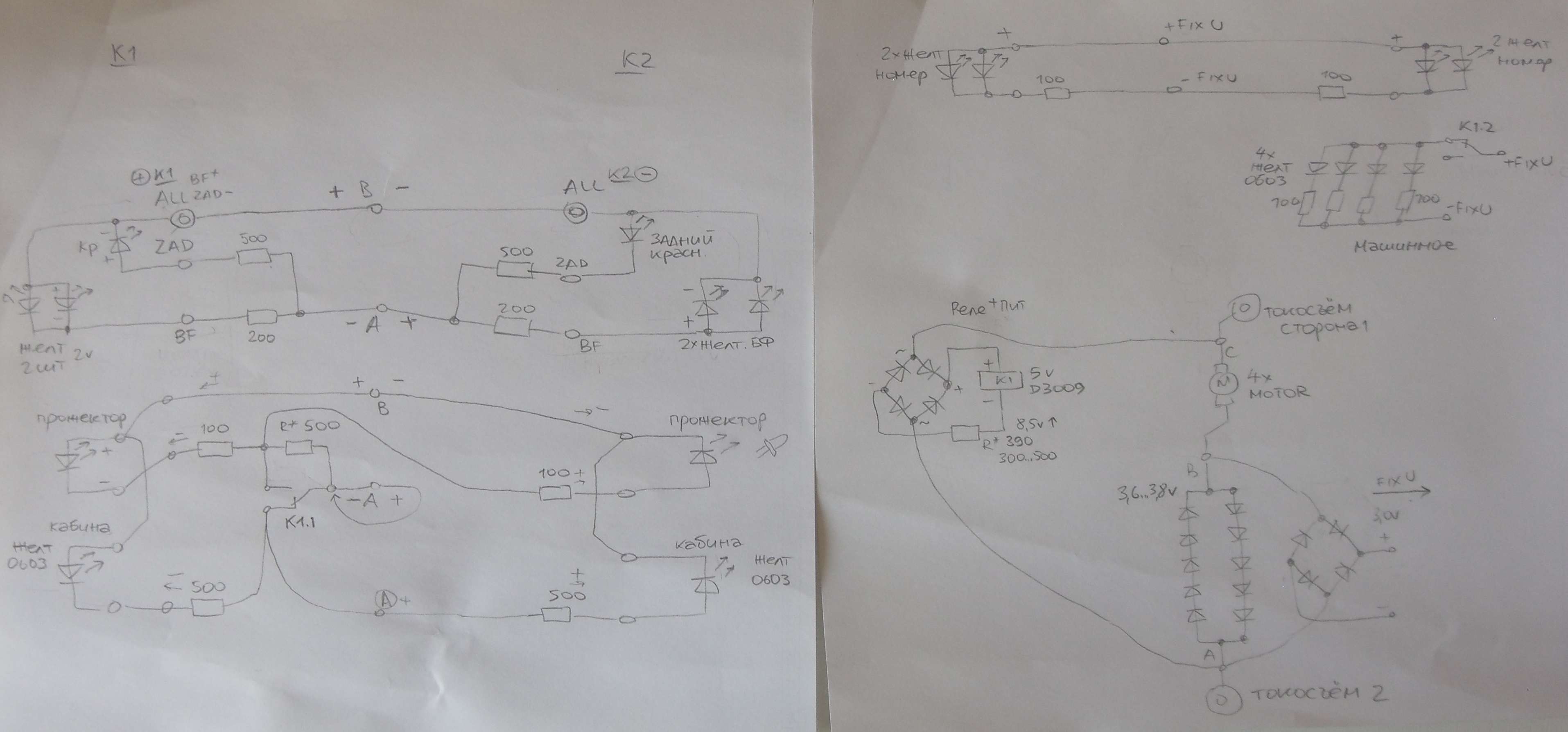 всего три проводка поднимается от ходового монстра вверх к "освещению" под крышу.. схемой я доволен.. позже нарисую и покажу..