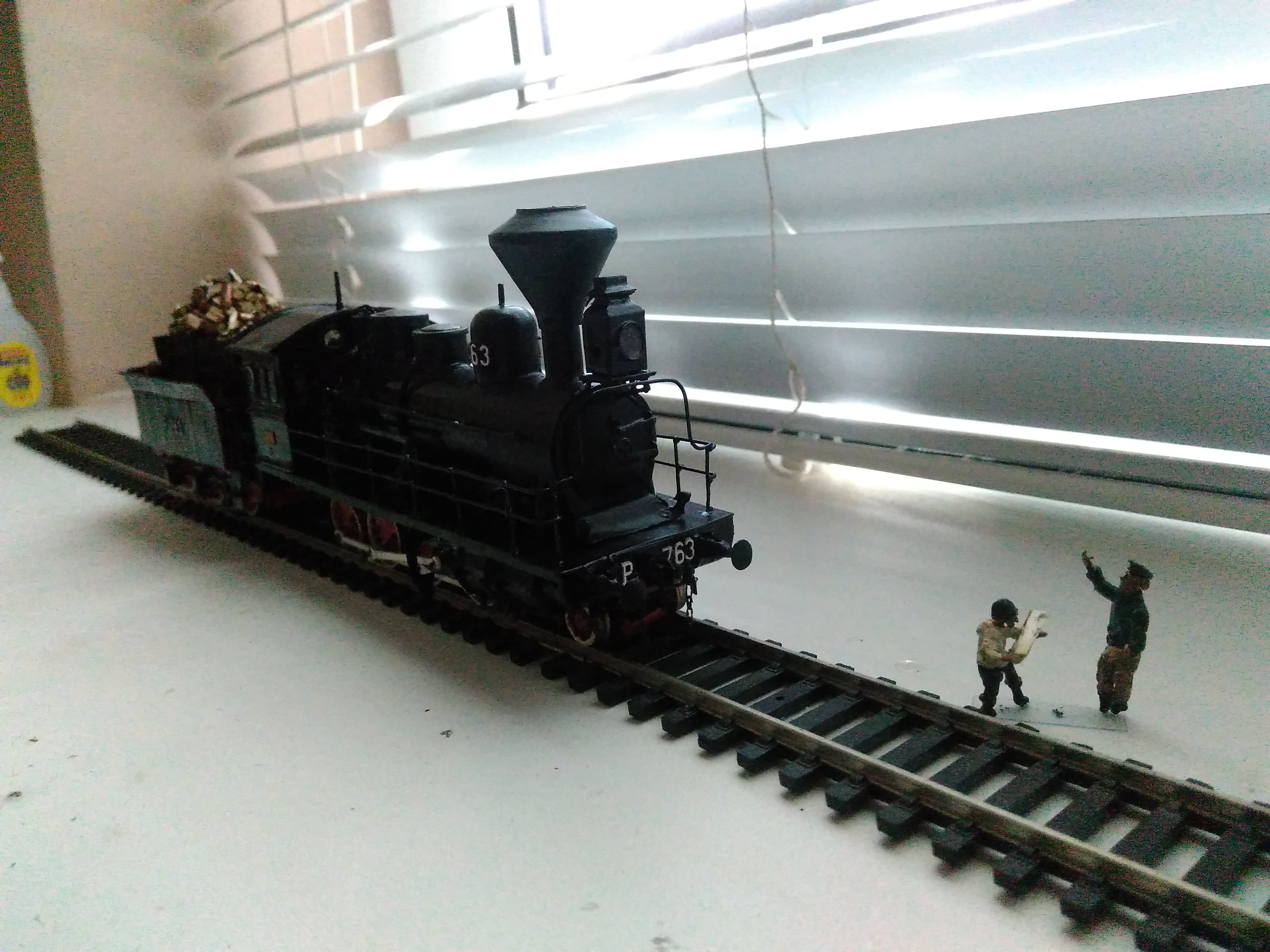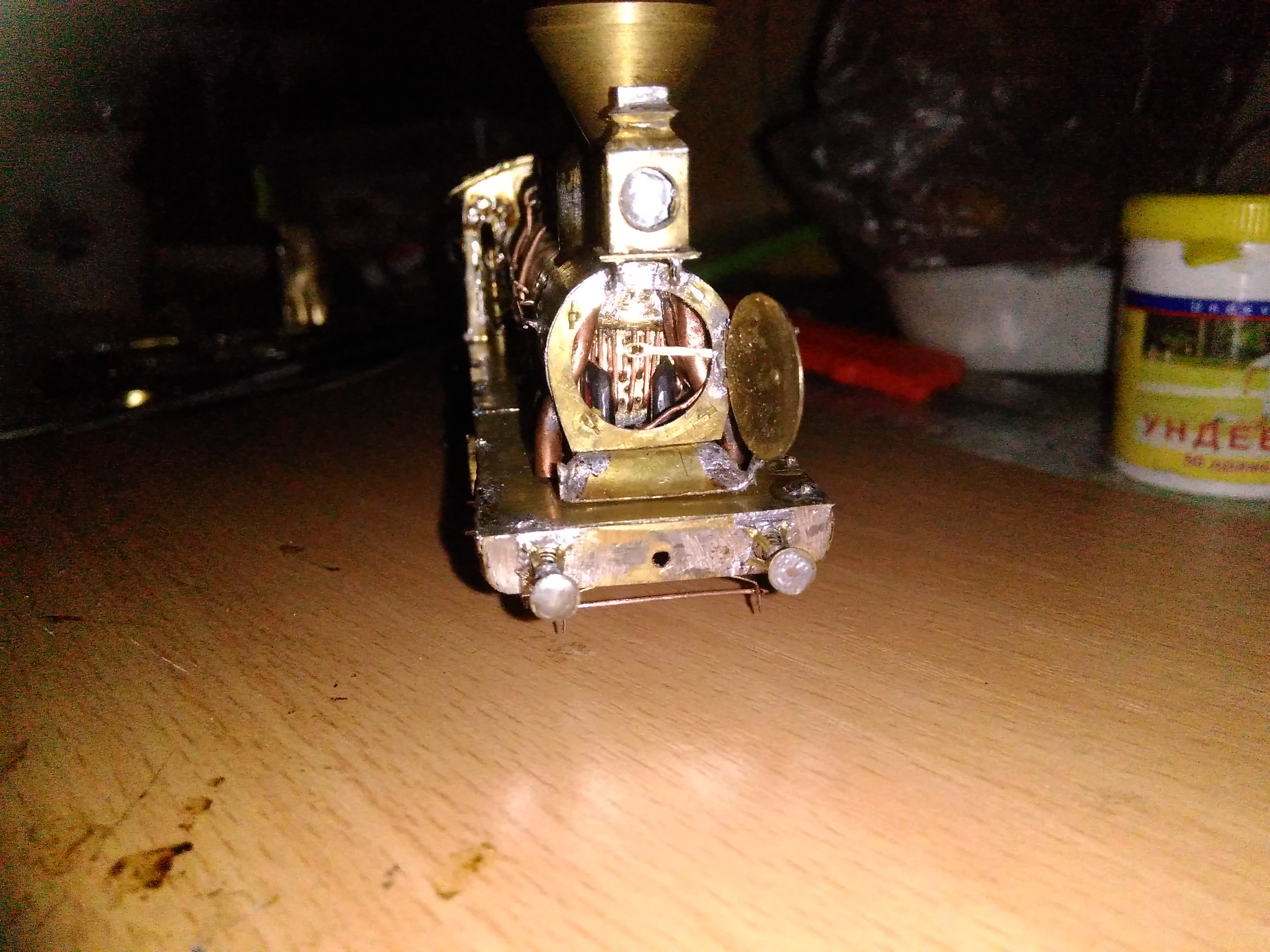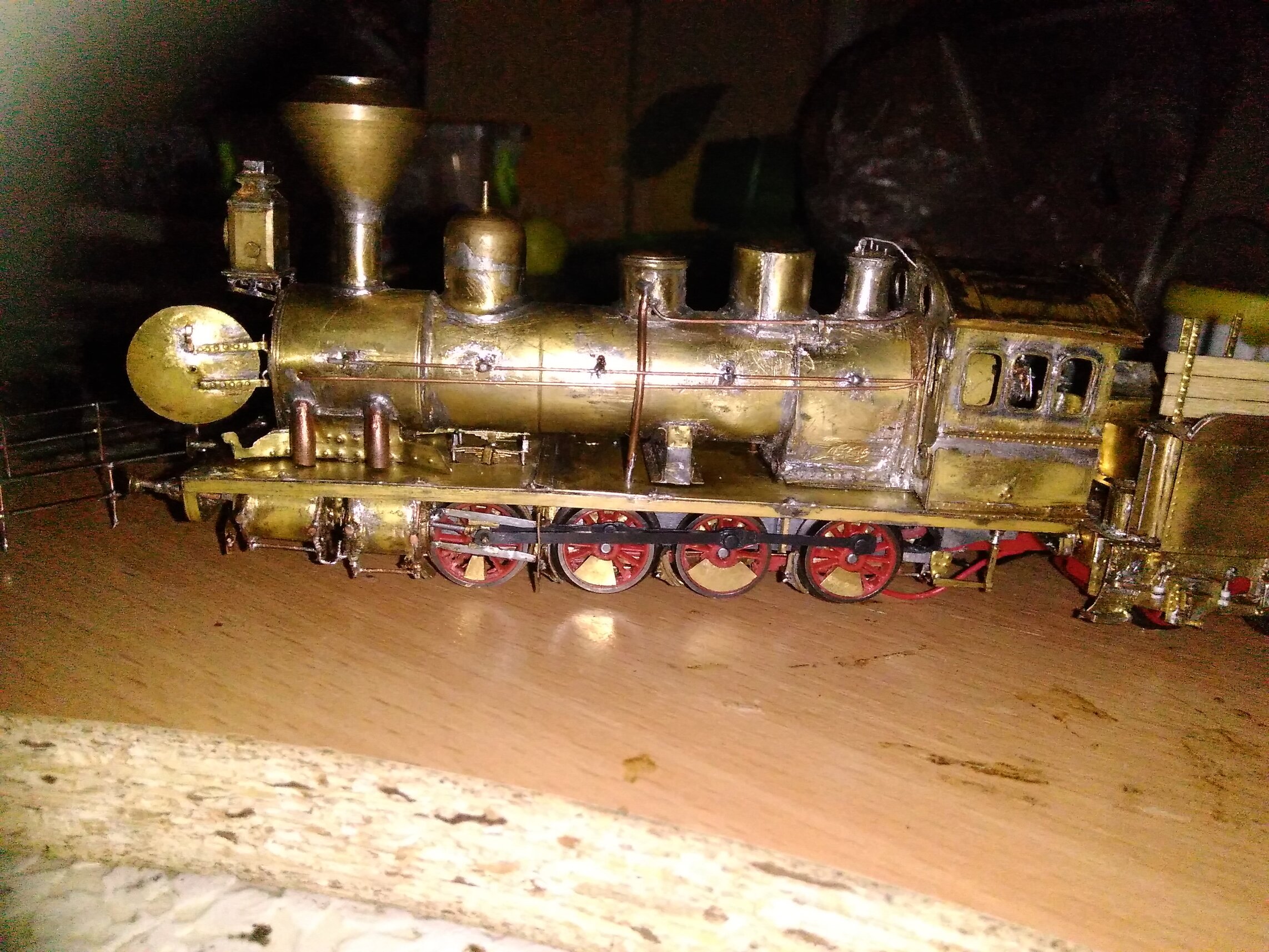 Модель обкатана на радиусах овэчки, пардон не сильно разбираюсь Р2-3 хз., устранены замыкания и прочие моменты. Особенно с ребордой передней пары колес, пришлось немного уменьшить. Давным давно сделана дымовая коробка, открывается поворотом вентилей. Долго не хотел фоткать, пока грязновата да и олово еще остались следы, хотя толщины они почти не имеют. Отдельно лежит деревянный настил и обивка кабины.