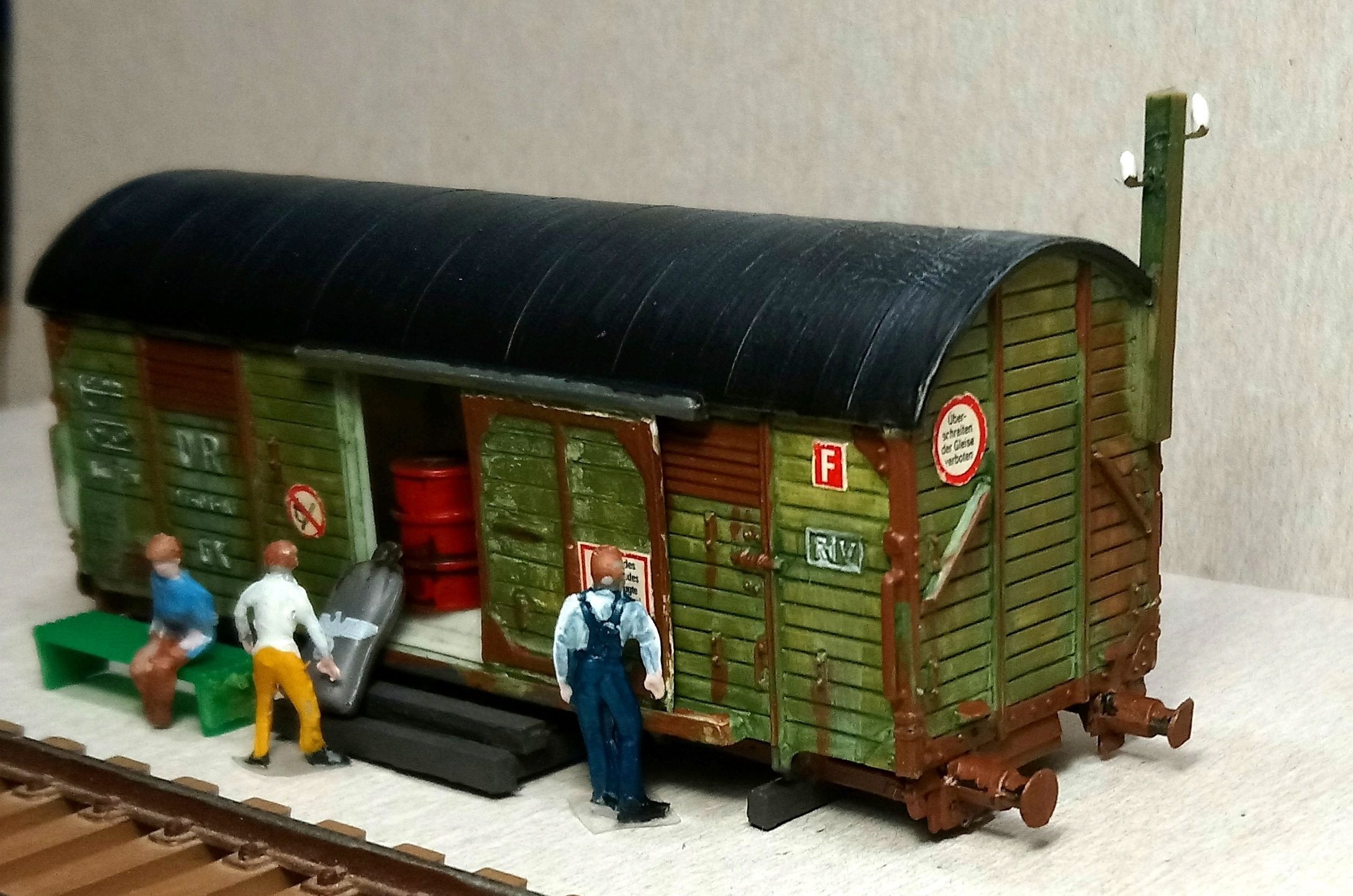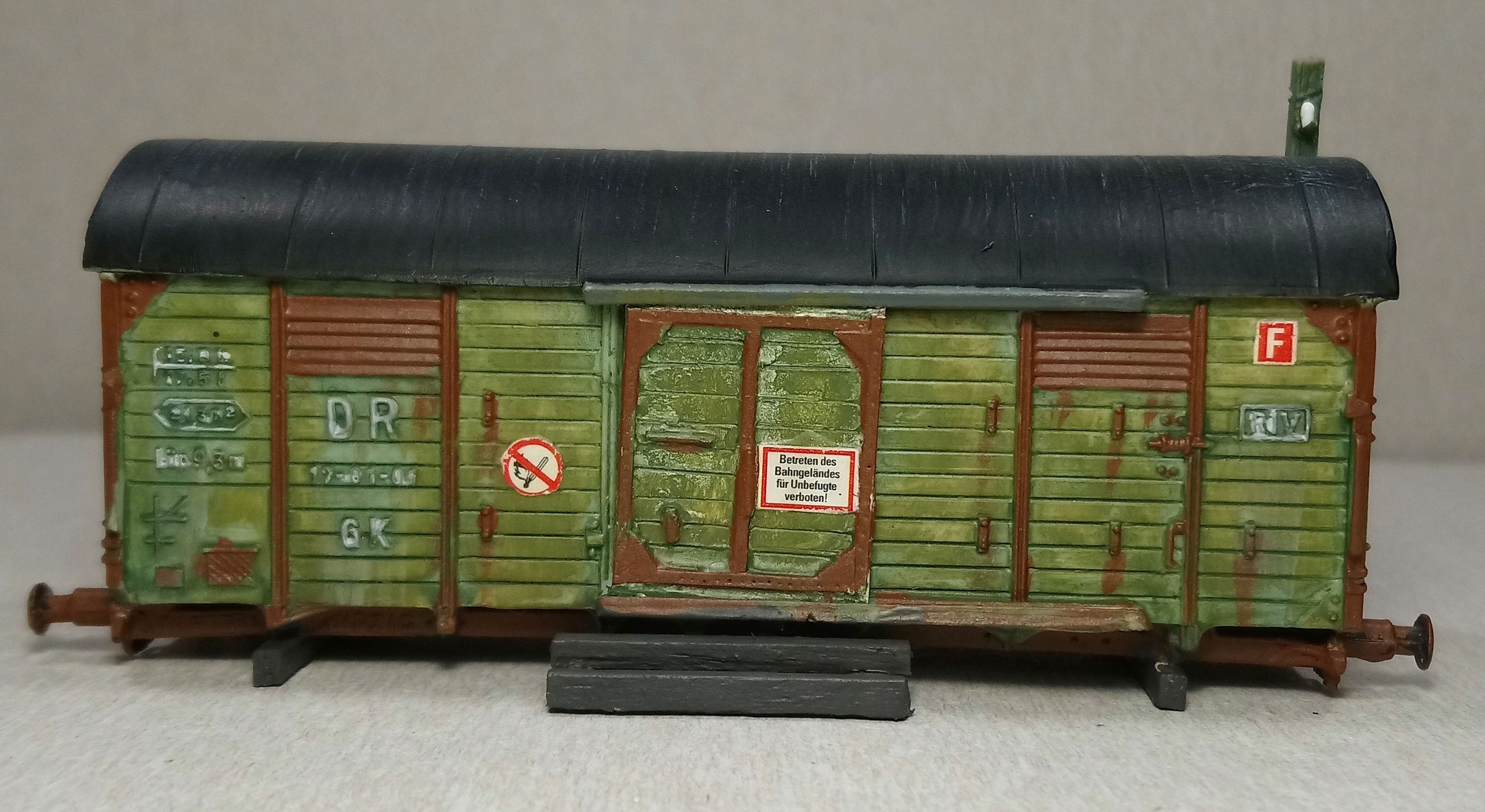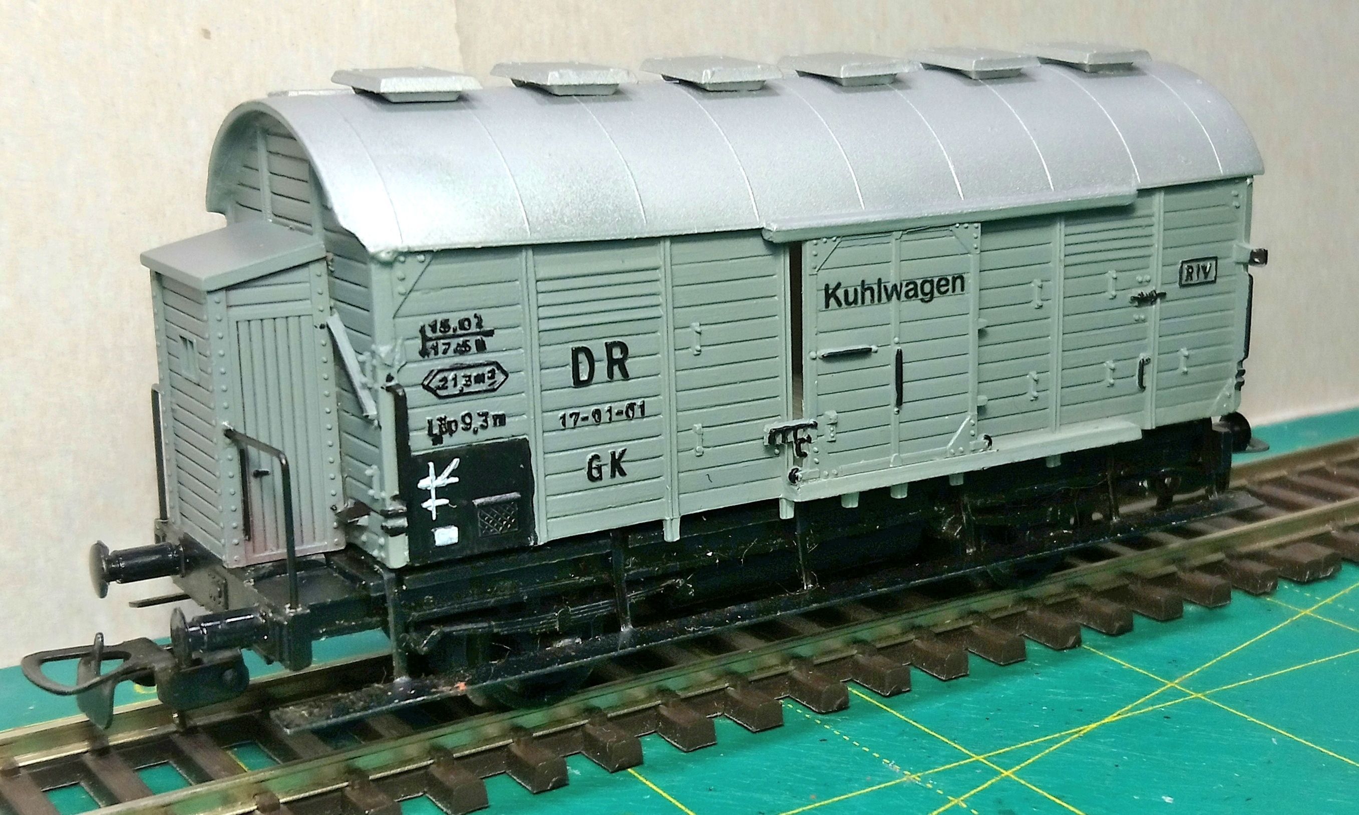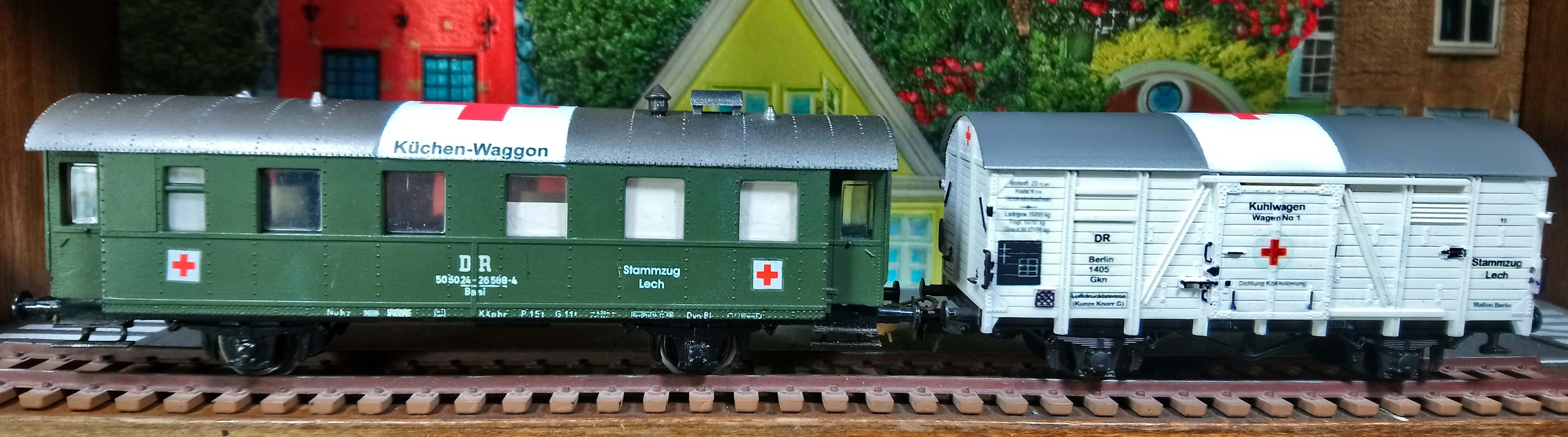 А ось у вагону із надписом "вагон-кухня" (Берлін) конструкція дуже схожа на ті самі вантажні вагони, що були пристосовані для "вантажів із коротким терміном зберігання" та будувалися після війни. Щодо типу саме цього вагону нічого на скажу, ані типу, ані періоду, коли вони з'явилися, адже чеській варіант був трохи інший і стовідсотково після минулої війни, але конструктивно він дуже схожий, тобто вагон, ймовірно, того ж класу та для таких саме вантажів. А саме в чеського вагону один із різновидів виконання був саме вагон-морг. Нажаль, зараз немає фото поблизу.