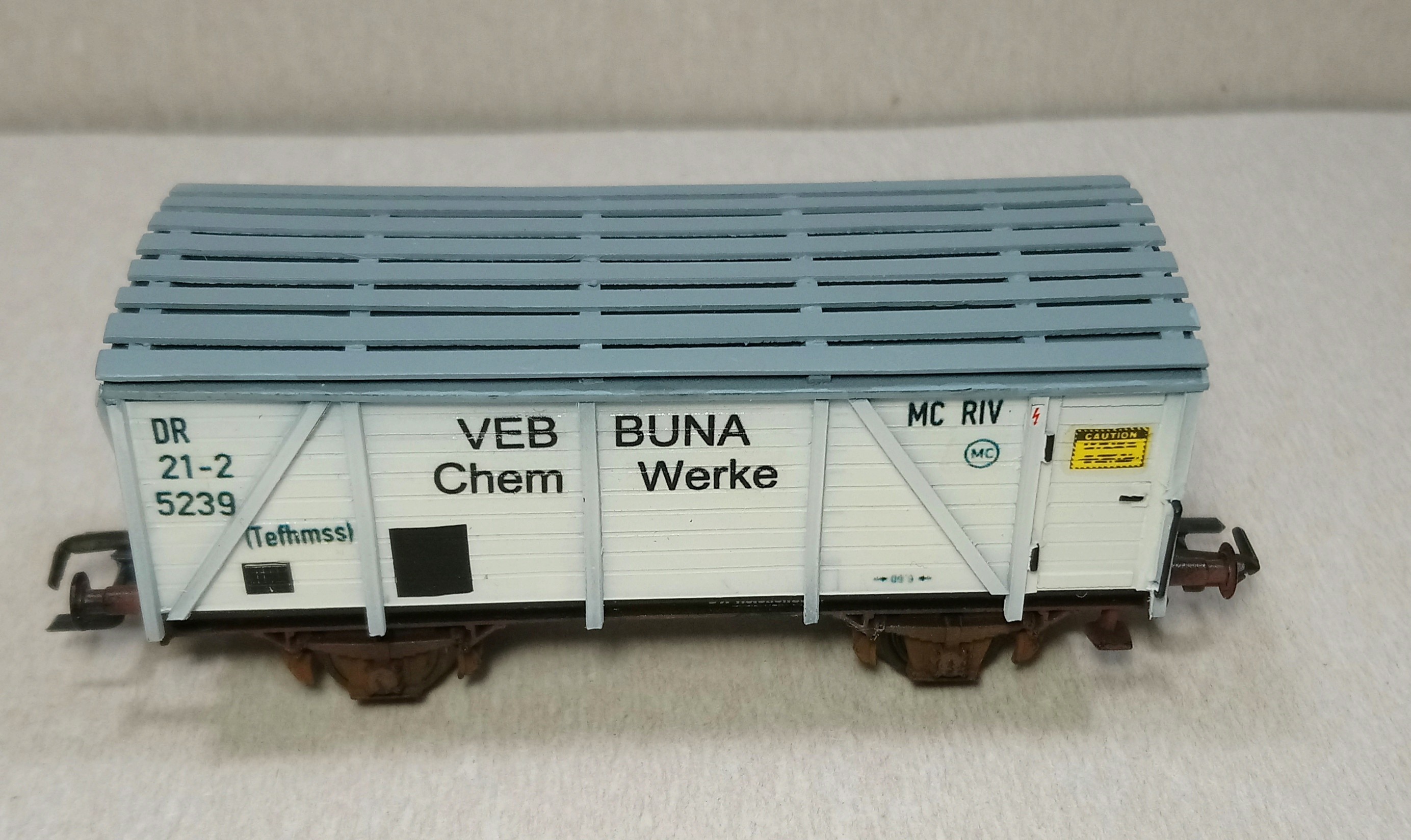 На цей раз ображений виробниками прототип. Так званий німцями "пляшковик". Тобто вагон наповнений ємностями зі зрідженими хімікатами(вуглекислота,водород,тощо).З одного торця він має кілька дверцят для доступу до запорної арматури. Дах з'ємний для заміни ємностей. 8-)Вагони мають багато різновидів.