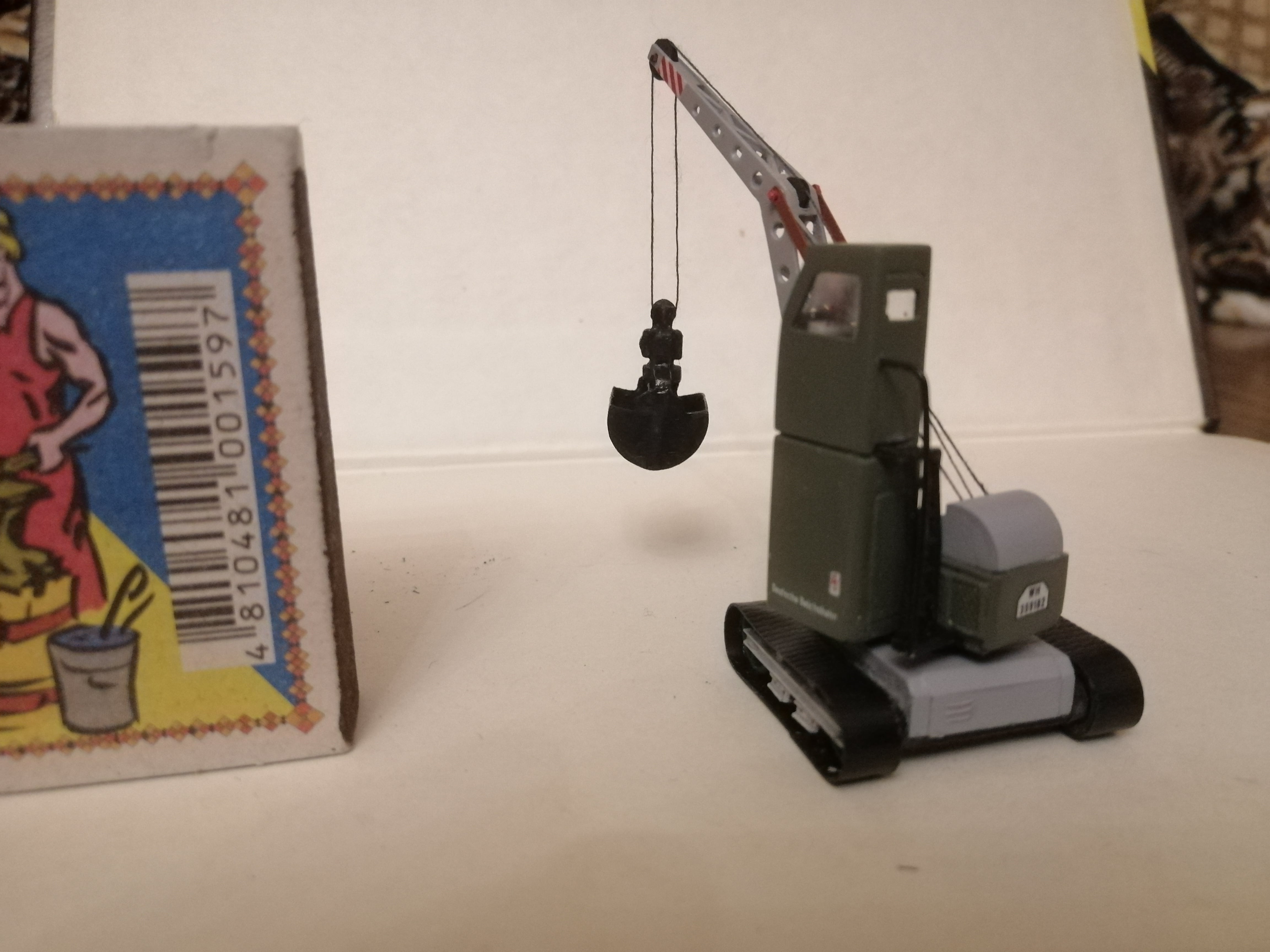 Вибачайте що грейфер трохи фантазійний -3Д принтера не маю тож зробив настільки дозволяли руки. Відповідають лише розміри. Поки сохла фарба примостачив драбину з поручнем . Ну і посватав ходову з поворотним верхом. Ну і після перекура півгодини колупався з тросами що б підіймалась та оускалась стріла та грейфер. Вийшло таке "чудо-юдо".