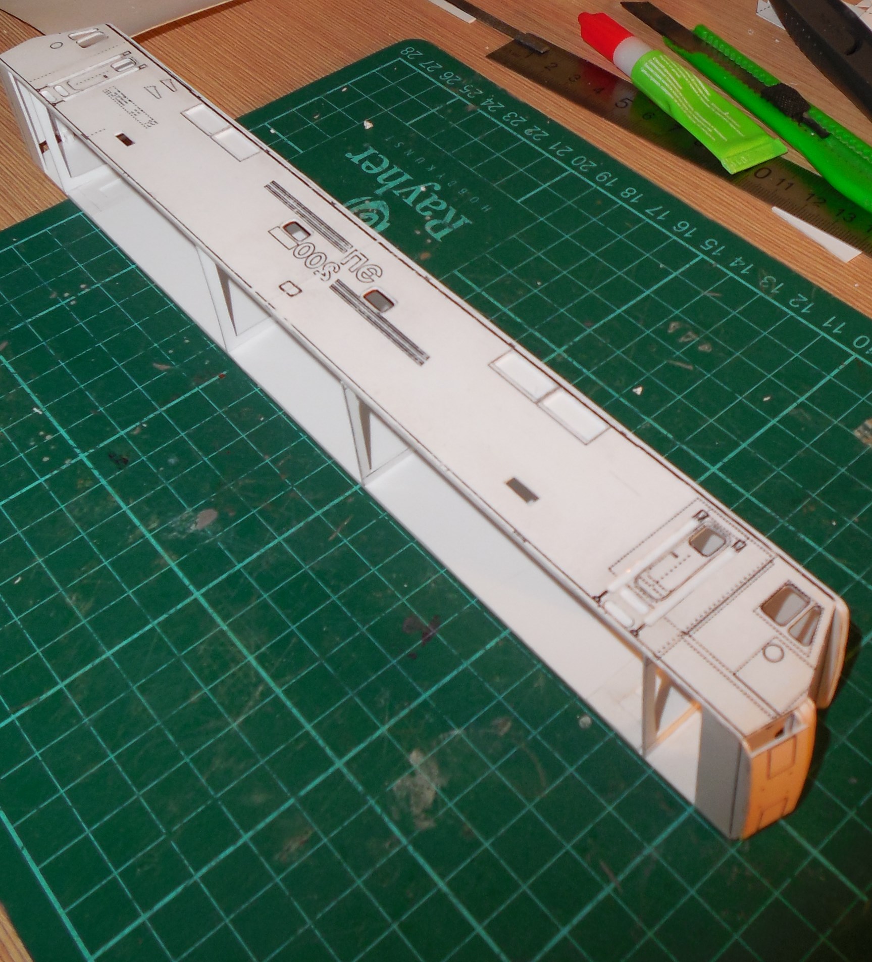 А вот по углам крыши я не стал изощряться и вклеил туда слоеные пироги из кусочков пластика по высоте крыши и обточил напильником выводя всю общую геометрию и зачищая стыки по всему кузову, както так :)