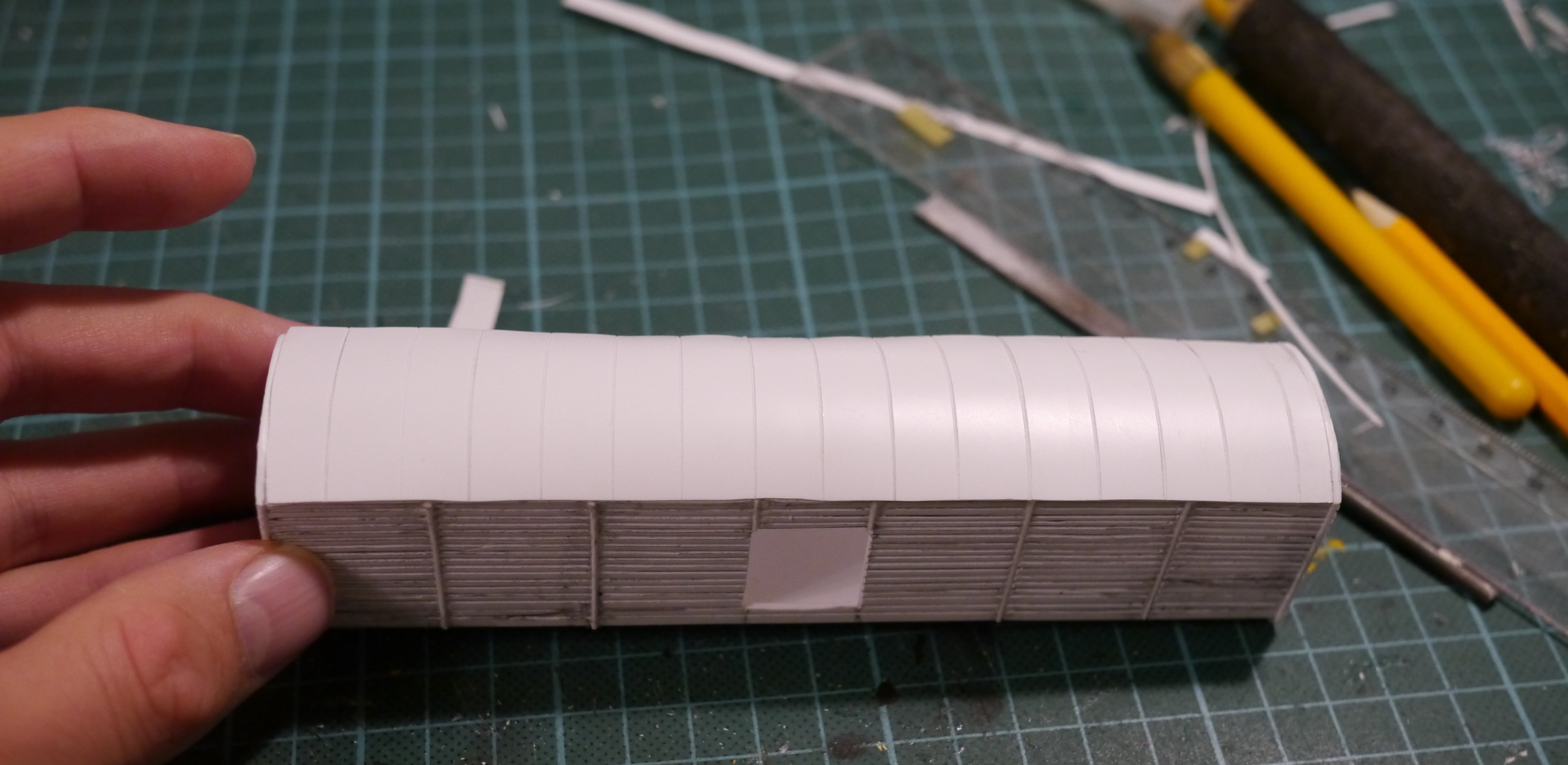 Итак, вырезаю крышевую деталь (с предварительно "расшитыми" панелями) и крепко приматываю малярным скотчем к трубке из толстого картона.