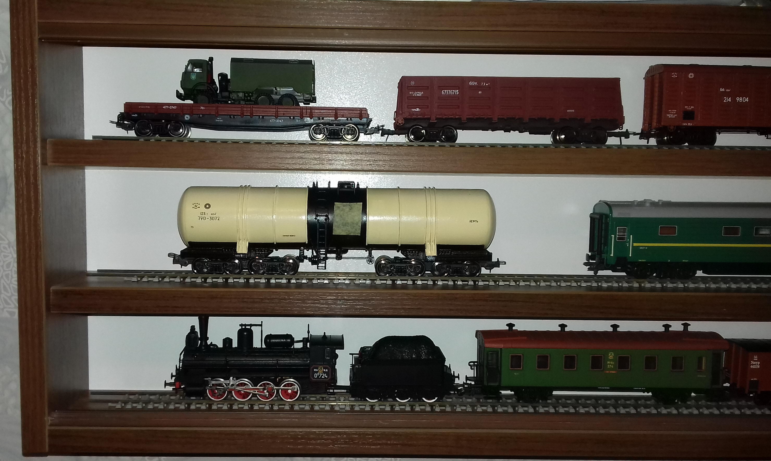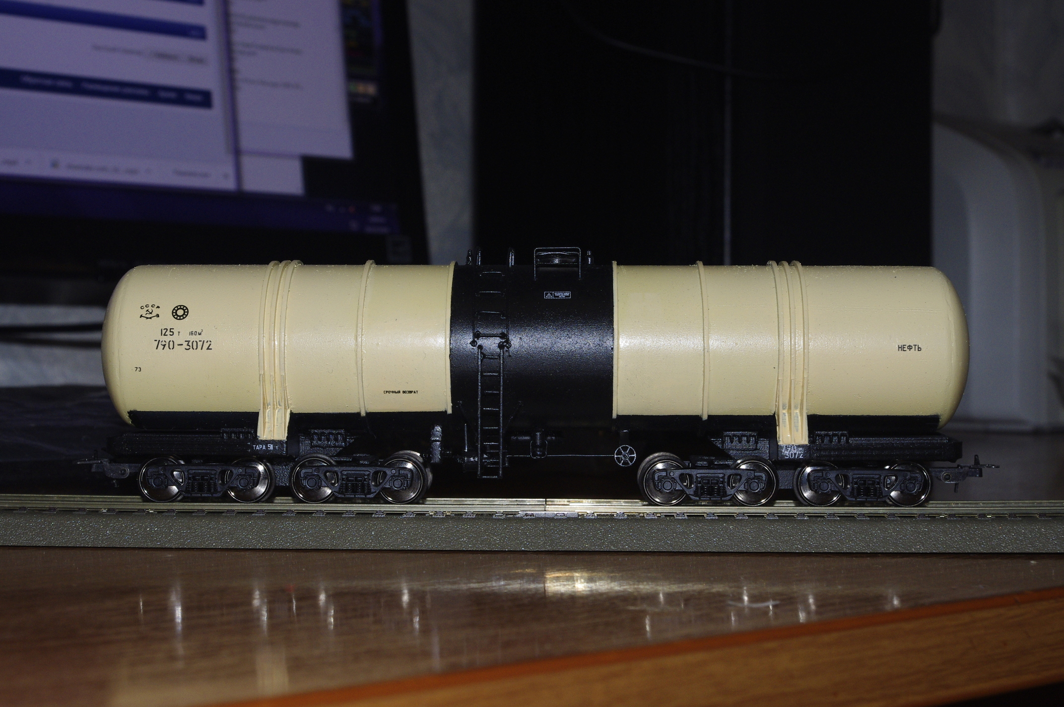 Цистерна 8-осная модели 15-880. Завода "Ждановтяжмаш", экспериментальная, было выпущено всего три штуки в середине 70-х. Предназначалась для БАМа. Ввиду того, что внешний вид и окраску все трех экземпляров с приемлемой точностью восстановить не удалось, решил делать несуществующий серийный образец (если бы эти цистерны пошли в массовое производство). Трехлетнюю историю создания модели с нуля можно увидеть тут: http://kyivmodul.org.ua/forum/viewtopic.php?f=15&t=4168