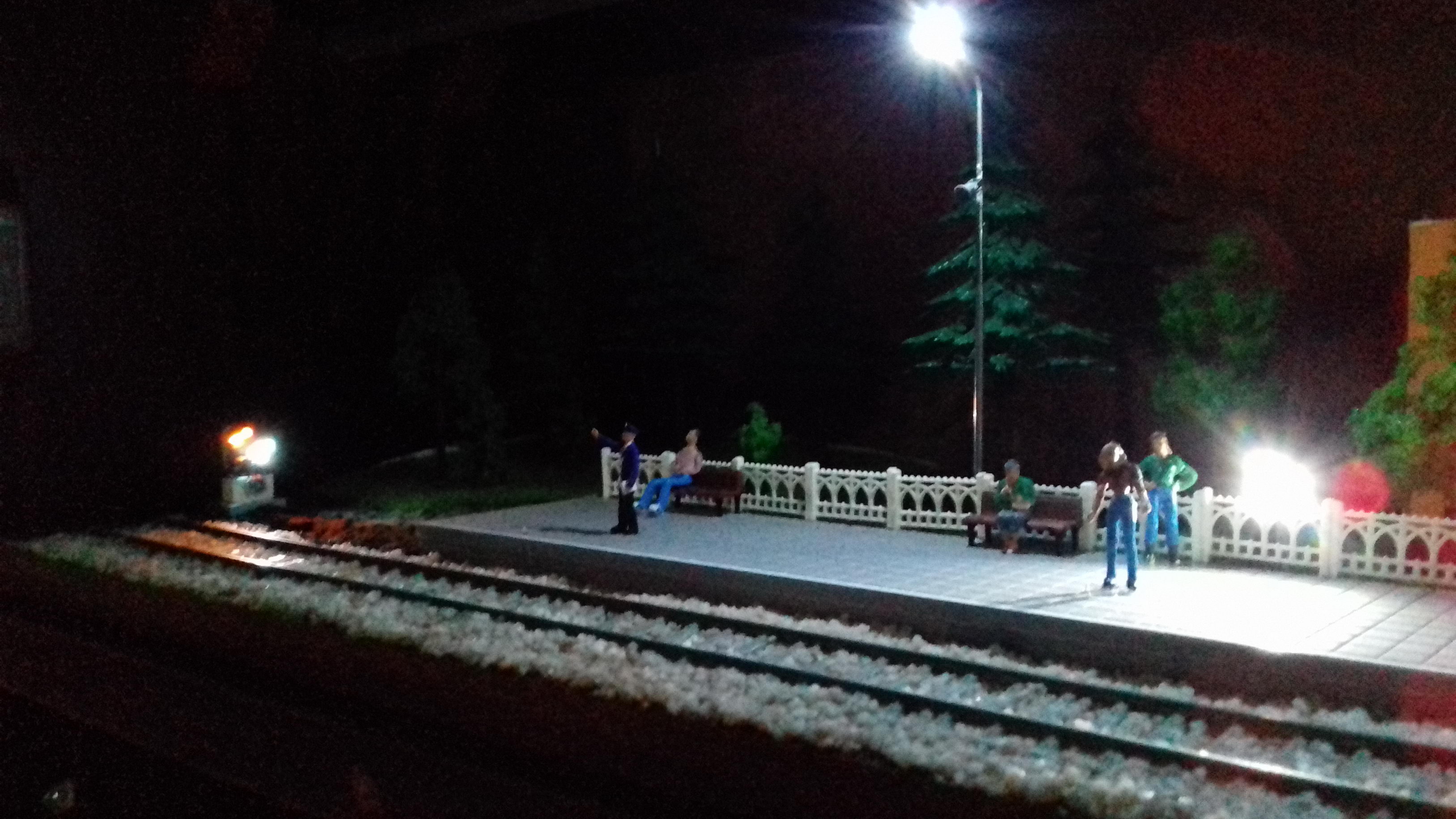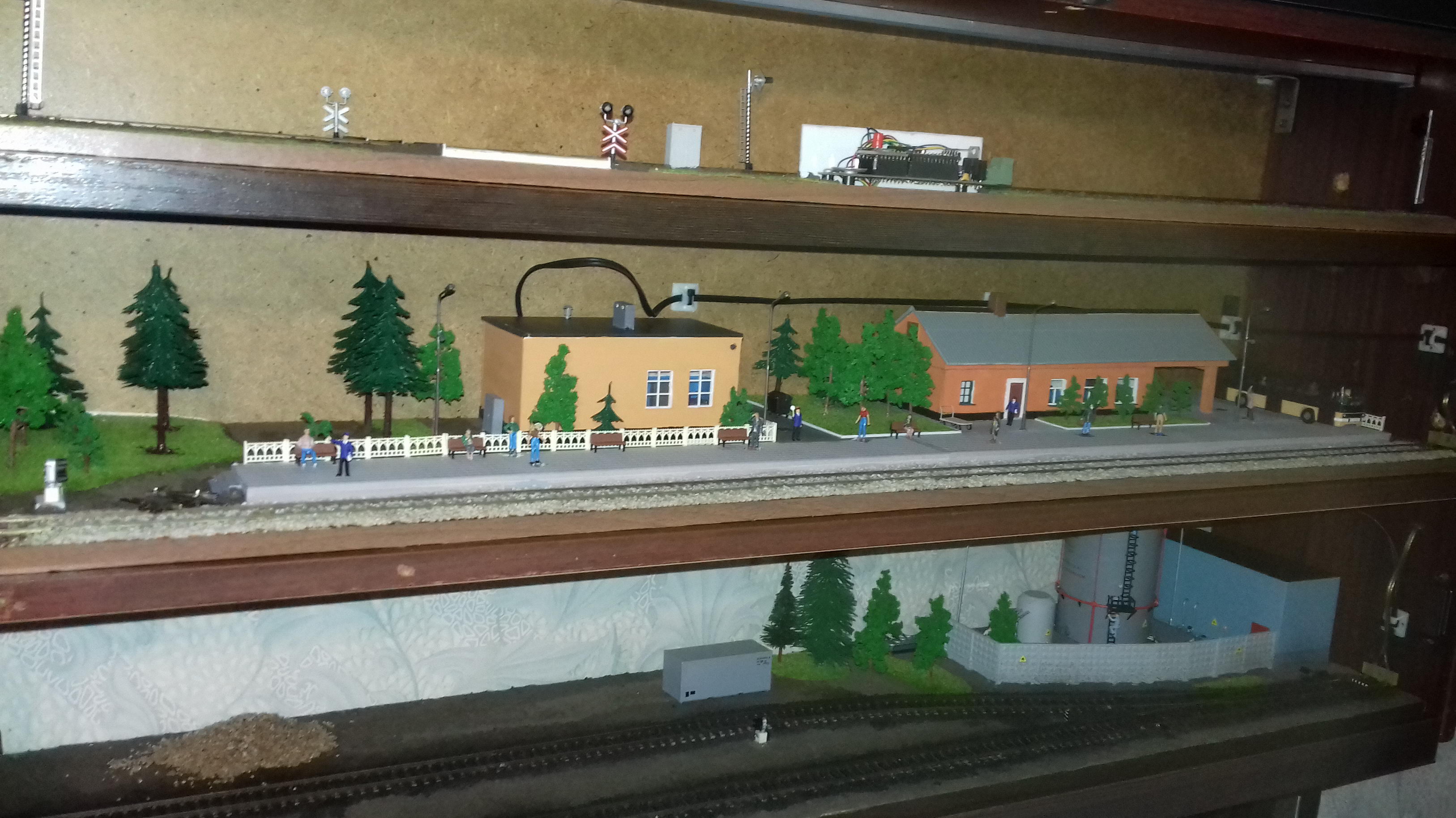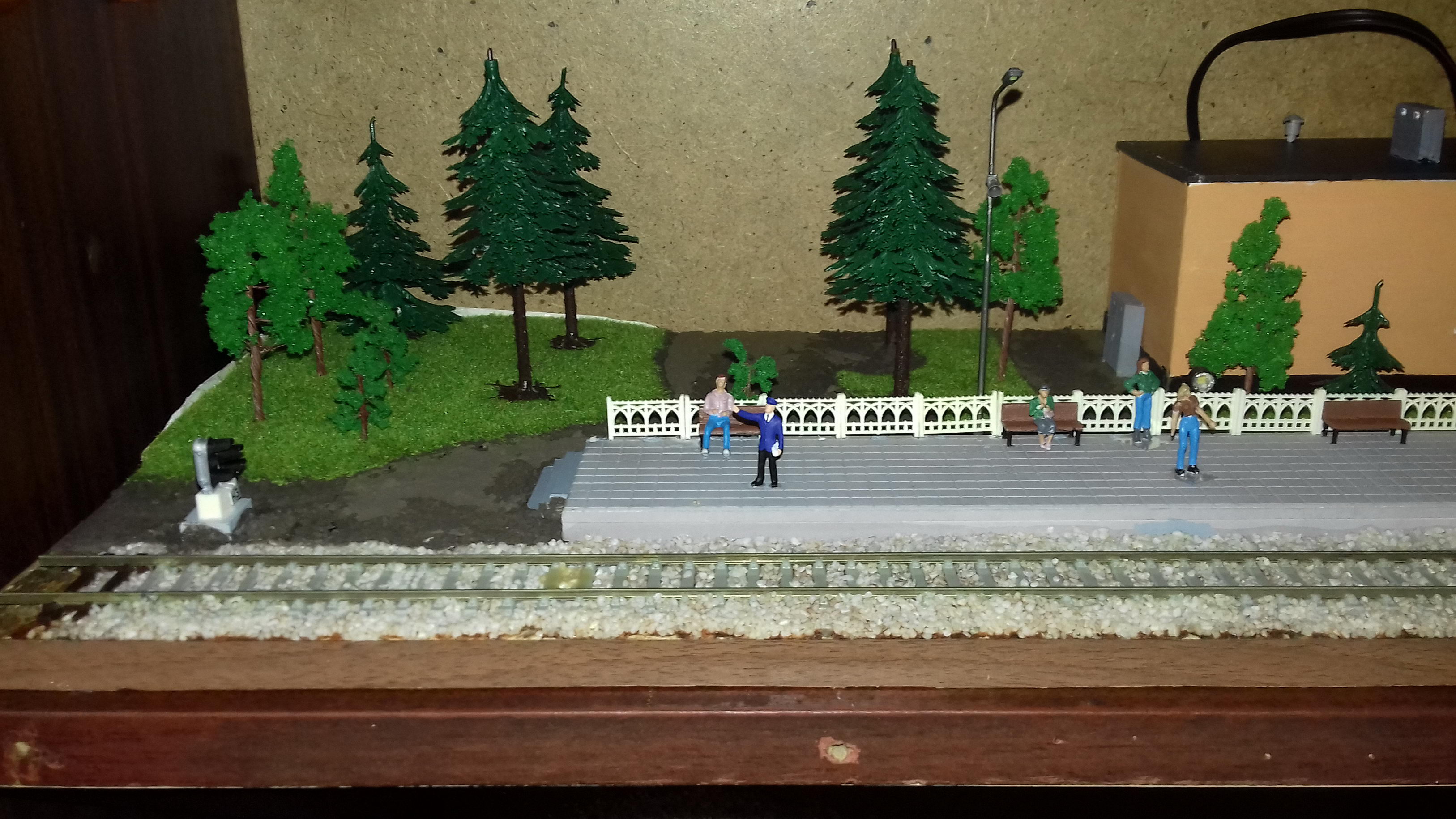Общий вид: Выходной светофор и конец перрона: Пост ЭЦ. За основу взят немного переработанное здание поста ЭЦ станции Одесса-Застава II. Есть интерьер с подсветкой, фигурки ДСП и других работников: Здание вокзала. За основу взято здание вокзала станции Одесса-Восточная. Есть интерьер, подсветка, фигурки: Светофор и подстветка управляются 8-канальным DCC декодером на основе функционального декодера от Paco Canada, управление по локомотивному адресу и функциям. 4-канала - аспекты светофора, еще 4 - освещение перрона, прожектор осмотра состава на ходу, освещение поста ЭЦ, освещение здания вокзала.