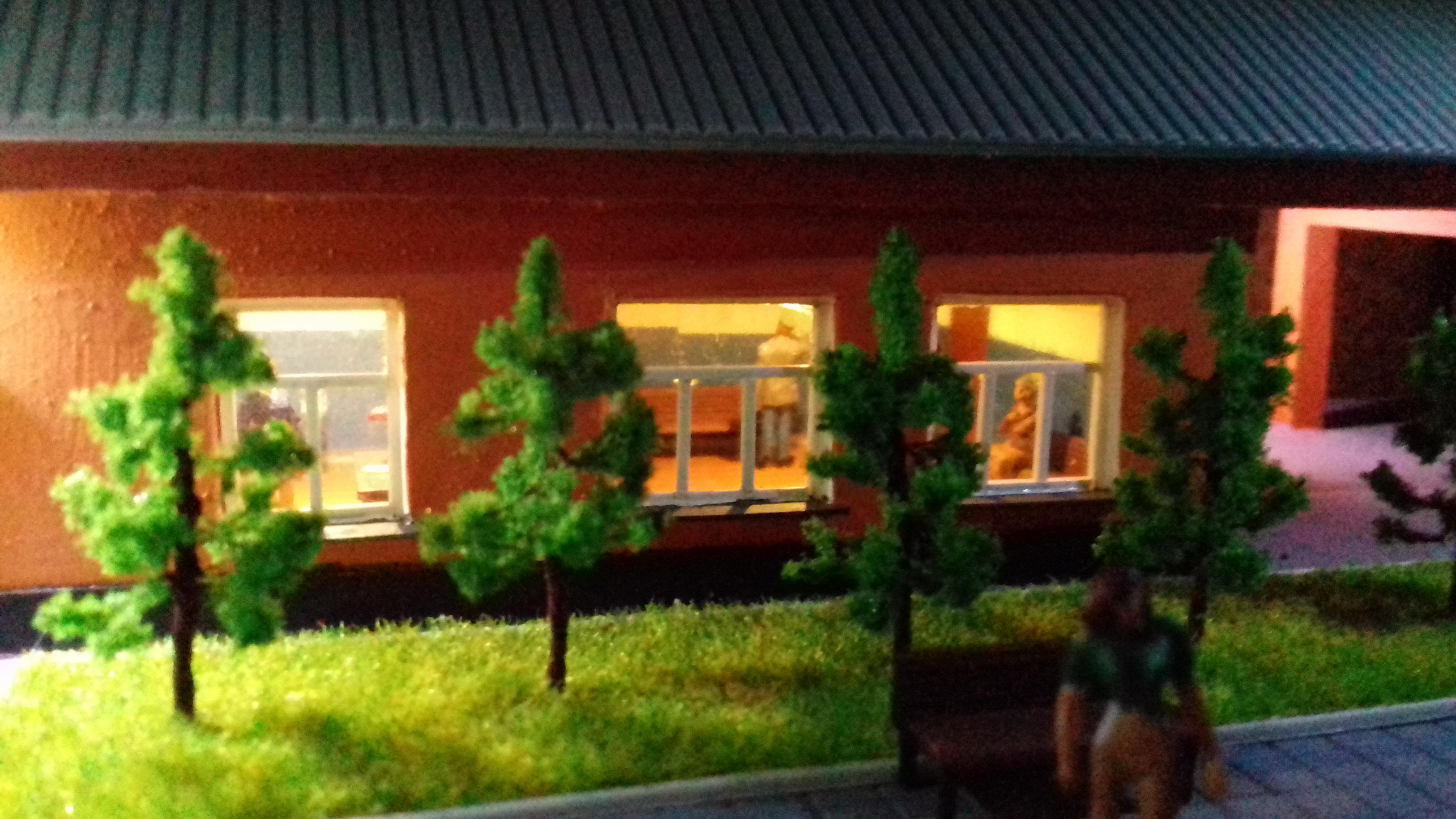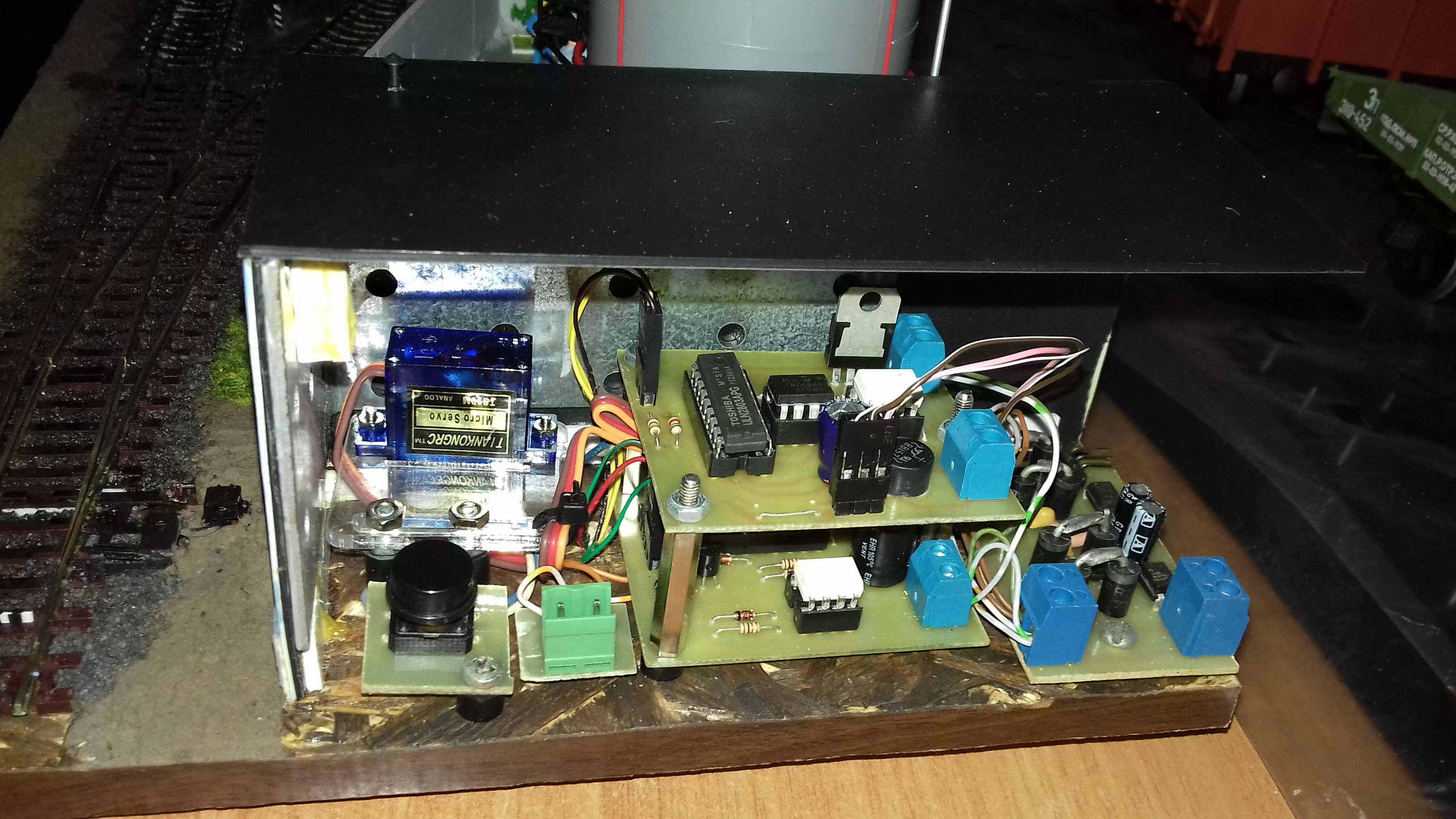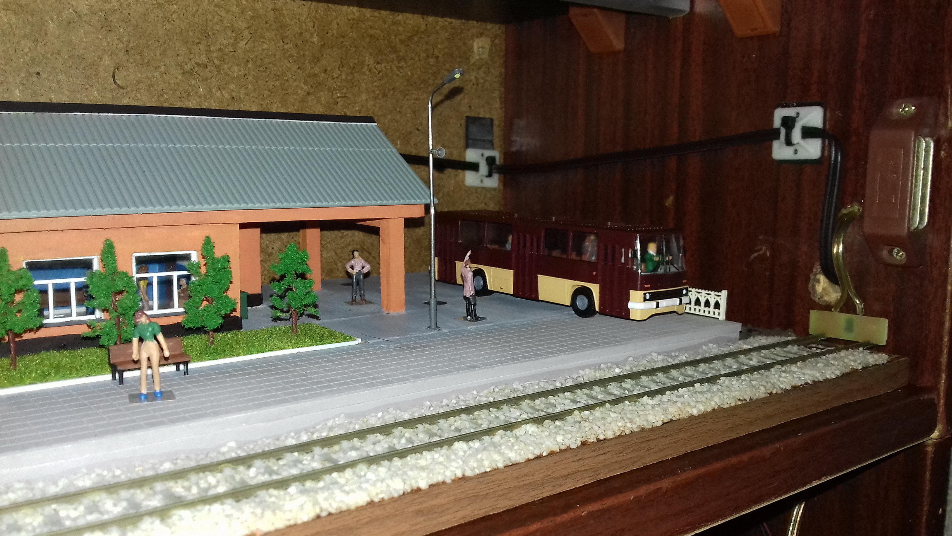 Общий вид: Выходной светофор и конец перрона: Пост ЭЦ. За основу взят немного переработанное здание поста ЭЦ станции Одесса-Застава II. Есть интерьер с подсветкой, фигурки ДСП и других работников: Здание вокзала. За основу взято здание вокзала станции Одесса-Восточная. Есть интерьер, подсветка, фигурки: Светофор и подстветка управляются 8-канальным DCC декодером на основе функционального декодера от Paco Canada, управление по локомотивному адресу и функциям. 4-канала - аспекты светофора, еще 4 - освещение перрона, прожектор осмотра состава на ходу, освещение поста ЭЦ, освещение здания вокзала.
