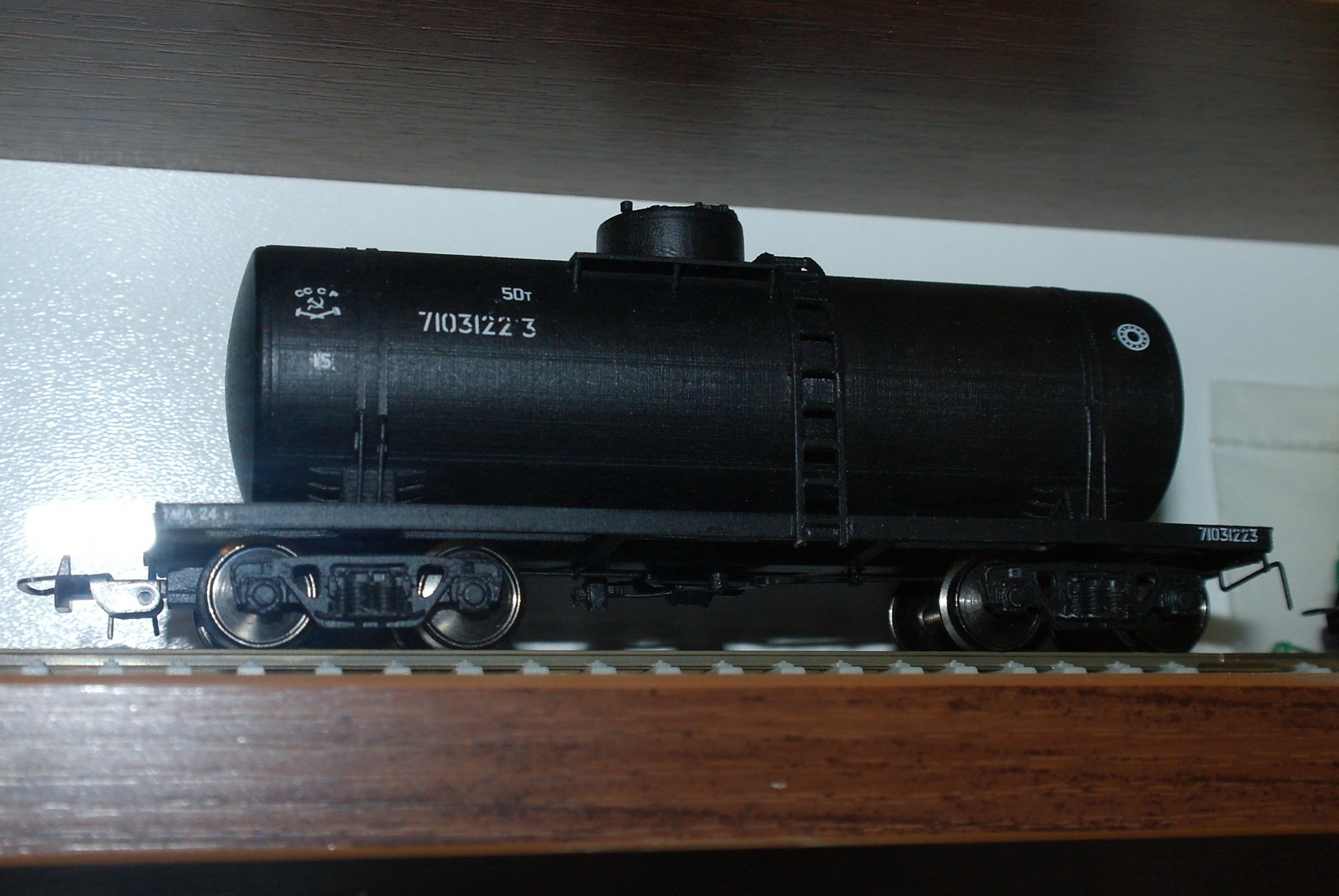 Цистерна 50 тонн, кроме тележек, колпар и проволочной мелочевки полностью выполнена на 3D принтере. За основу взят проект отсюда: https://cults3d.com/en/3d-model/various ... 1-87-1-200, который пришлось доработать. В проекте использована рама облегченной конструкции, которой эти цистерны оборудовались в самом конце своего производства, и которых было выпущено сравнительно мало. Спроектировал более привычную для этих цистерн послевоенную раму с продольными боковыми балками. Желающим повторить модель могу скинуть раму с формате Компас 3D или stl. Несмотря на как можно более высокое качество печати (слой 50 и 100 микрон) и шлифовку, полностью избавиться от "ступенек" от послойной печати не удалось, в следующий раз надо учесть и либо тщательнее поработать шпаклевкой либо использовать выравнивающую грунтовку. По стоимости все, кроме тележек и колпар вышло около 600 грн. в принципе, если изначально ориентироваться на тщательную шпаклевку "ступенек", можно делать более грубую печать, например 200 мкм, что значительно снизит стоимость. Декали наклеены пока не все.