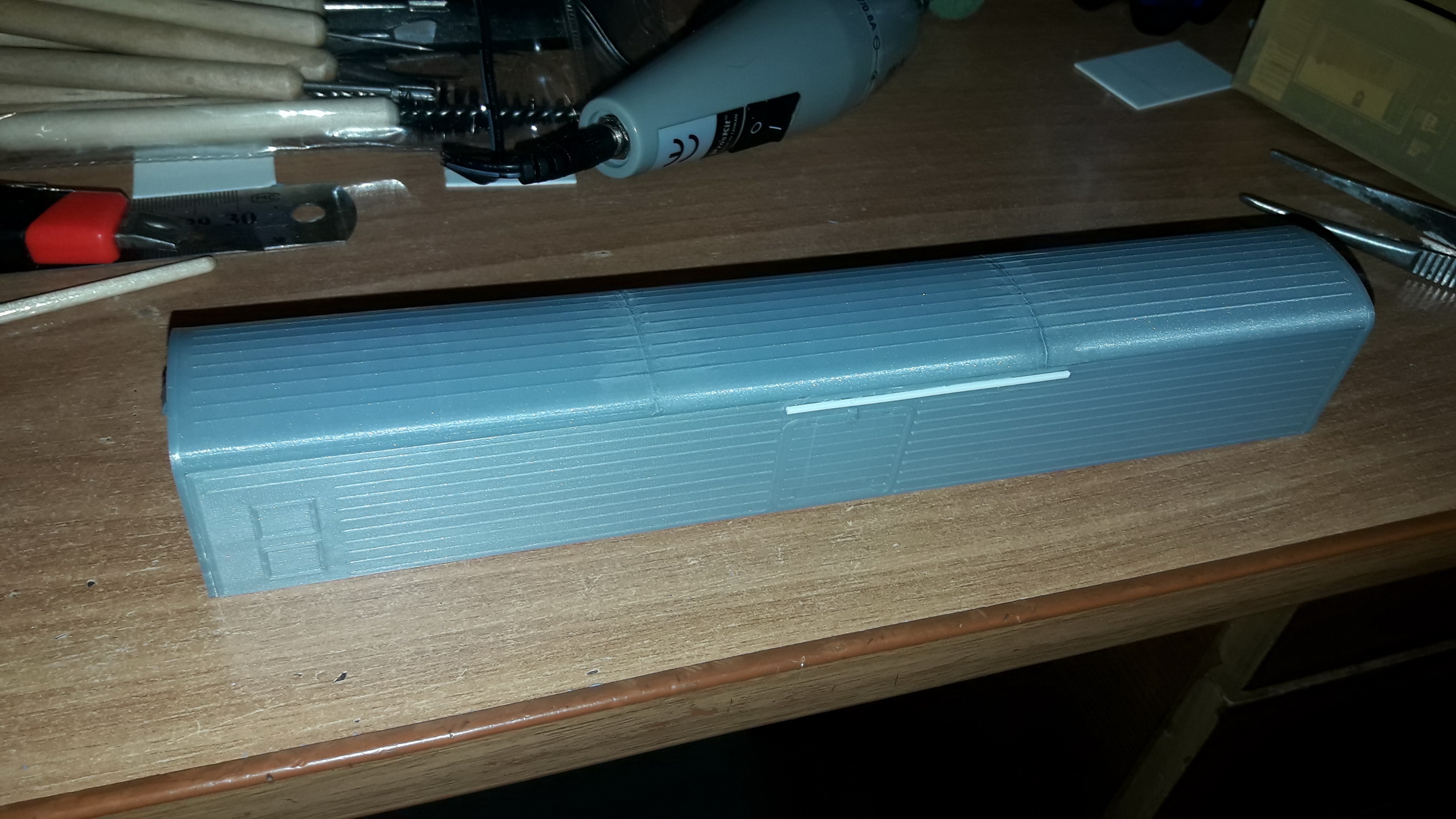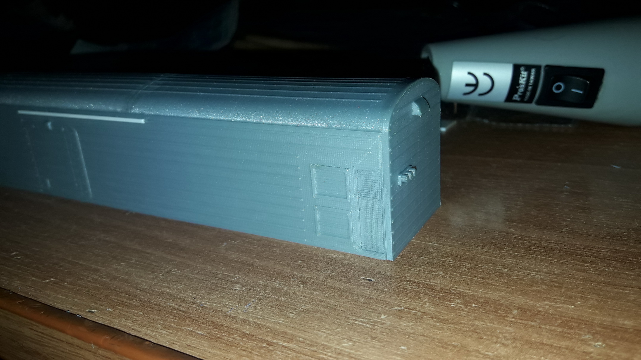 Продолжаю работать с 3д. Начал с нуля, по чертежам и фоткам ваять рефрижератор БМЗ, как более-менее простой с минимумом мелких деталей на корпусе и не требующий интерьера. Делать решил из отдельных деталей, так как при печати кузова целиком наружная поверхность стен (самая заметная то есть) будет печататься снизу вверх, и слои будут весьма заметны. При печати стен отдельно они печатаются лежа, то есть наружная поверхность стен со всеми мелкими элементами (гофрами и т.п.) при печати расположенна сверху, со стороны сопла, и качество при этом заметно лучше. Но все таки не все меня удовлетворило. Например, срезал и сделал по новой из пластикового профиля верхние направляющие грузовых дверей. Дверь машинного помещение тоже, наверное, вырежу и сделаю по новой. К раме пока ещё не приступал, запоры грузовых дверей, скорее всего, буду делать вручную, ибо мелковато для печати. 3д моделями по запросу могу поделиться в формате КОМПАС 3D или STL.
