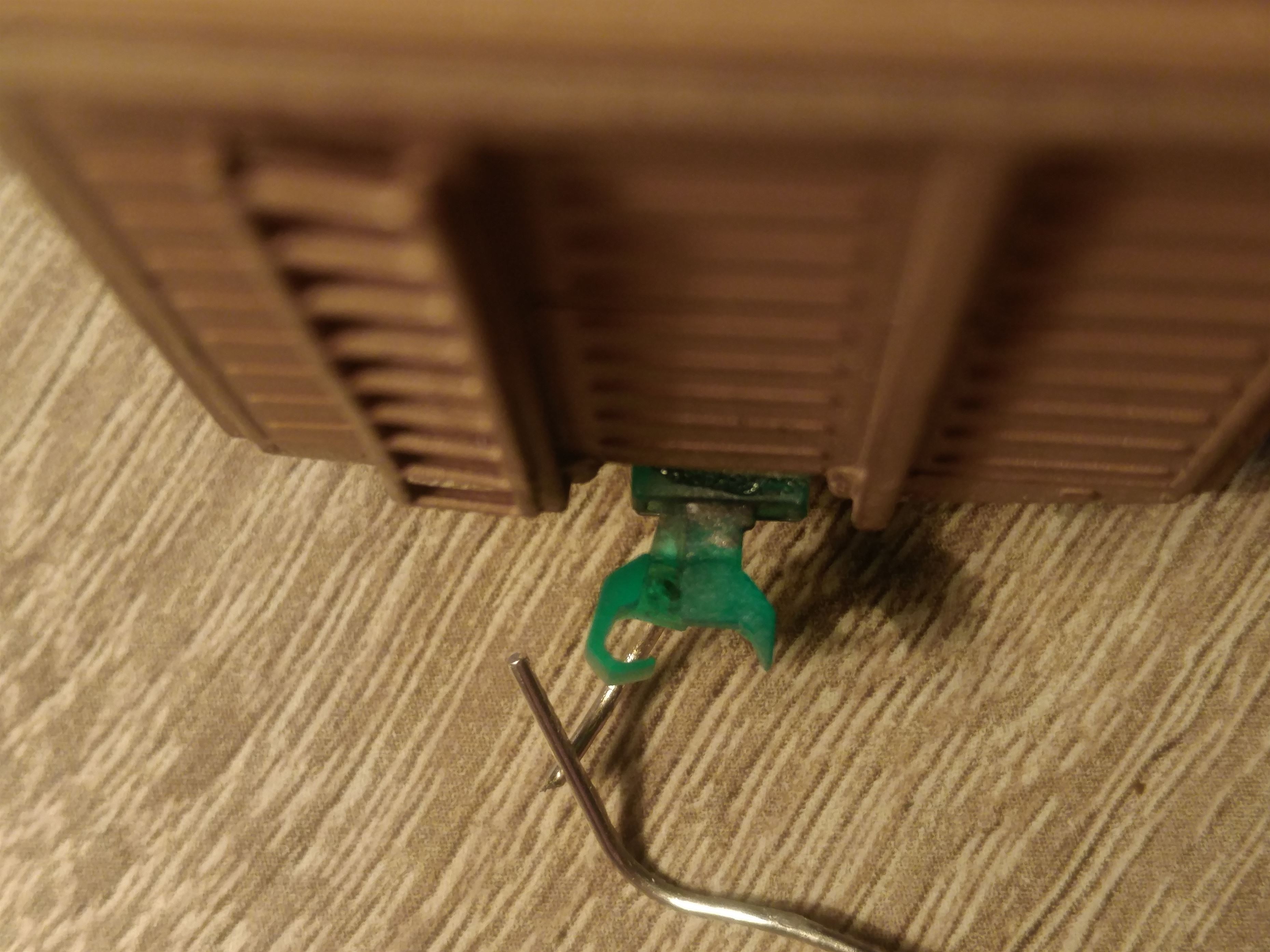 Пытался повторить сцепное устройство от Accurail (аналог Kadee). В целом получилось, но она оказалась не очень долговечной. Фотополимер, который я использовал, оказался жестким и хрупким. Быстро отламываются пластиковые пружинки. Нужно переделывать конструкцию под латунные.