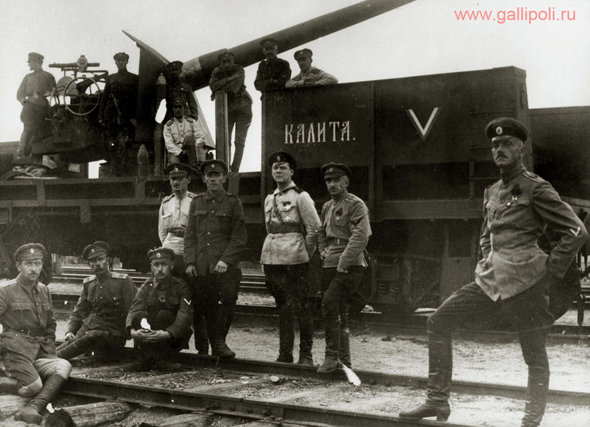"Вооружение: два 105-мм орудия, одно 120-мм и 47-мм пушка. Позднее две повреждённые бронеплощадки заменены новыми, со 152-мм морскими орудиями".