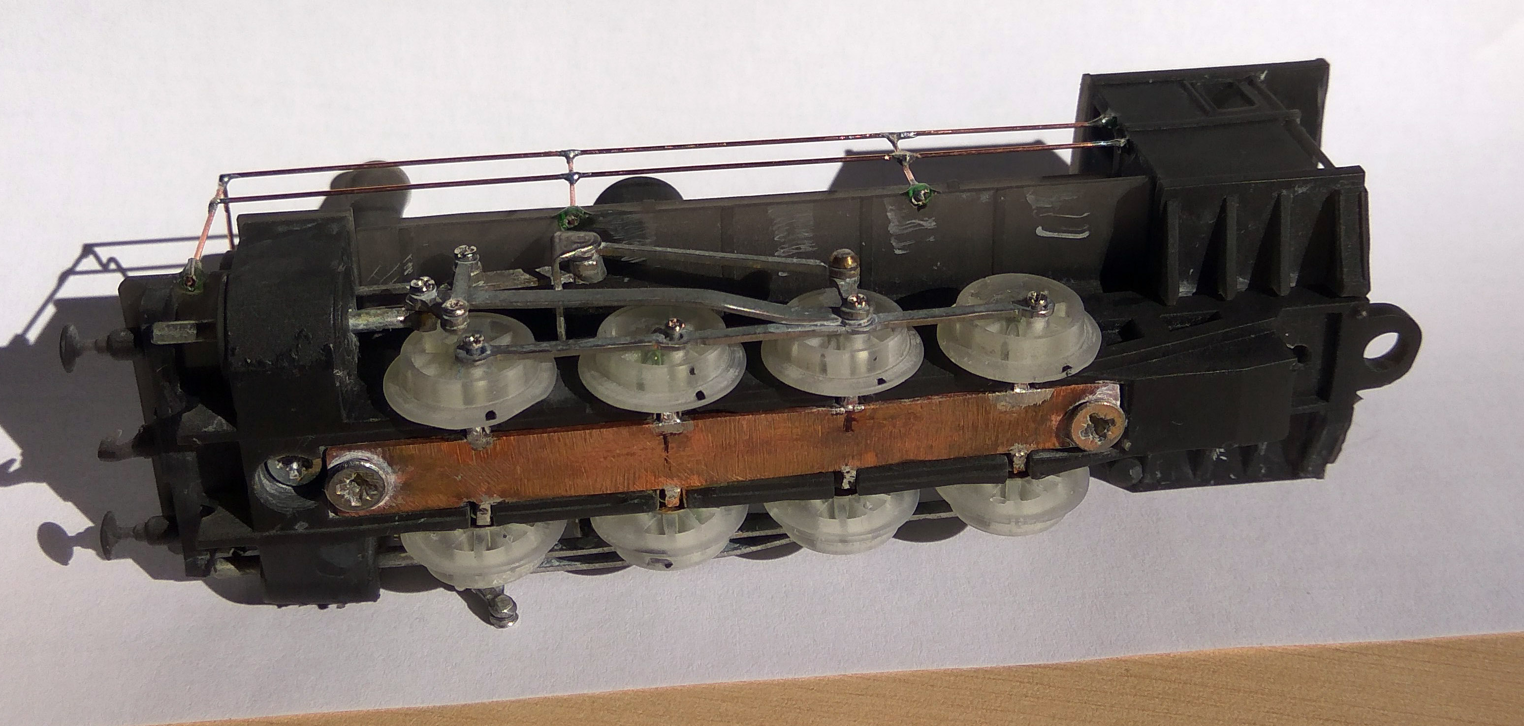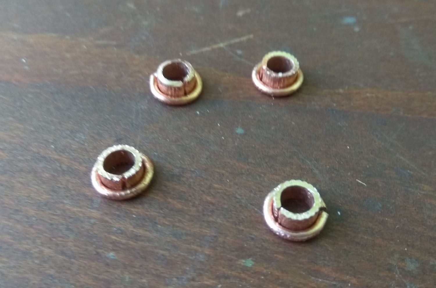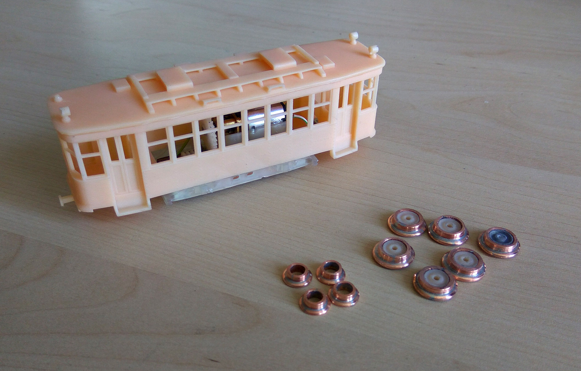 да, колеса сделаны из медного кругляшка напаянного на ось, к которому припаяно кольцо из медной полоски и все вместе обточено в гравере. Потом внутрь вставлю спицевой диск напечатанный из смолы. Они конечно будут непрозрачными (не получалось ровно посадить на центры выточенный обод, часто получались восьмерки разной степени силы), но на маленьких колесах, тем более закрытых рамой это мало заметно. Конечно это не заводские колпары, но я же по-бюджетному делаю. У трамвая они были по другой технологии и в целом он ездит, только покачивается