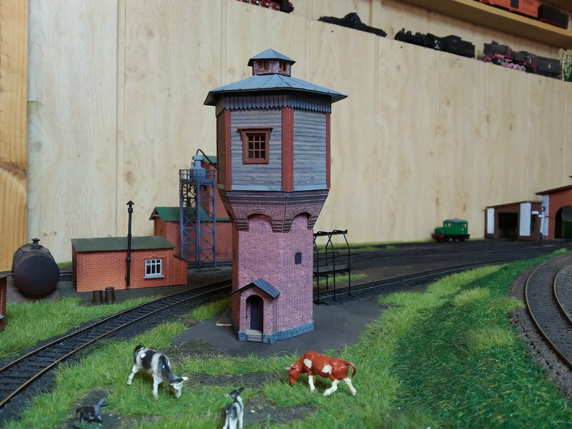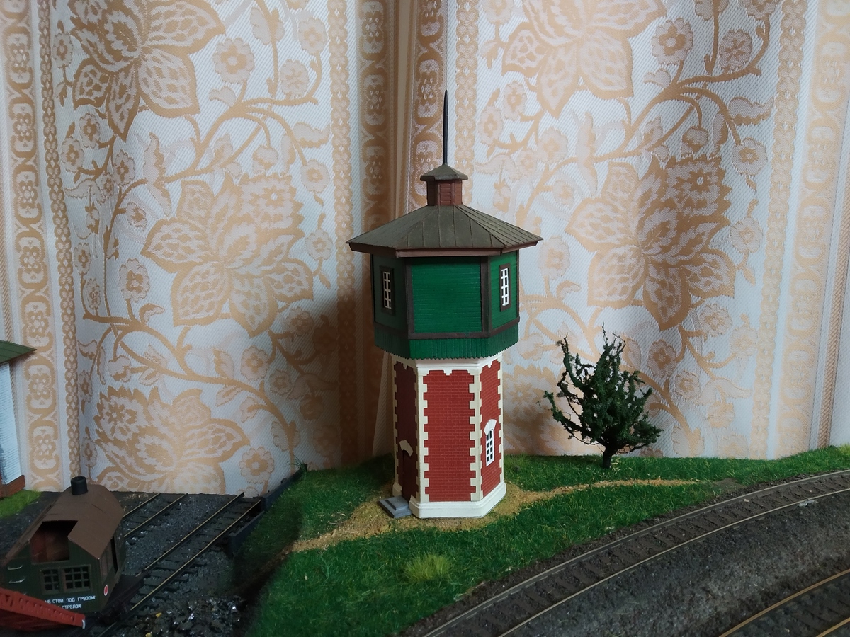 И последнее на сегодня строение, хотя родилось оно лет на 30 пораньше. Картинка в любимом журнале, даже не вполне уверен, что цветная, вот и вся информация на тот момент. Это сейчас я нашел виды в разных проекциях, не говоря о том, что его просто можно было купить до недавнего времени (кажется, сейчас в программе Auhagen'а его нет). Я пошел немного дальше и приделал водопой паровозный, он был сделан еще раньше и, кажется, вписался в тему. Сейчас есть и колонка фирменная и угольная яма, а эта поделка как-то душу греет, что ли...