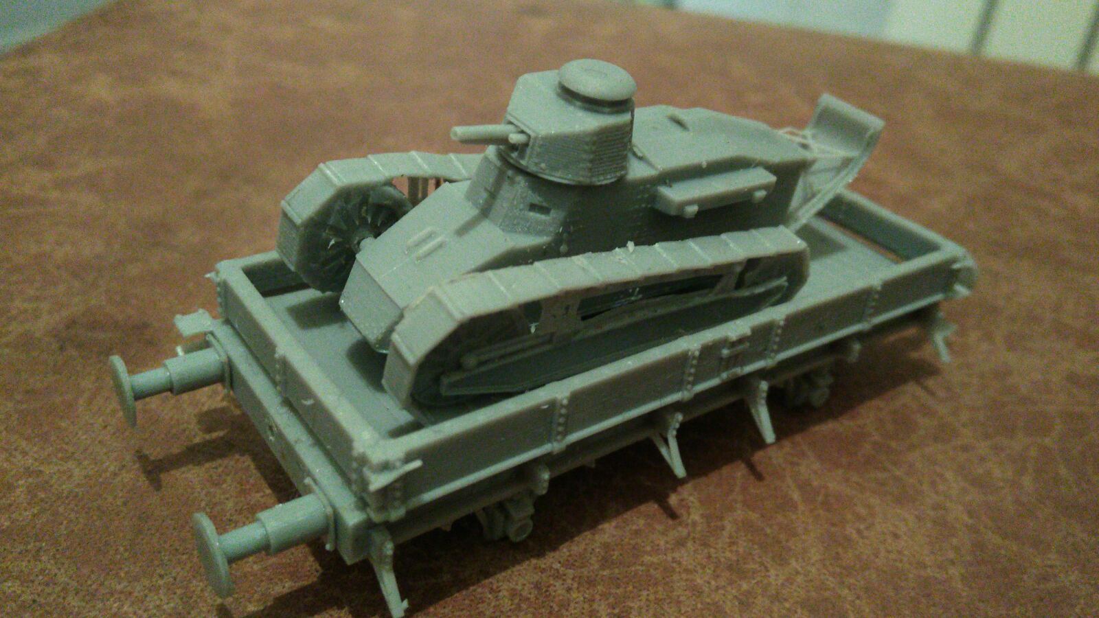 Итак моя собственно первая печать. Решил сделать редкие в наших краях вагоны. Многие видели платформу на известном аукционе. Всему послужили фото немецких составов с танками первой мировой. Аля делается все просто. Берем старый или поломаный танк, ставим на платформу и получаем бронепоезд.