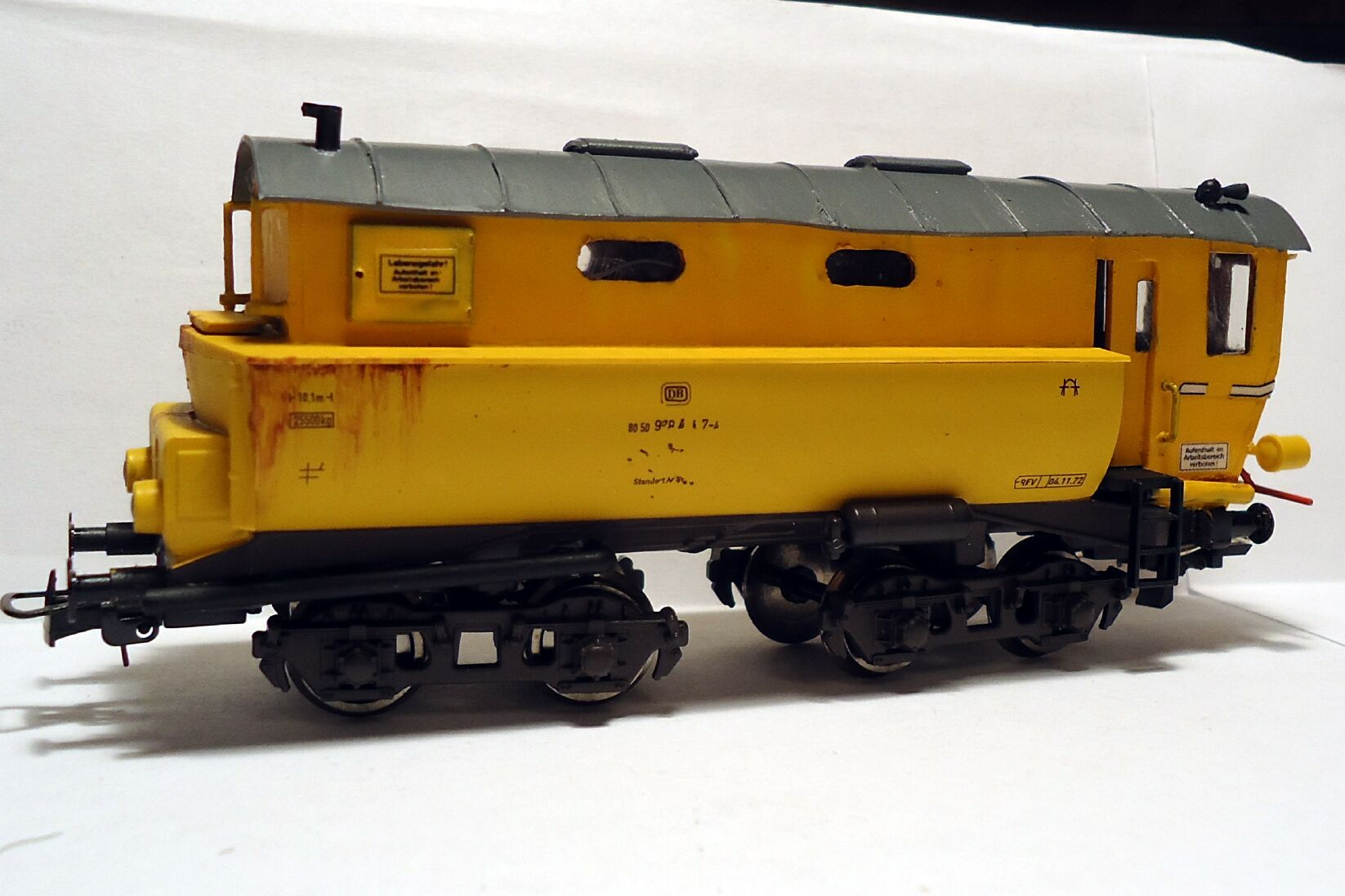 будку. Дверку делаем приоткрытой для фигурки. Дуем,чуть старим(химикаты все таки) и декалируем. Конечный результат на обкатке.Составность может быть произвольная(крытые,цистерны,