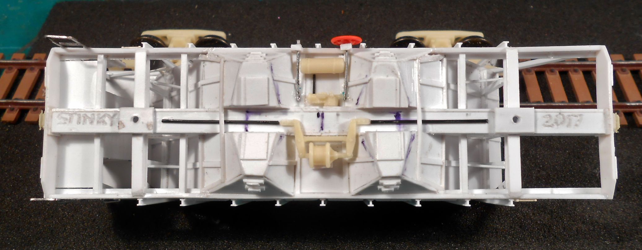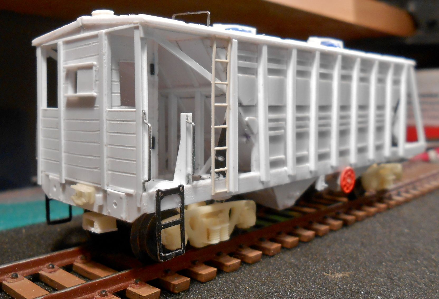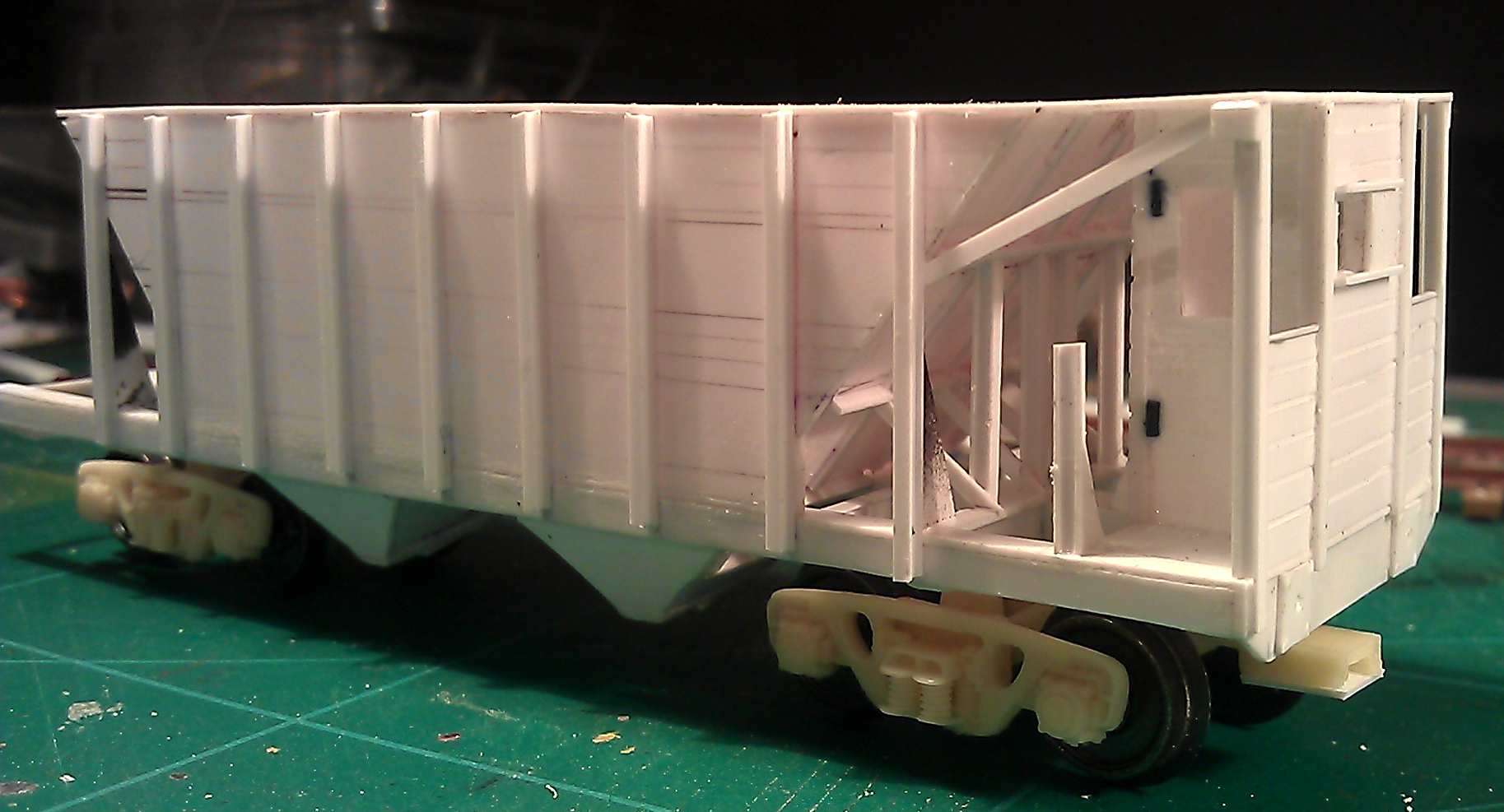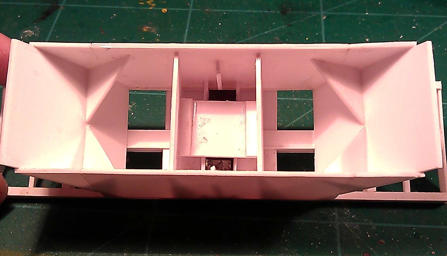 Начало вагона родил как обычно,с рамы.Добавил поперечины,для укрепления и ровности конструкции. Затем начинаю "гнать" кузов.Важно было не промахнуться с углами наклона.Полистирол 1мм.Сложно работать. Важно не забыть отбалластировать модель.Груз (стальной брусок 1 на 1см) надо разместить как можно ниже. Закрепляю кузов и балласт всевозможными распорками.Делаю кузов максимально прочным. Запиливаю разгрузочные люки.Изначально получились не правильной формы.Попппилии они крови.