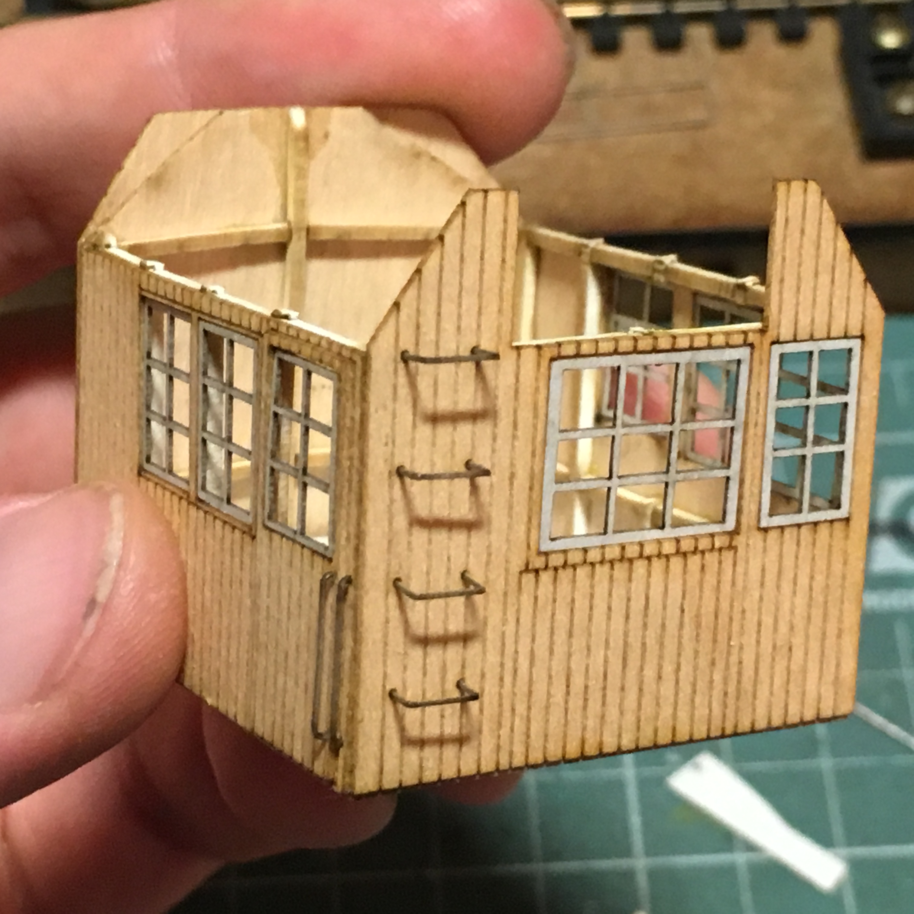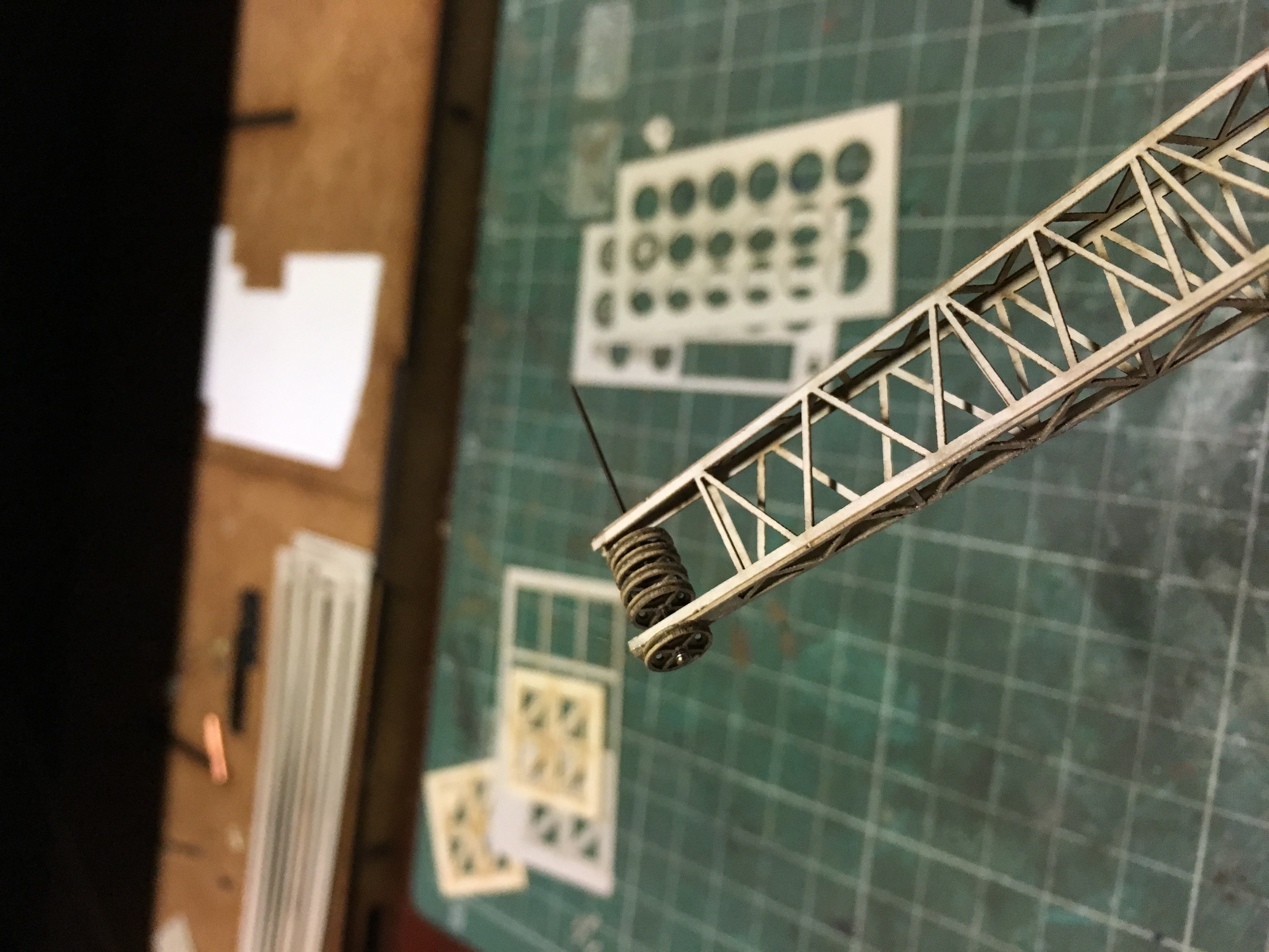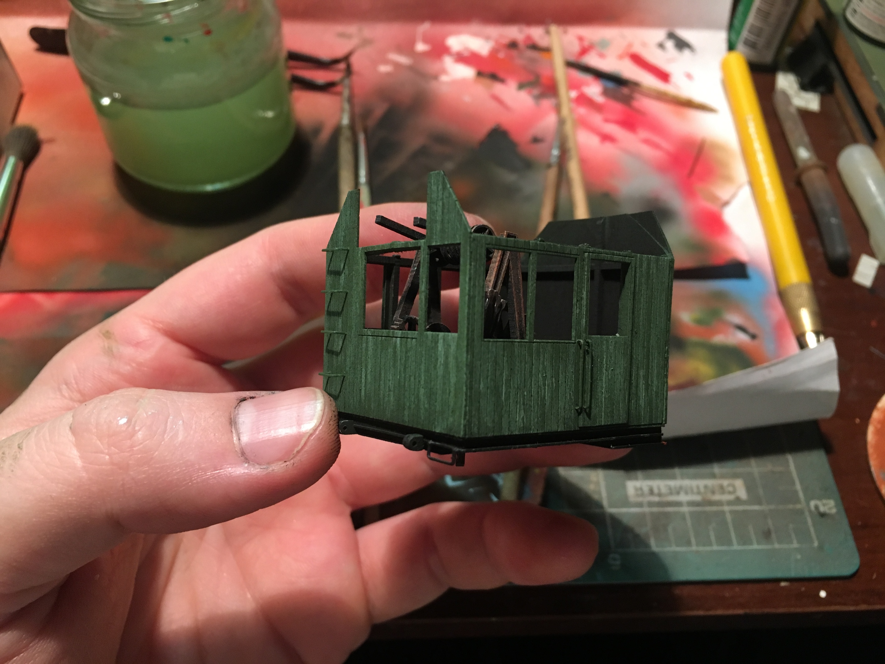 На этапе, изображённом на фото выше, муза ушла. Делеко и очень надолго. Пошла постройка макета и так далее. Недели полторы назад, я решил достроить данную модель. Оставалась крыша, грейфер, покраска, декали и протяжка тросов. Ниже фото процесса с описанием.