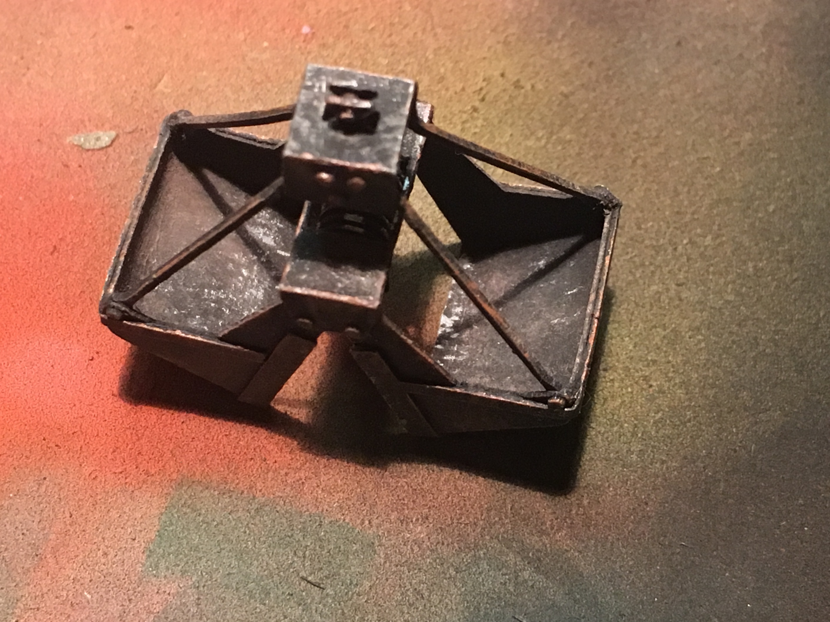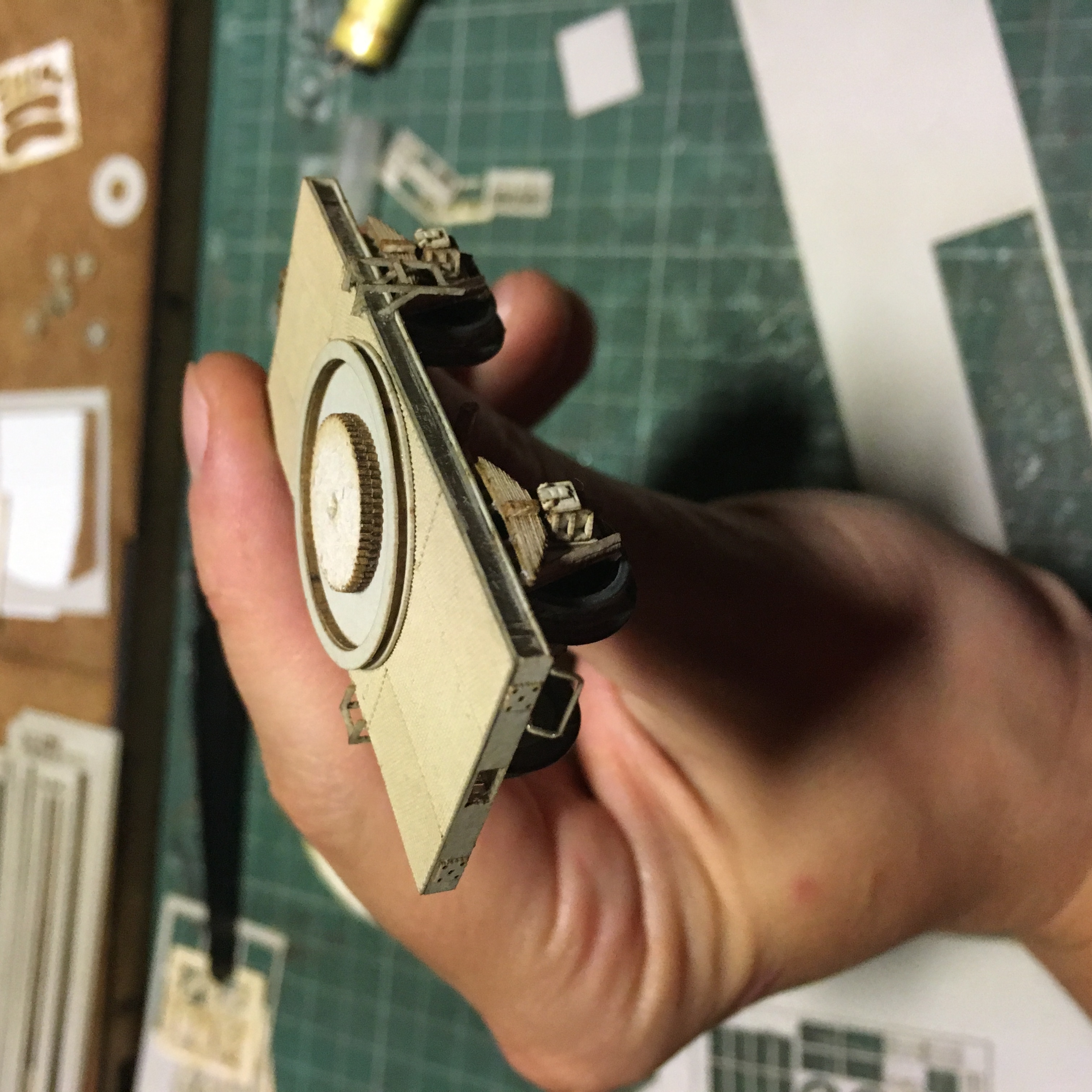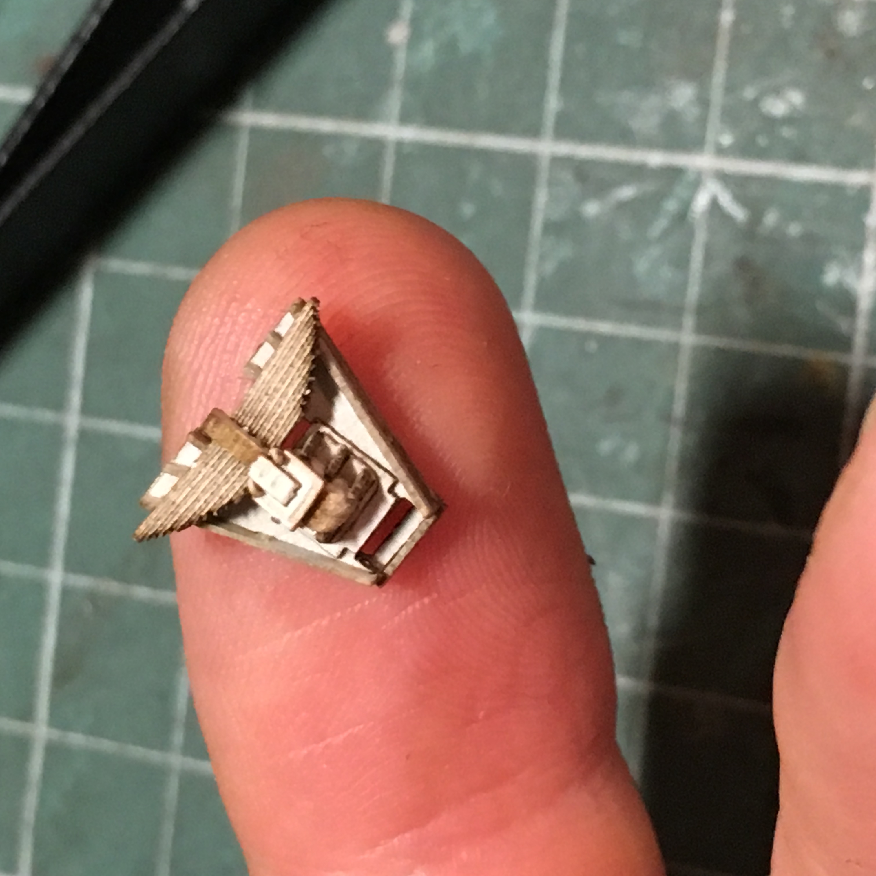 На этапе, изображённом на фото выше, муза ушла. Делеко и очень надолго. Пошла постройка макета и так далее. Недели полторы назад, я решил достроить данную модель. Оставалась крыша, грейфер, покраска, декали и протяжка тросов. Ниже фото процесса с описанием.