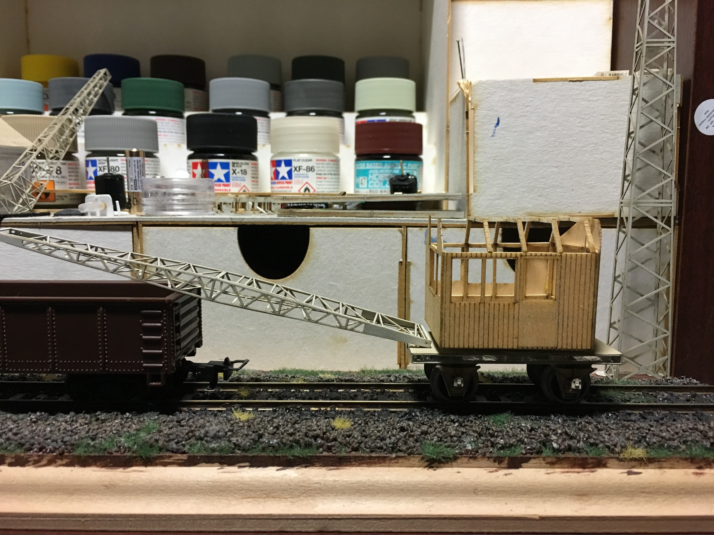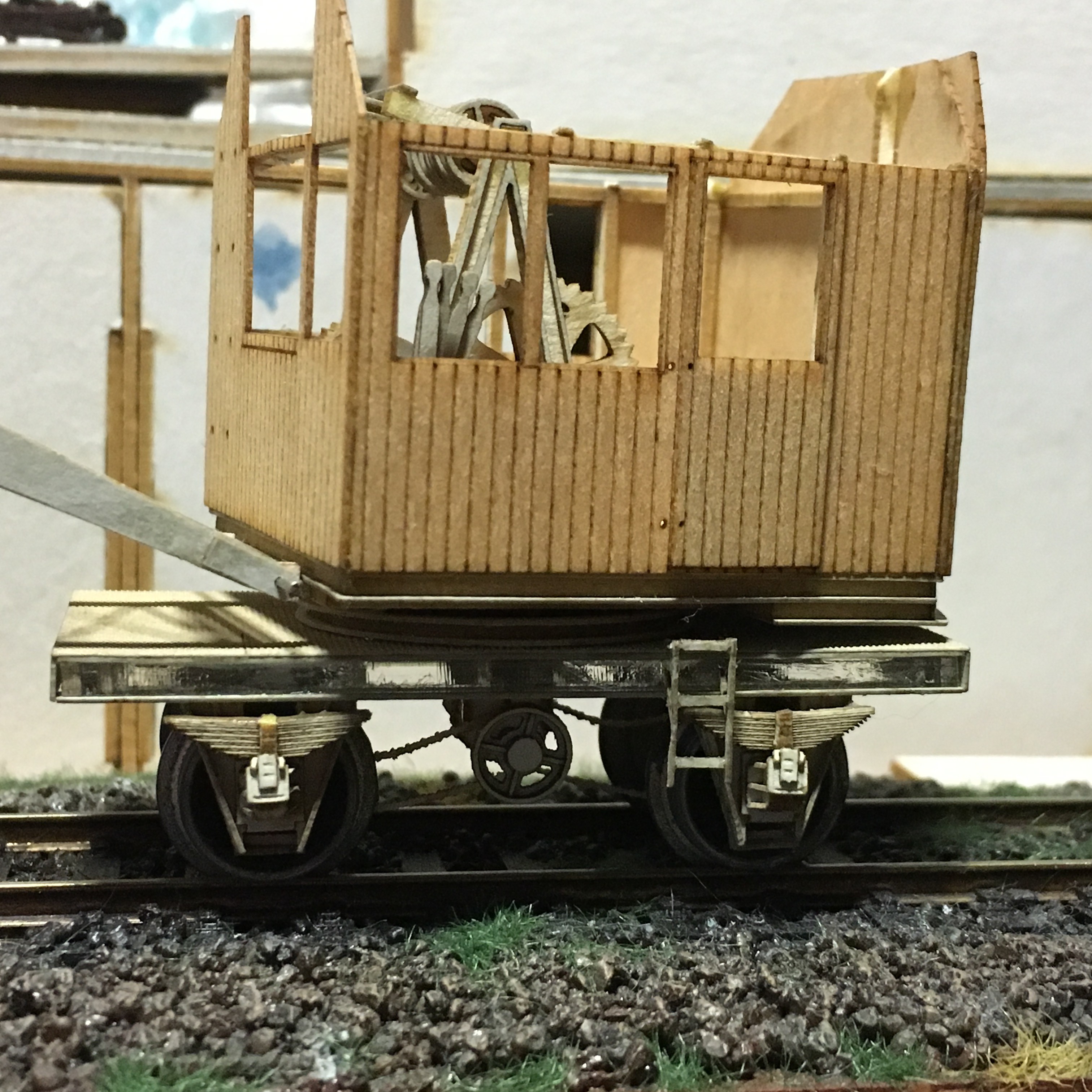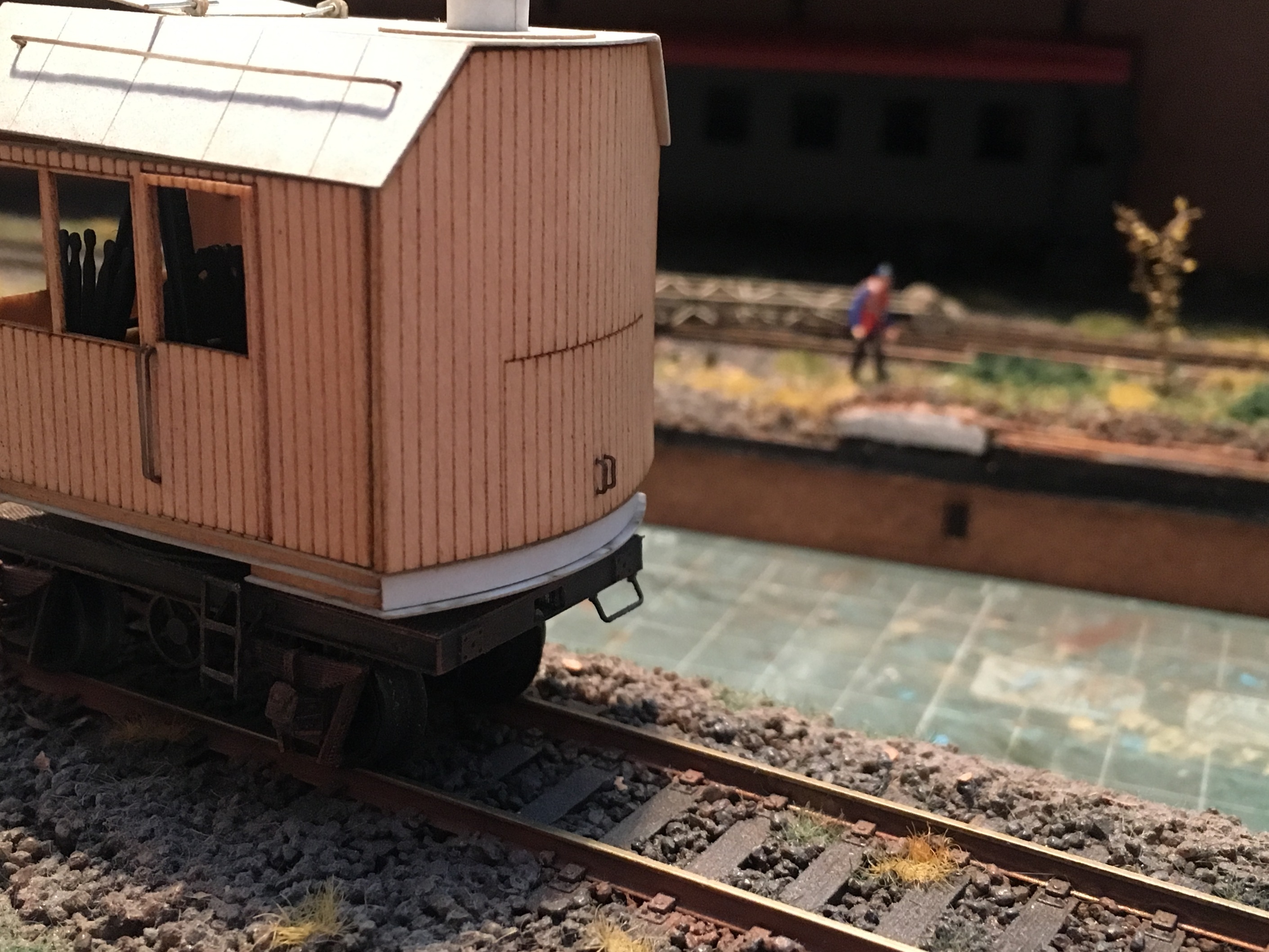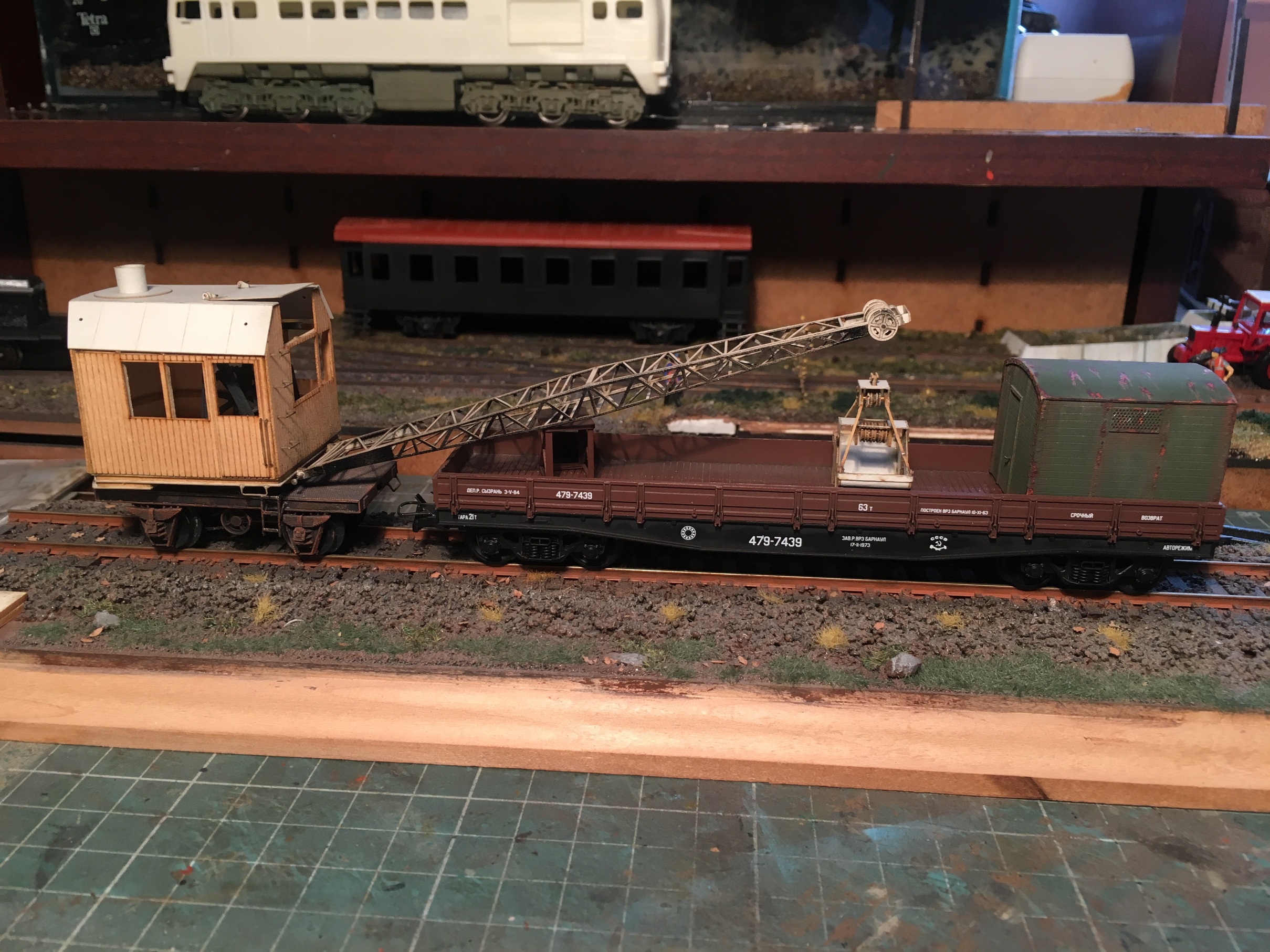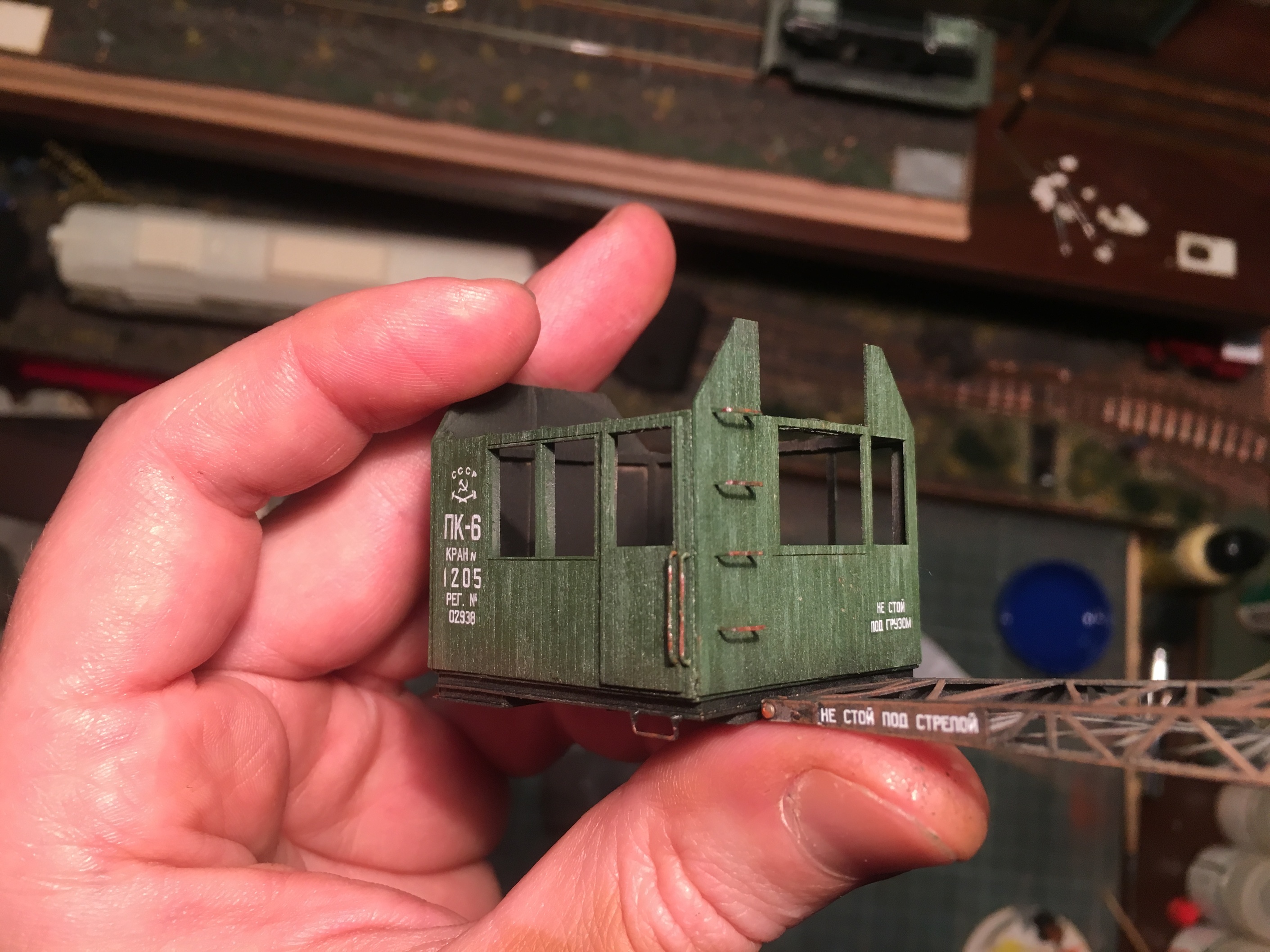 Собственно на этом всё пока. Осталась крыша, точнее её тонирование и протяжка тросов. И на днях решил, что будку надо на подшипник посадить. Благо, что микроподшипники были в наличии. И не могу решить, в каком положении оставит стрелу. Кран планировался для работ в депо. Выгрузка песка и так далее. На средней высоте наверное оставлю, а за счёт вращения будки, как бы и катиться сможет и в стороне от колеи, производить выгрузку и прочие работы.