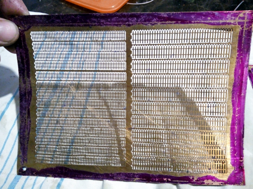 Сегодня сделали заборы и нечто похожее на немецкие светофоры (переразмерил головку, надо уменьшить на 1,5 мм по ширине и 2 мм по высоте, а еще лучше под смд-диоды делать). Вытравлено на латуни 0,15мм формата А5.