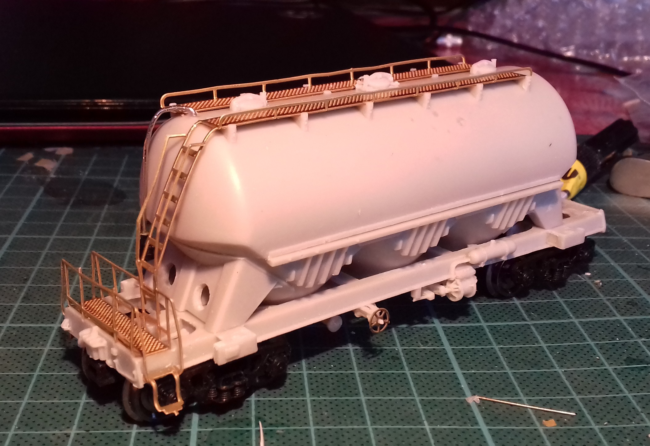 Обилие травла сначала испугало. Памятуя попытки работать с тем, что вкладывает в киты Камушкин и Бражник, ожидал длительного интима. Однако ничего подобного: материал толще и не ломается с первой попытки его гнуть. Оказалось, травлёные детали хорошая штука, если они не говно. Пришлось повозится, очищая от облоя трубопроводы. Качество литья не ахти, но с этим тоже как-то справился. Также понадобилось изготовить воздухопровод сброса давления (именно его не хватало). Взял толстую проволоку и кусок пластика. Вышло грубовато, но увы - выготовить столь мелкие элементы пока не под силу.