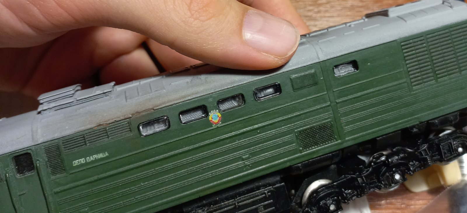 Продолжаю мучать "тройку". Обратил внимание на дефект краски на крыше (облазила), передул. Скотч малярный снялся вместе с декалями. Которые были под лаком...