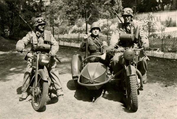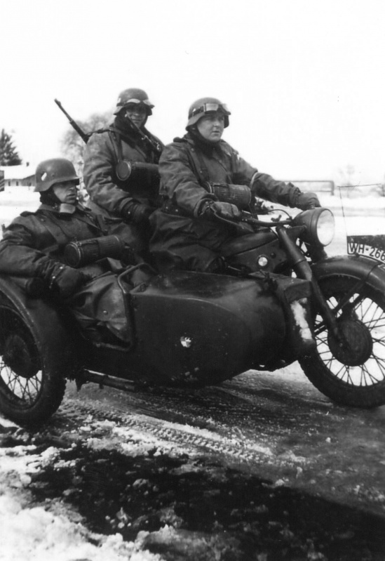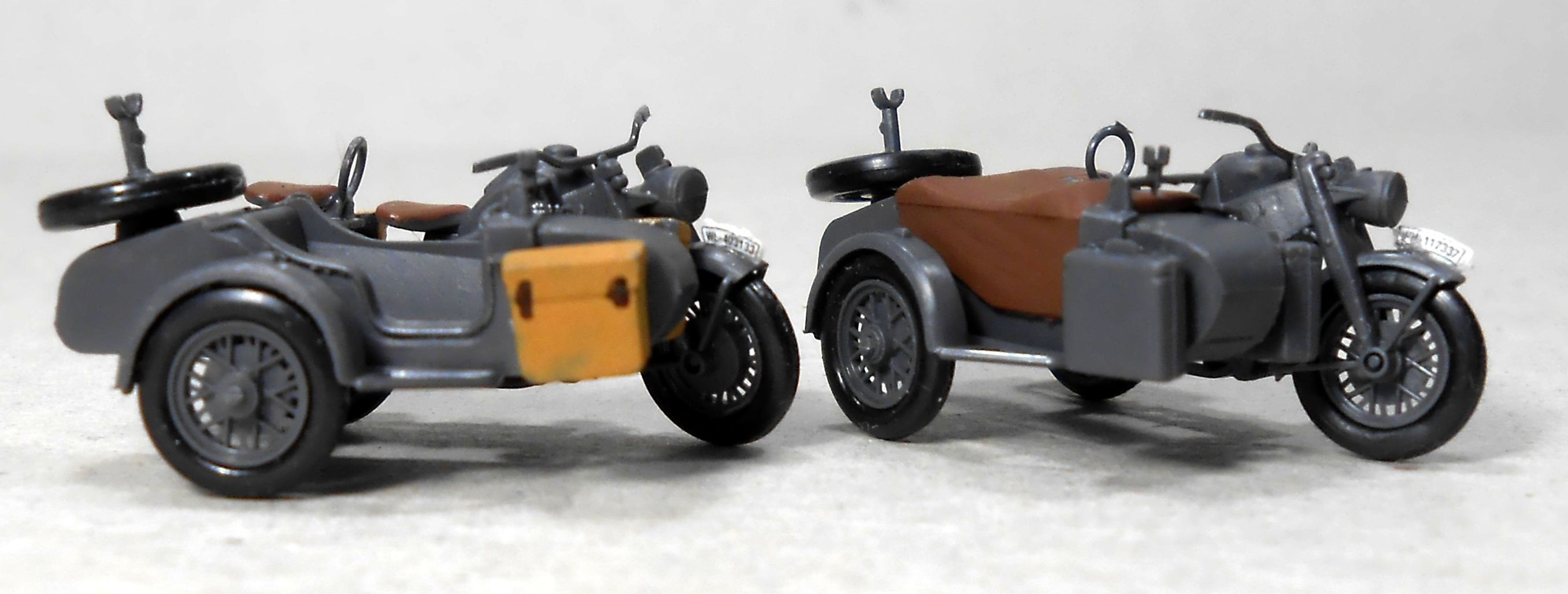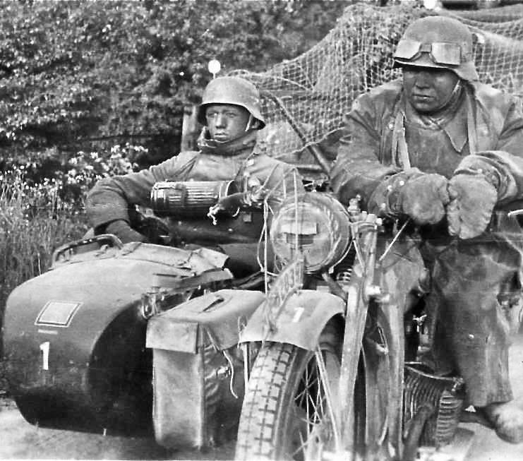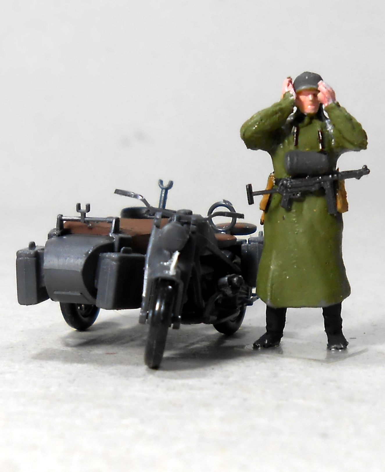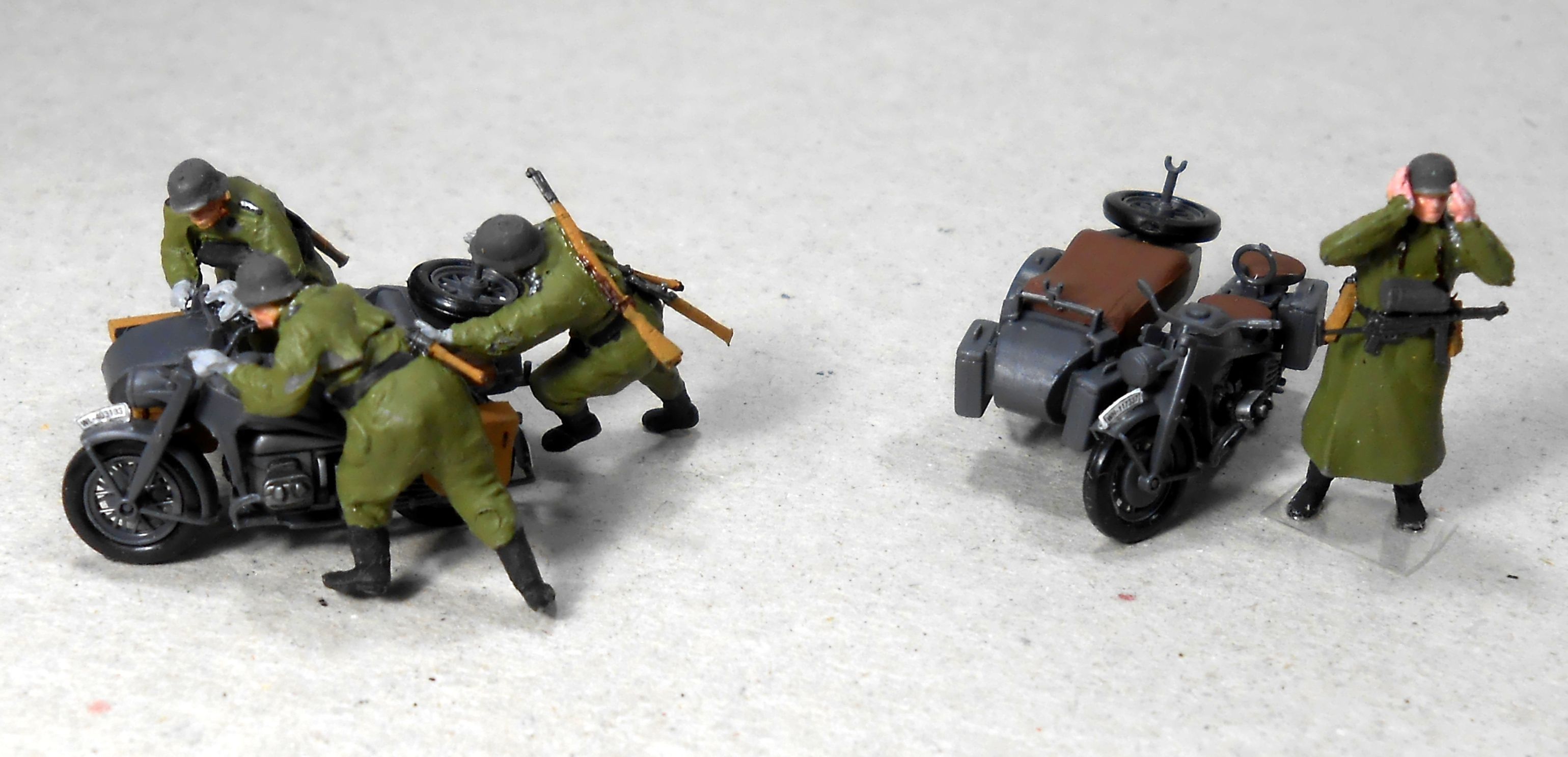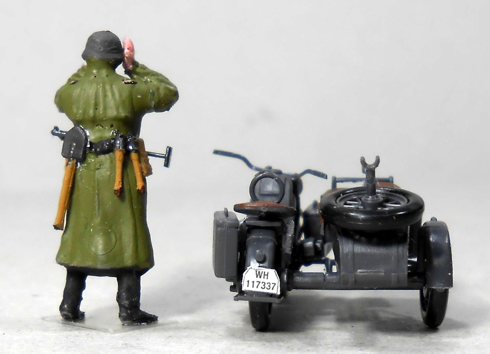Прикольно получилось. А мне кажется, что противогазные бачки смещены для удобства толкания мотоцикла. А жетоны вроде как носили только жандармы. А вот и фото. Так что, все правильно отлито.