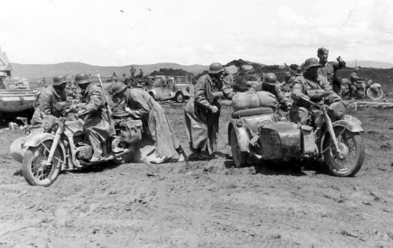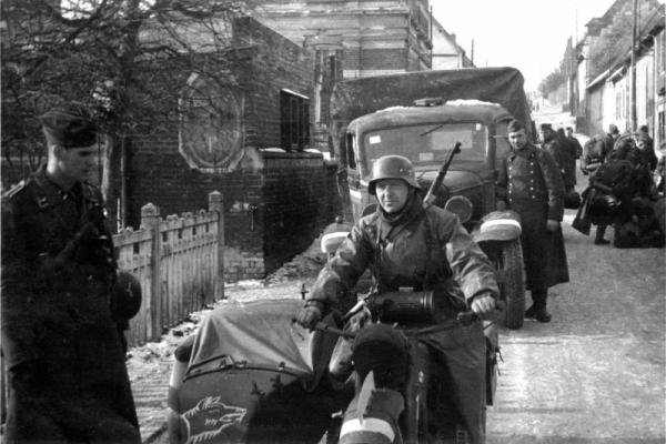 НО!!! (.... "И тут малец с поправкой влез... " В.С. Высоцкий) Воины ваши одеты в плащи из прорезиненной ткани, обмундировывались в них мотоциклисты и фельджандармерия. Мог этот плащ носится как собственно плащ и как комбинезон, для этого полы оборачивались вокруг ног и застёгивались. На фото виден покрой и СЕРЫЙ цвет это плаща. Вот собственно по поводу цвета обмундирования фигур я и влез.... Удачи!