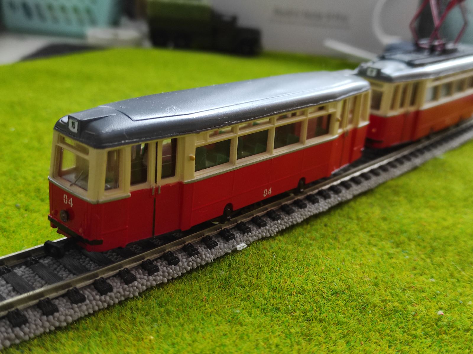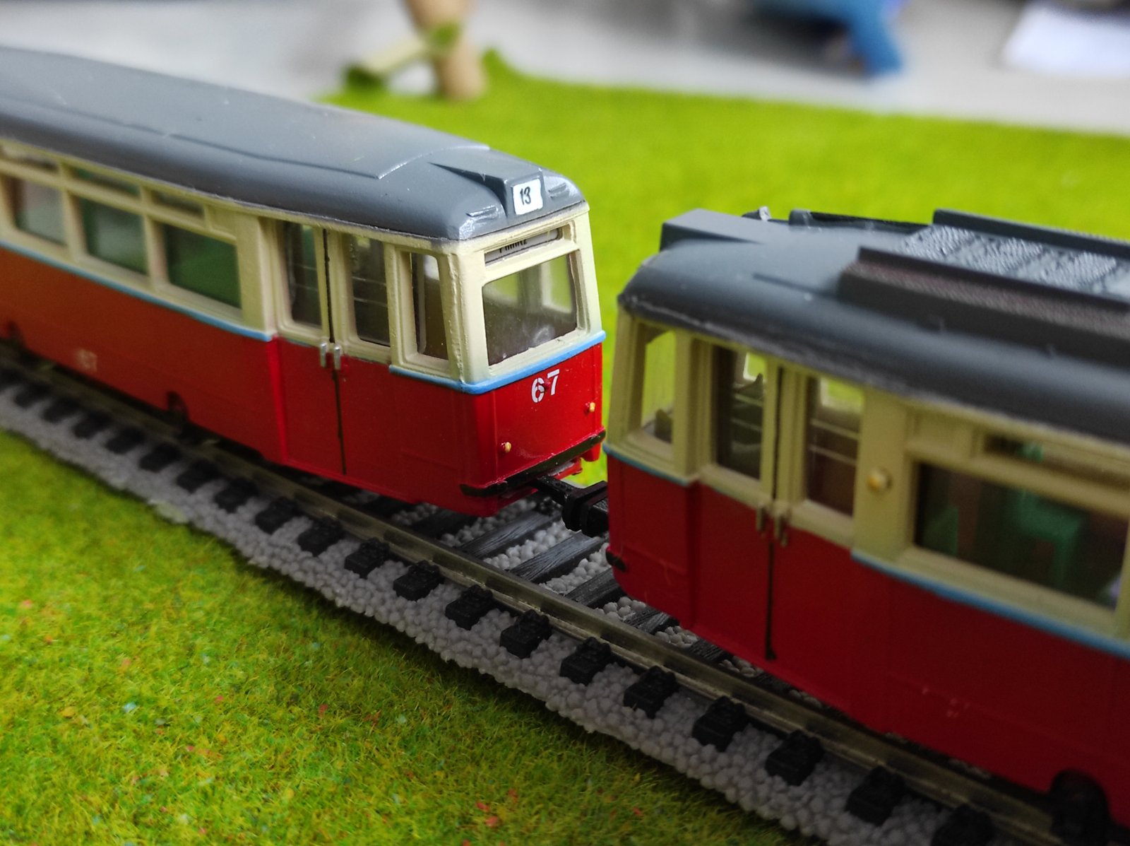 собрал пару трамваев на заказ,первый обычный вариант с голубой полосой,второй был расклеян и собран заново,в каждом вагоне кабина управления, полосу сделал серебристую-на подобии Евпаторийской готы с двумя кабинами в разных вагонах