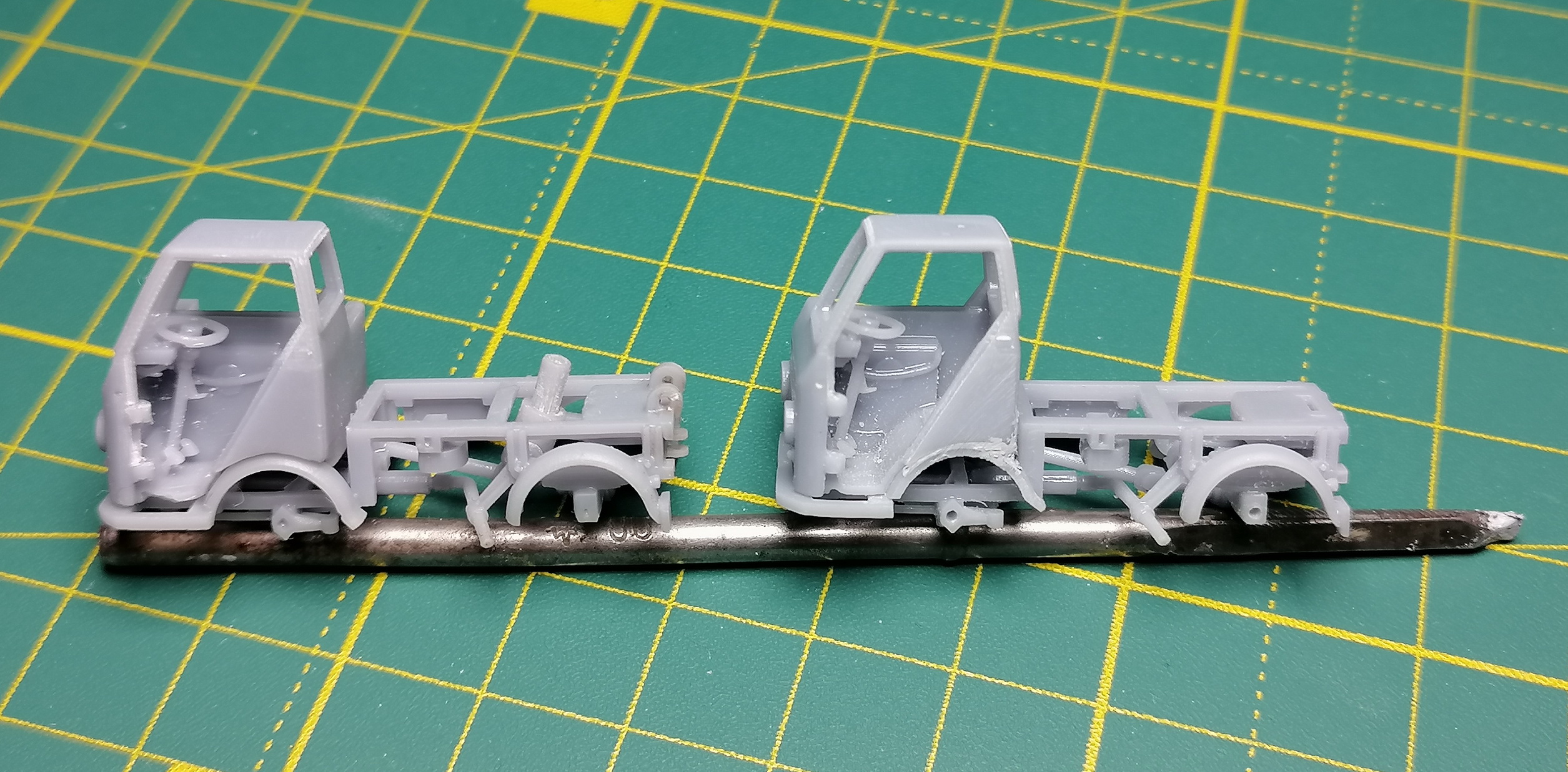 Мастера делал мой кум, он же красил и лил детали из сплава Вуда. Я и ещё один товарищ занимались литьём и сборкой. Лили ЭДП-20, другой смолы тогда у нас не было. Пластиковые колеса покупали где то в Киеве.