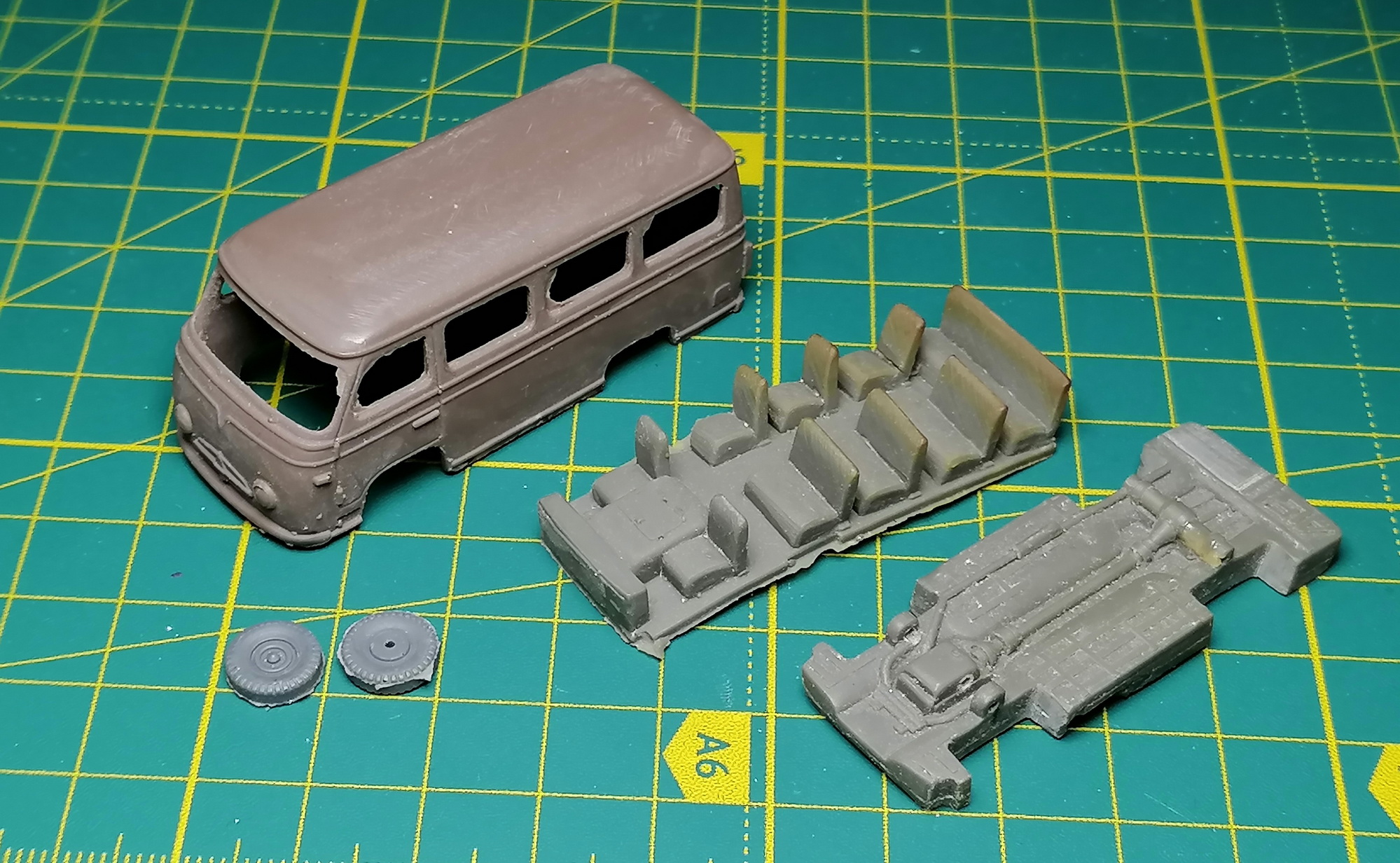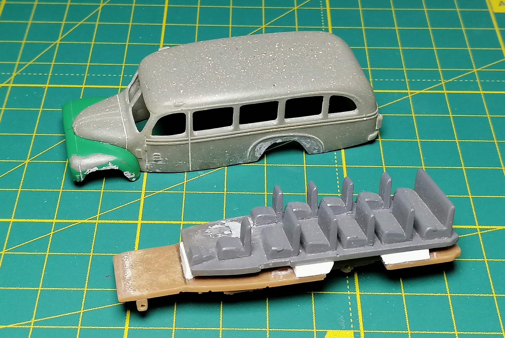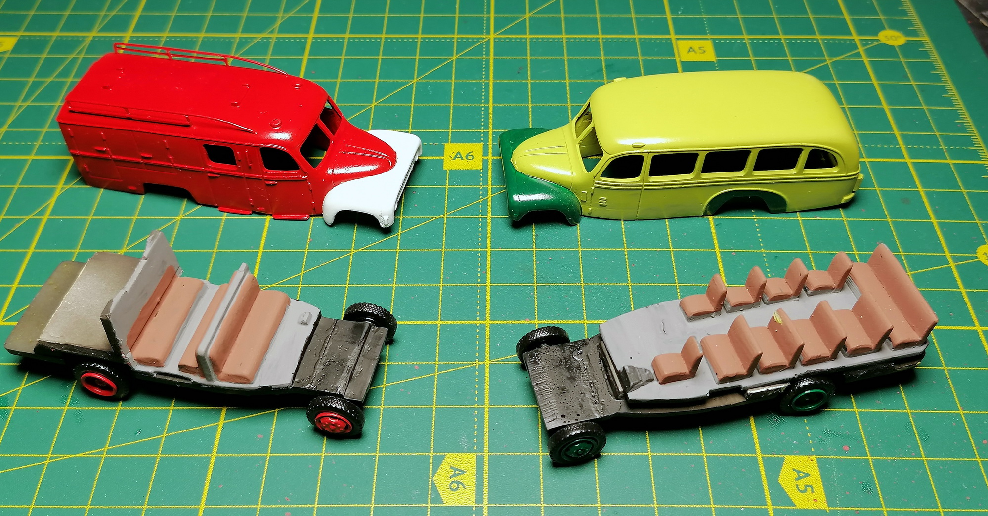 Решил начать с автобуса и пожарки. Отчухал корпуса, морды, днища, сиденья. Зашпаклевал раковины. Частично склеил в кучу. Пока так.