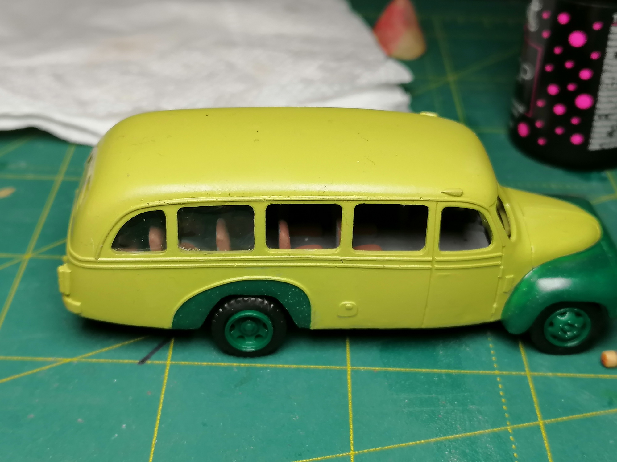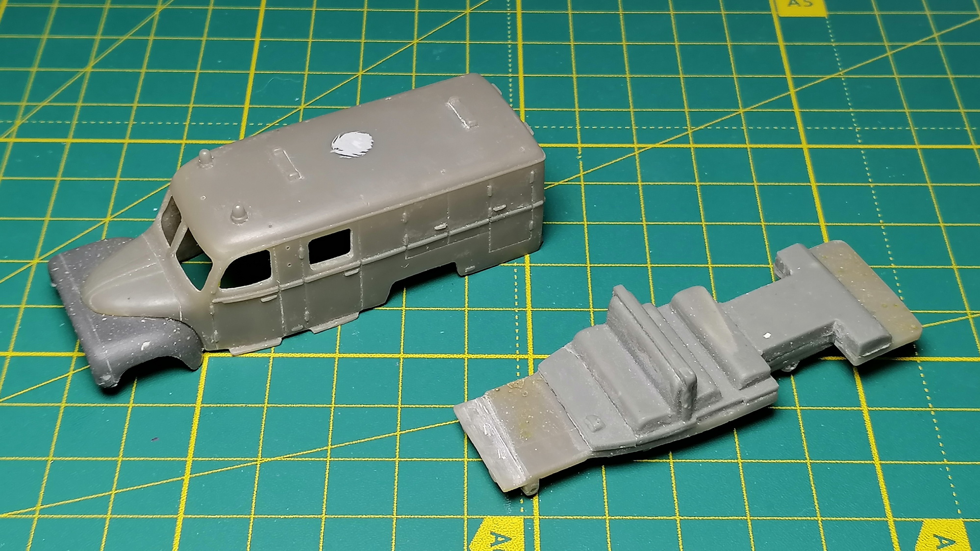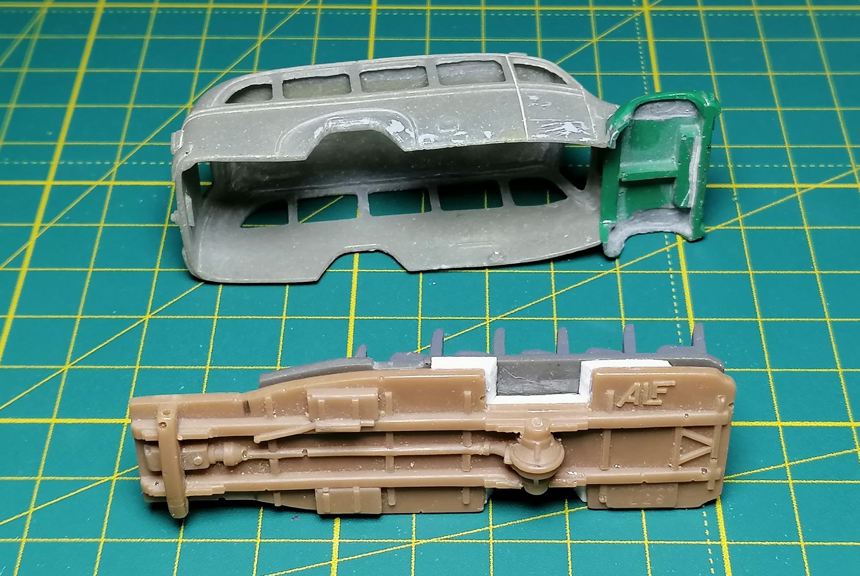 Решил начать с автобуса и пожарки. Отчухал корпуса, морды, днища, сиденья. Зашпаклевал раковины. Частично склеил в кучу. Пока так.