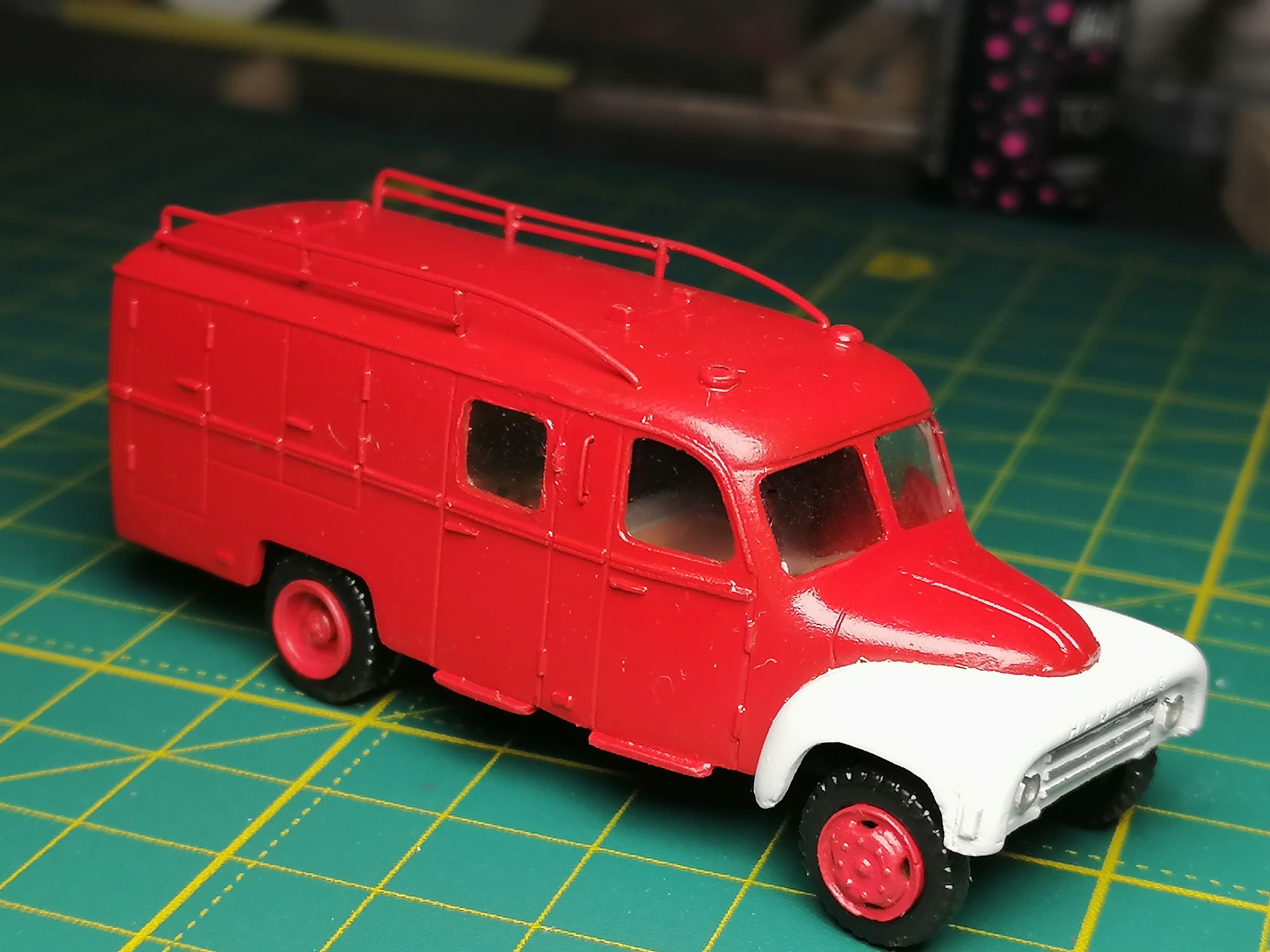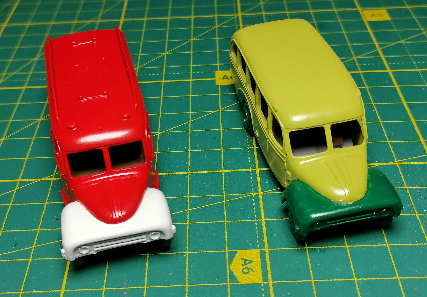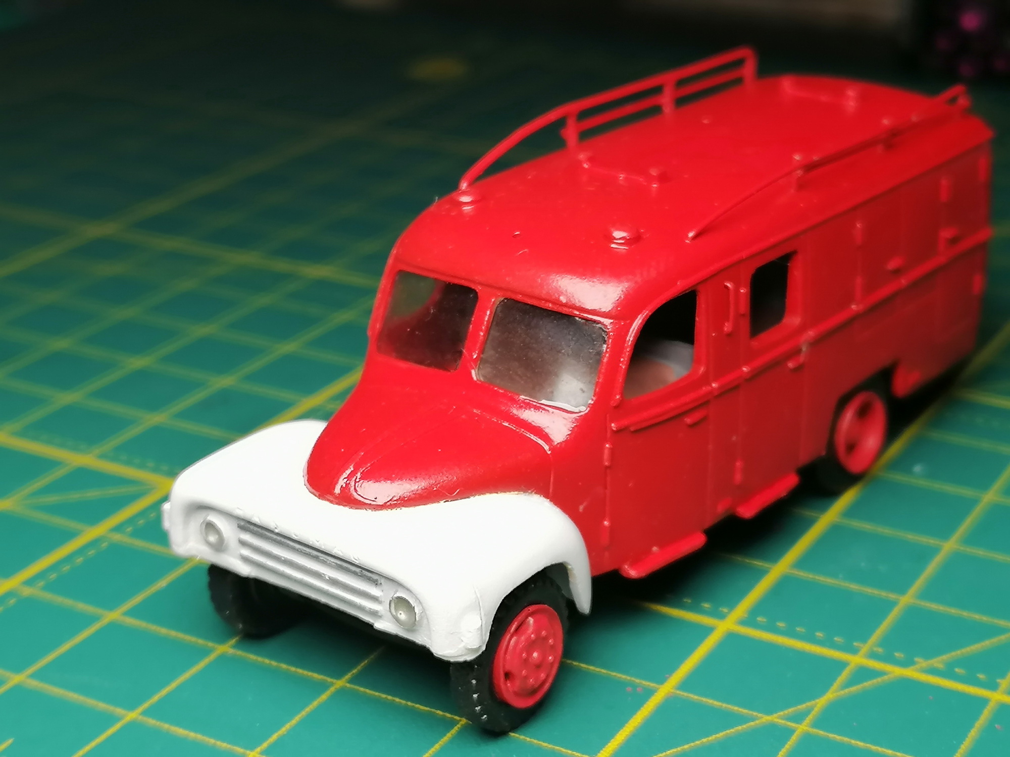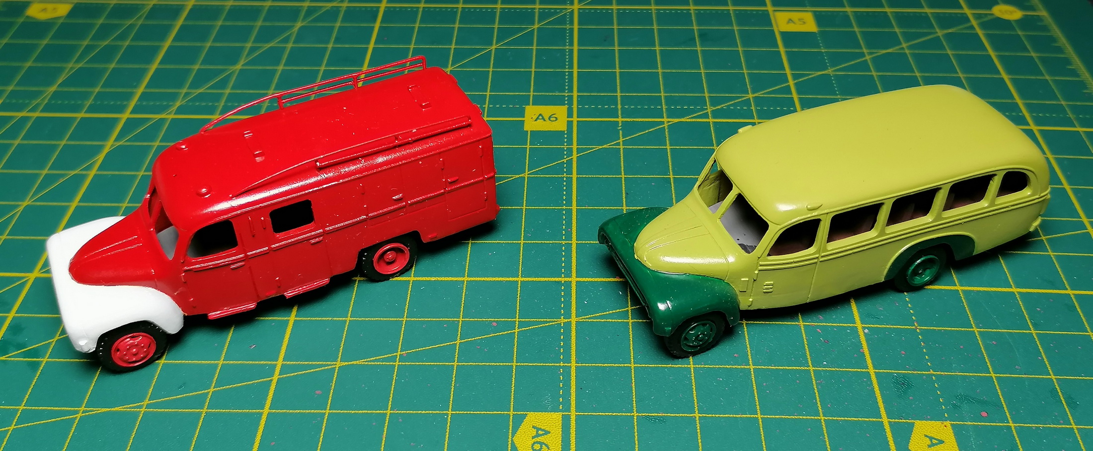 Покрасил корпуса, собрал днища и салоны в кучу, тоже покрасил. Пожарку перекрашивал, с первого раза не получилось нормально, попал мусор на краску. Причем сначала покрасил с черными крыльями, второй раз решил сделать белыми. Завтра, по возможности, хочу сделать остекление. Хотя бы на одной машинке.