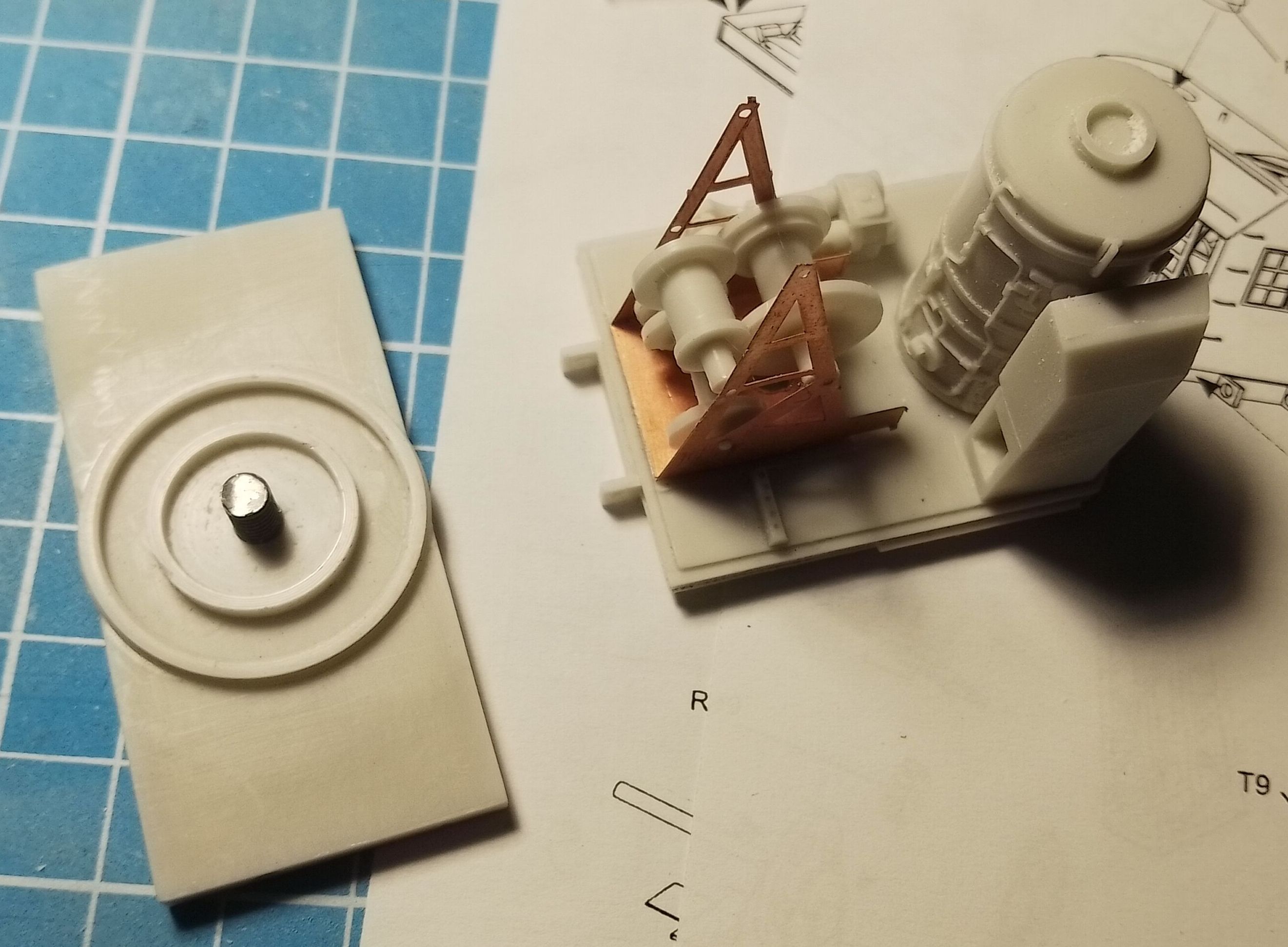 Далее. Реализация функции поворота кабины. Всё просто. Винт с обточенной шляпкой, вклеенный в центр платформы, а на основании кабины, сделано углубление, куда вклеена плоская гайка, а сверху приклеена имитация с тросовыми барабанами.