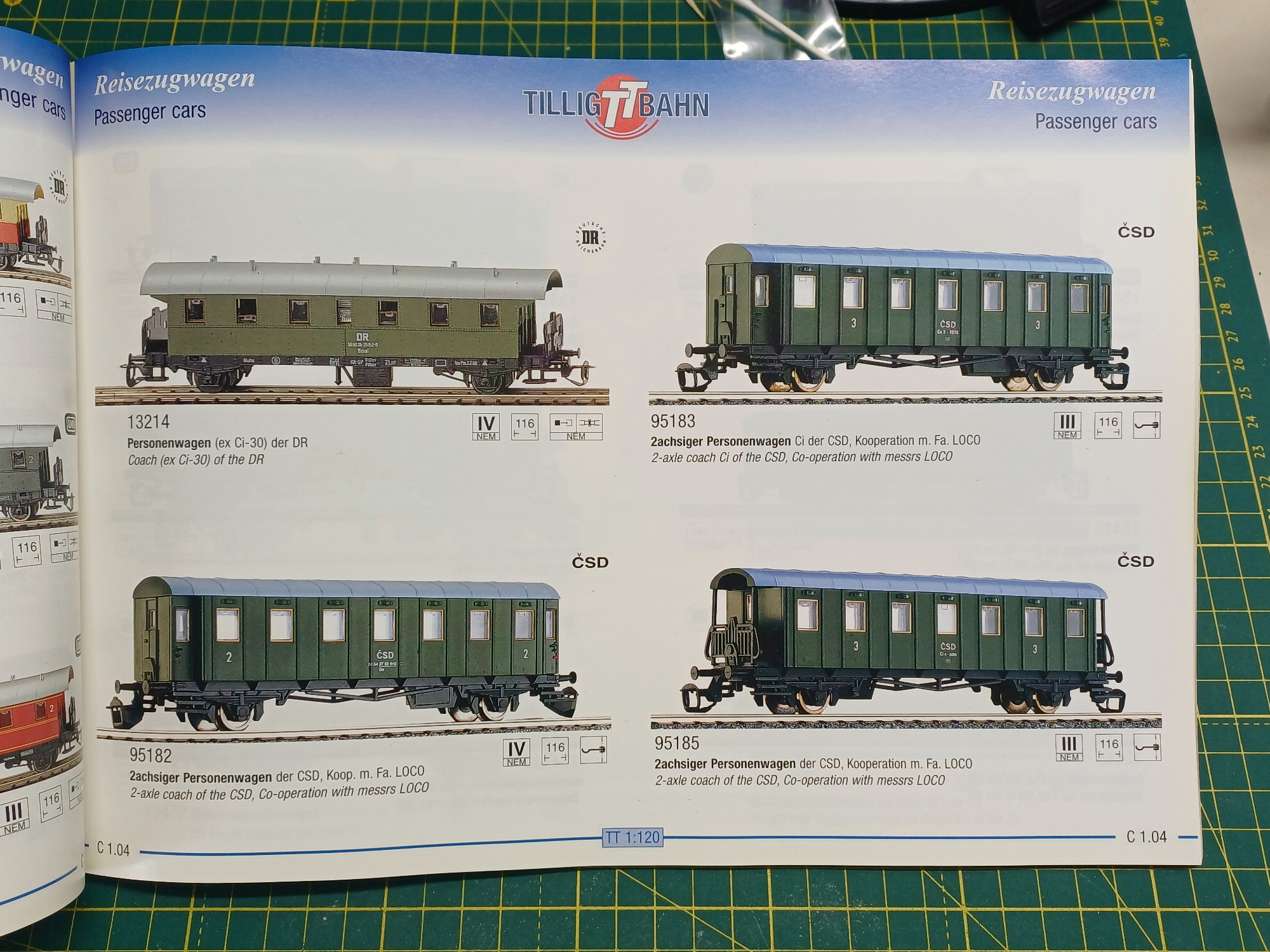 Хоппер из кита (кит был черный, но нашел декали только для желтого, а оттенок ядовитый, потому что аэрограф в моем случае непозволительная роскошь, а более подходящей аэрозольной краски не нашел в продаже в тот момент - в реальности они менее ядовитого цвета, хотя все равно яркие). Поручни стали сильно толстые, т.к. на них слой грунта и на скорую руку два слоя краски и лак сверху. как говорил, кинематика под НЕМ-шахту ставится в одно касание (сама шахта не установлена и не будет, модель валяется на полке и ездить вряд-ли будет, но втулить ее на место - одно движение же): Ну и пассажирские вагоны... Обратите внимание, насколько же древний этот кит, если цена на нем напечатана - 18 чехословацких крон! Современная чешская крона (и, кстати, крона времен Первой республики, т.е. с 1918 по 1938) - Kč, а Kčs - это чехословацкая, времен ЧССР и до 1993 года, соответственно. P.S. Киты цистерн в продаже (уже от Игры), в среднем по 23 евро - готовые цистерны Игра предлагает свои, современные, 6-й эпохи.