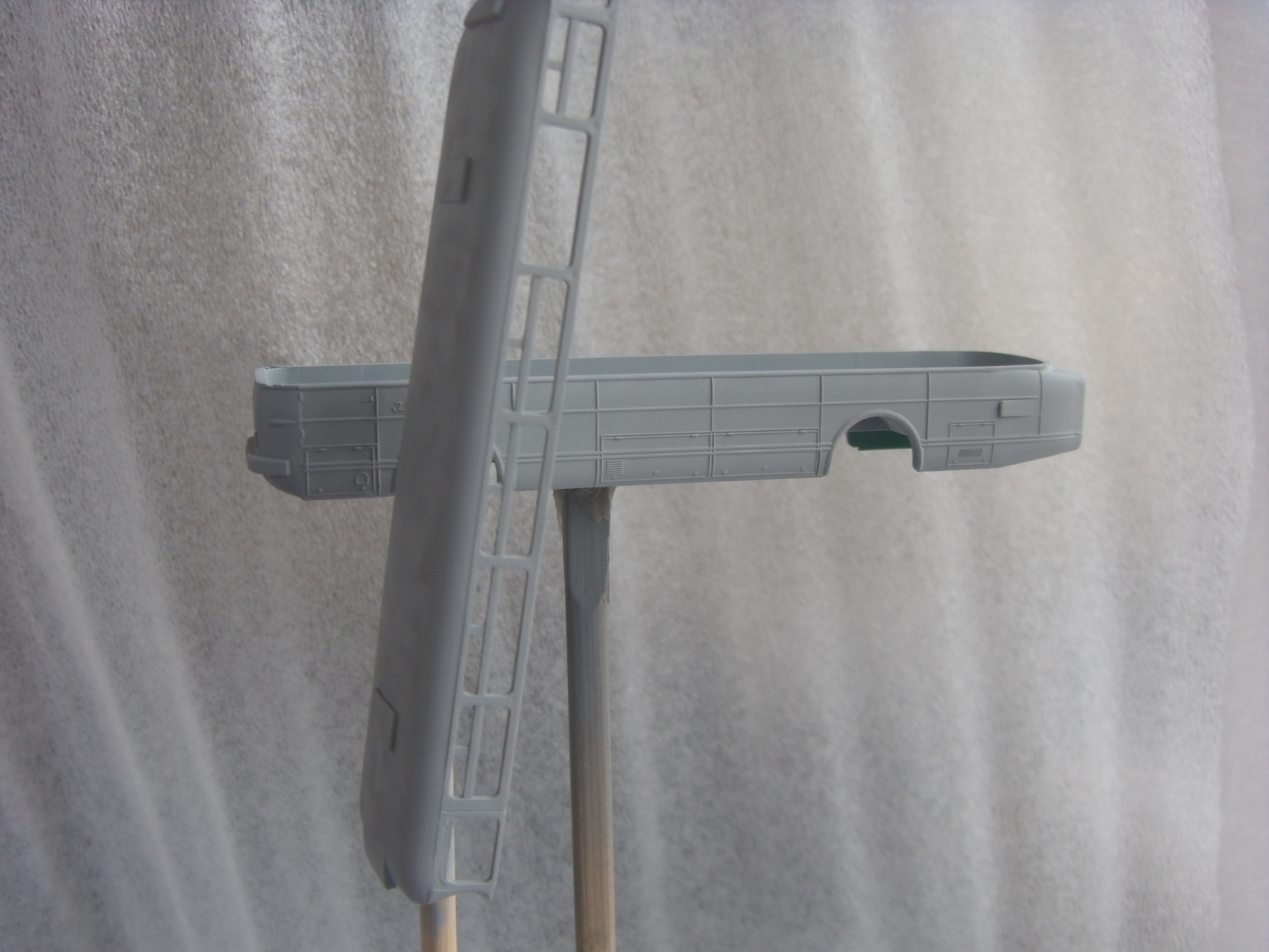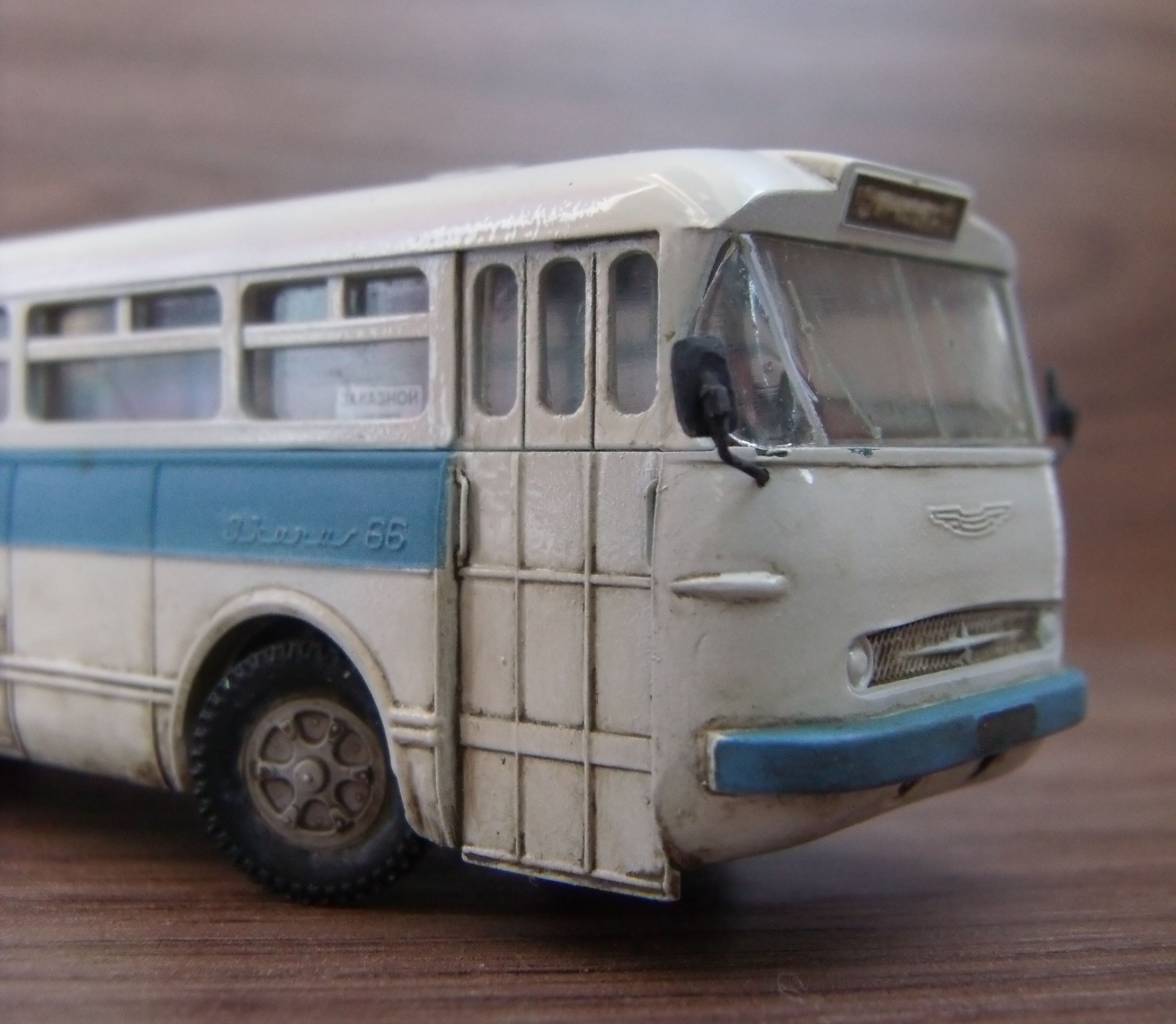 Обтачиваю, ровняю, подгоняю, шпатлюю. Грунтовка. Tamiya серая + Tamiya разбавитель грунта + Аэрограф Делаю зеркала и поворачиваю колёса. Крашу аэром. Покрашенное. Начинаю визерить. Начинаю сборку. И вот результат. Икарус 66. 1/87.
