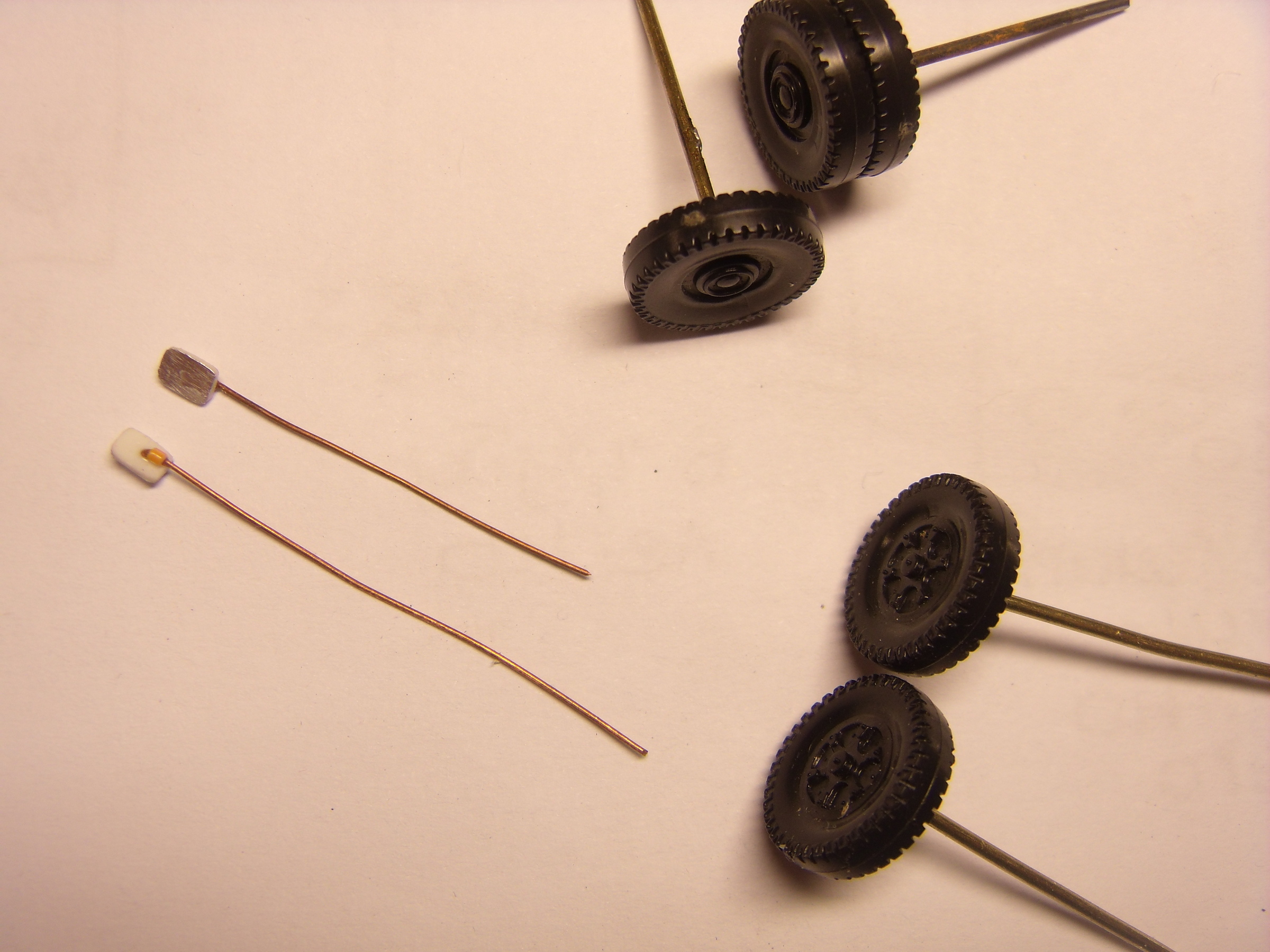 Для каждого колеса сделана новая короткая оська из медной проволки 1мм, оси выгнуты зигзагом, чтобы сместить центр оси поворота колеса, и вставлены в родное место в дне. Дно чуть подпилено.Stinky писав: Вашему можно добавить слегка запыленности в области колесных арок.