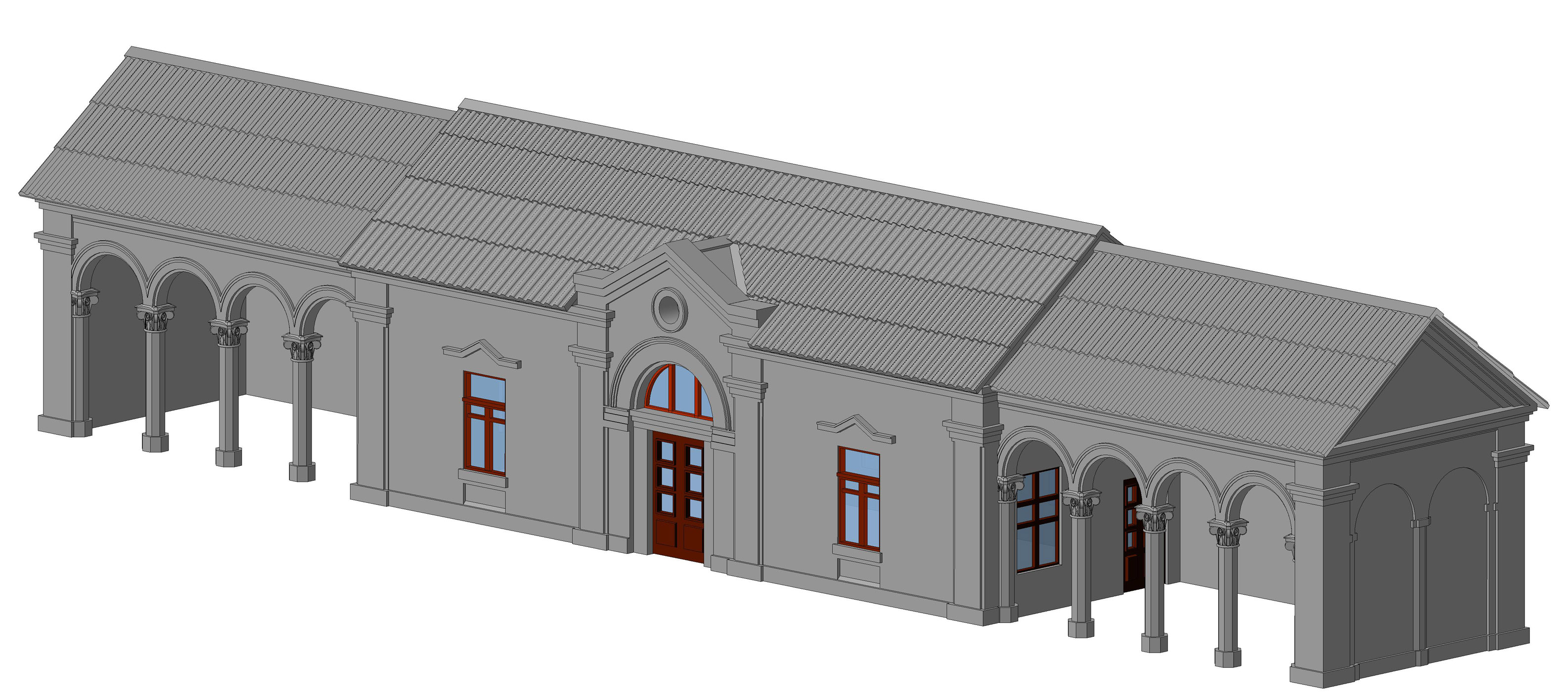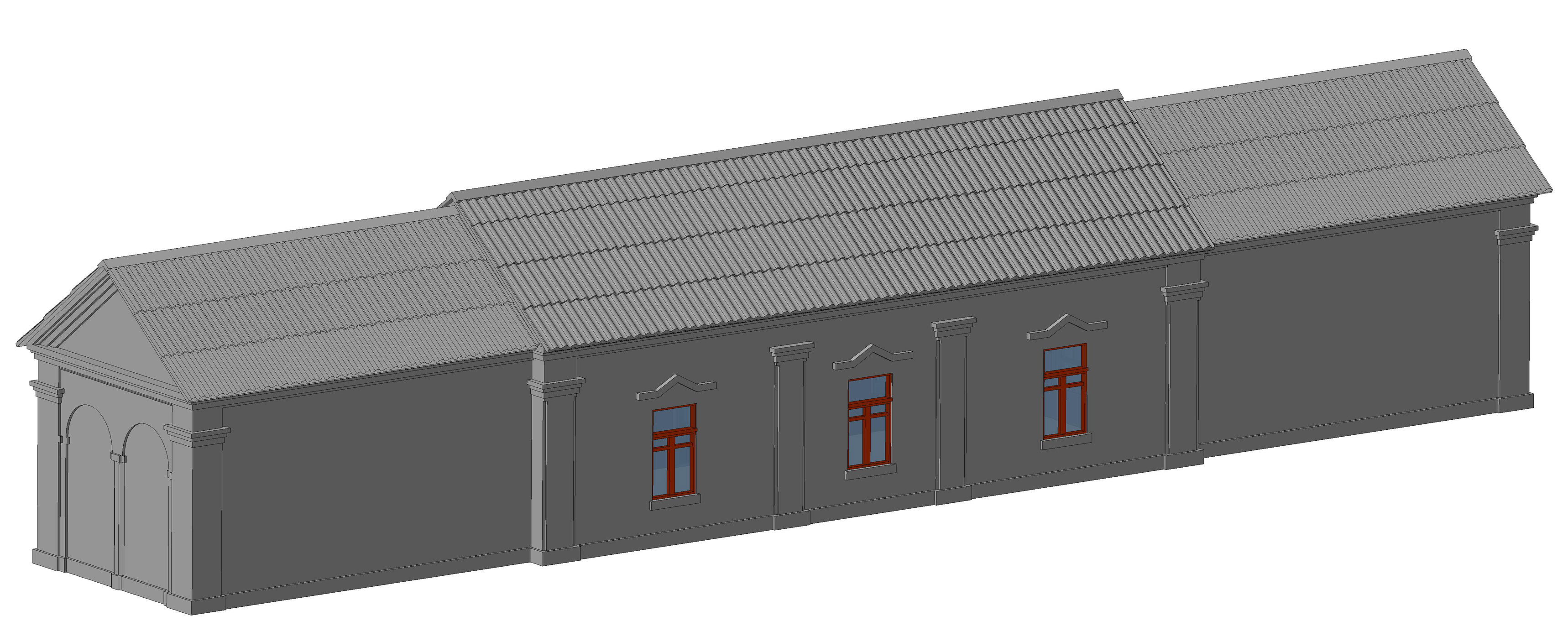 Здание построено из кирпича, оштукатурено и окрашено. Оконные проемы полностью застеклены. Размеры: 309,00мм:63,40мм:65,70мм