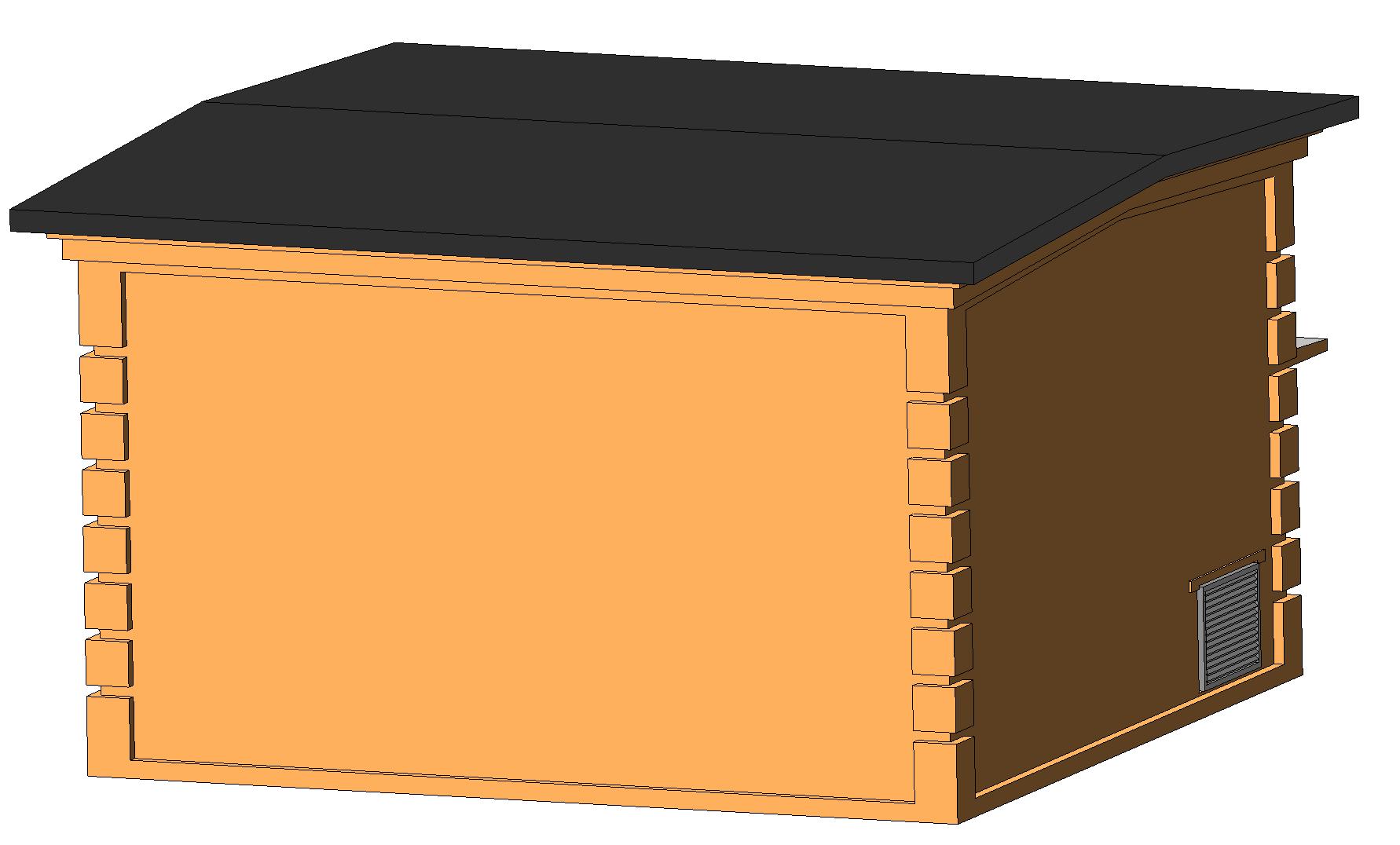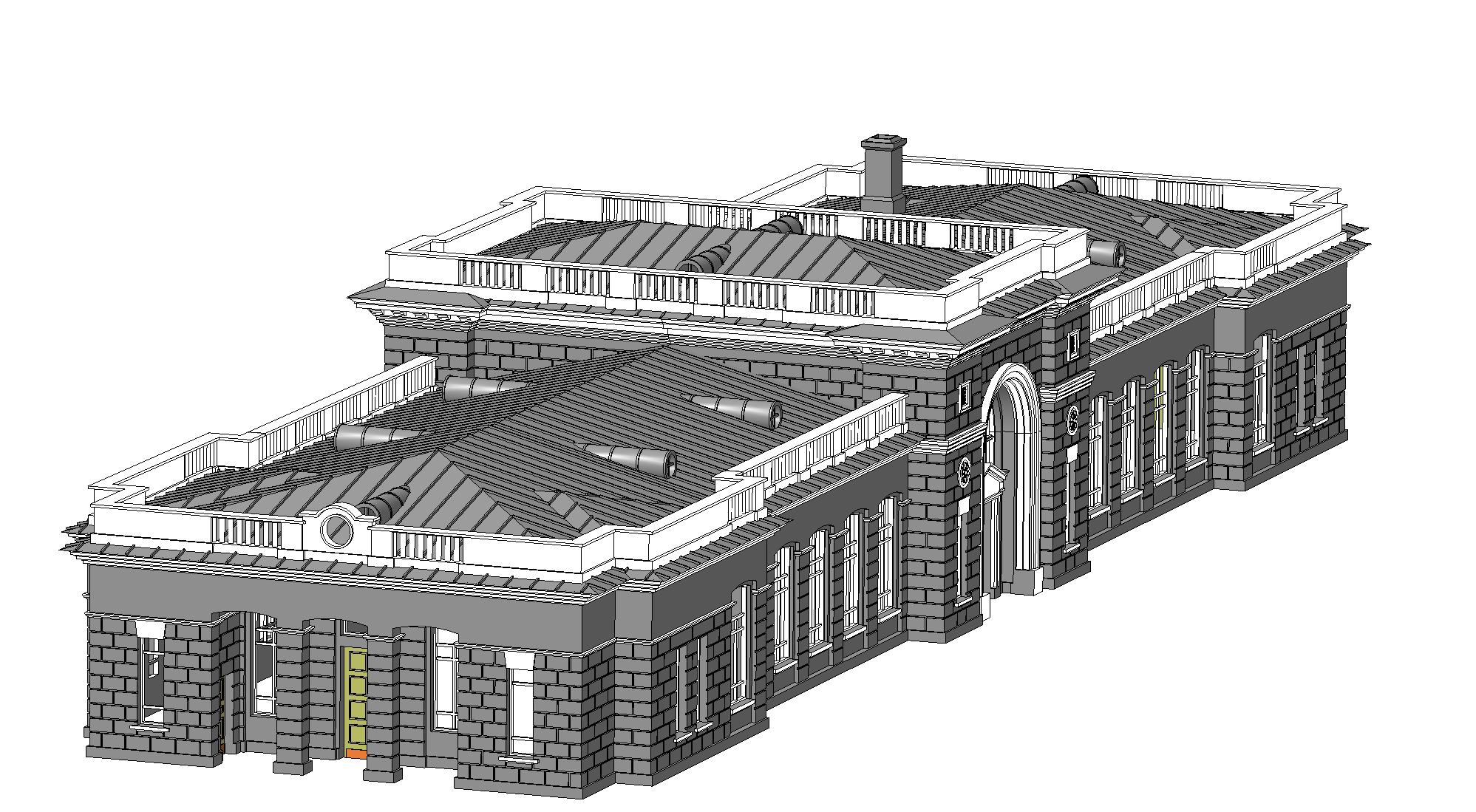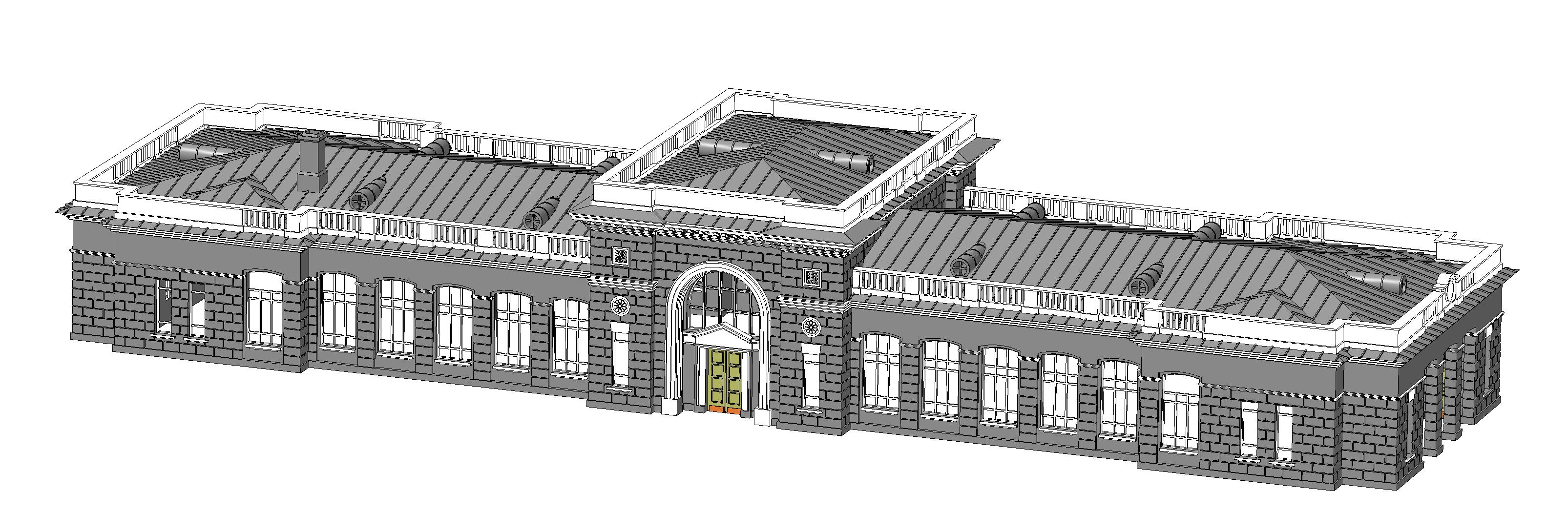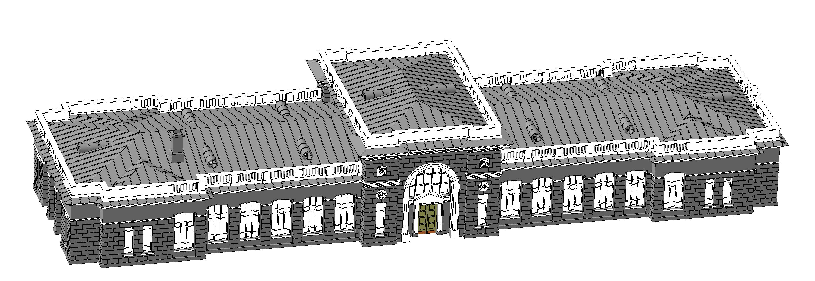Здание построено из ординарного или полуторного белого кирпича, перекрытие крыши гидроизолировано рубероидам. Двери и вентиляционные решетки выполнены из металла и покрыты нитроэмалью. Размеры:52,95ммХ49,70ммХ30,50мм.