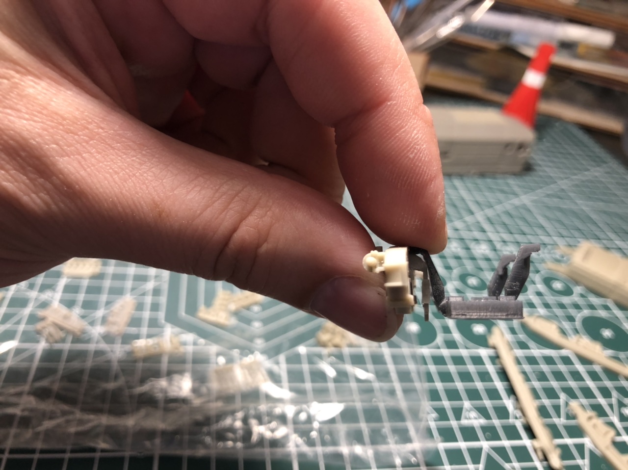Далее на юбку кузова вклеил мелкие деталюшки, здесь тоже возникла небольшая сложность, посадочные места оказались меньше (видно из-за усадки смолы..) чем сами детали, пришлось их расширять, а щели получившиеся зашпаклевать... Так же на кузов приклеил все остальные детали, буферный брус с горизонтальным расположением фонарей. На крыше вклеил стойки антенны из прутка диаметром 0,6мм. Спаял корпус трубы, перемычек не было в комплекте, вырезал и так же впаял их.