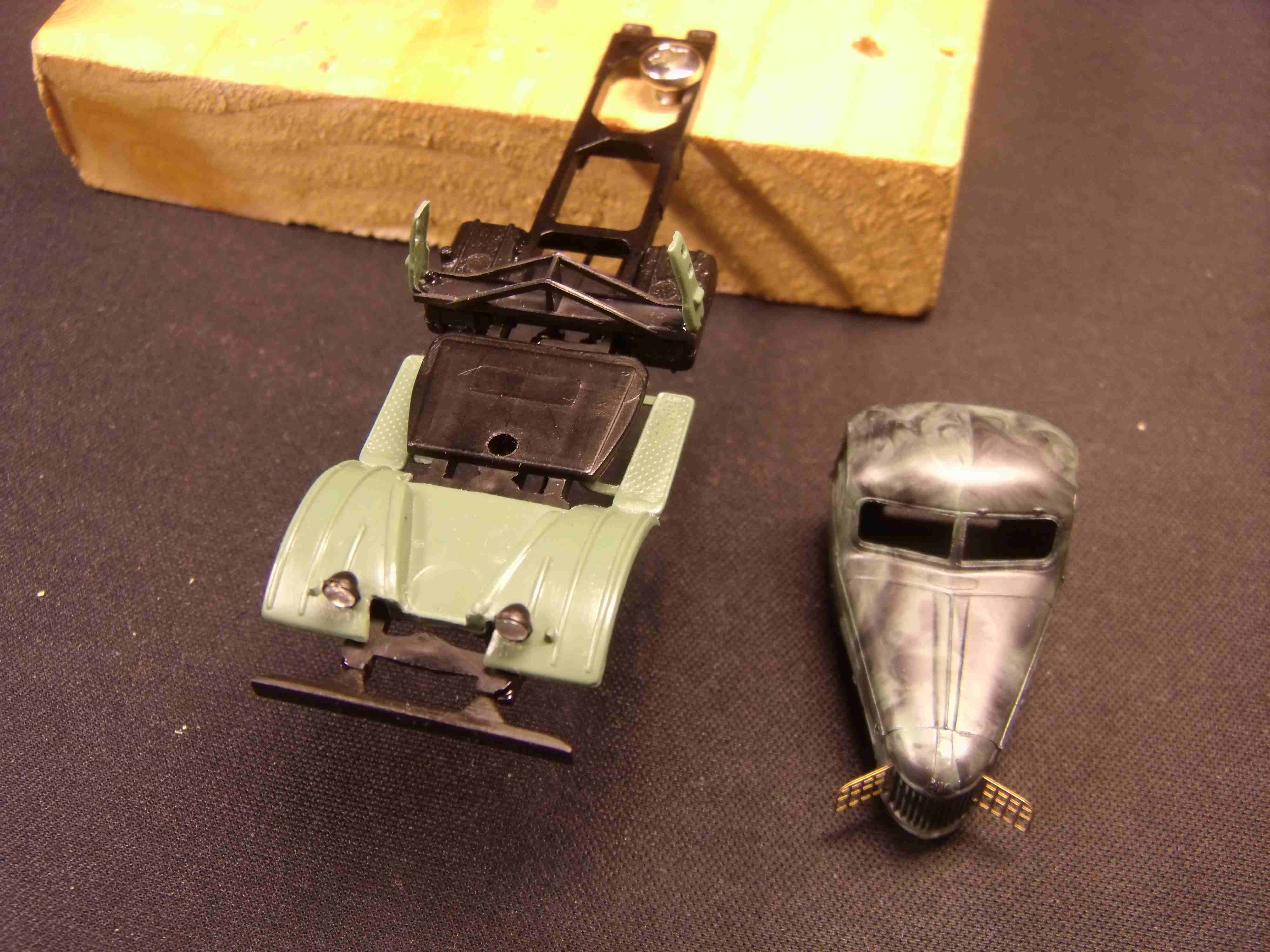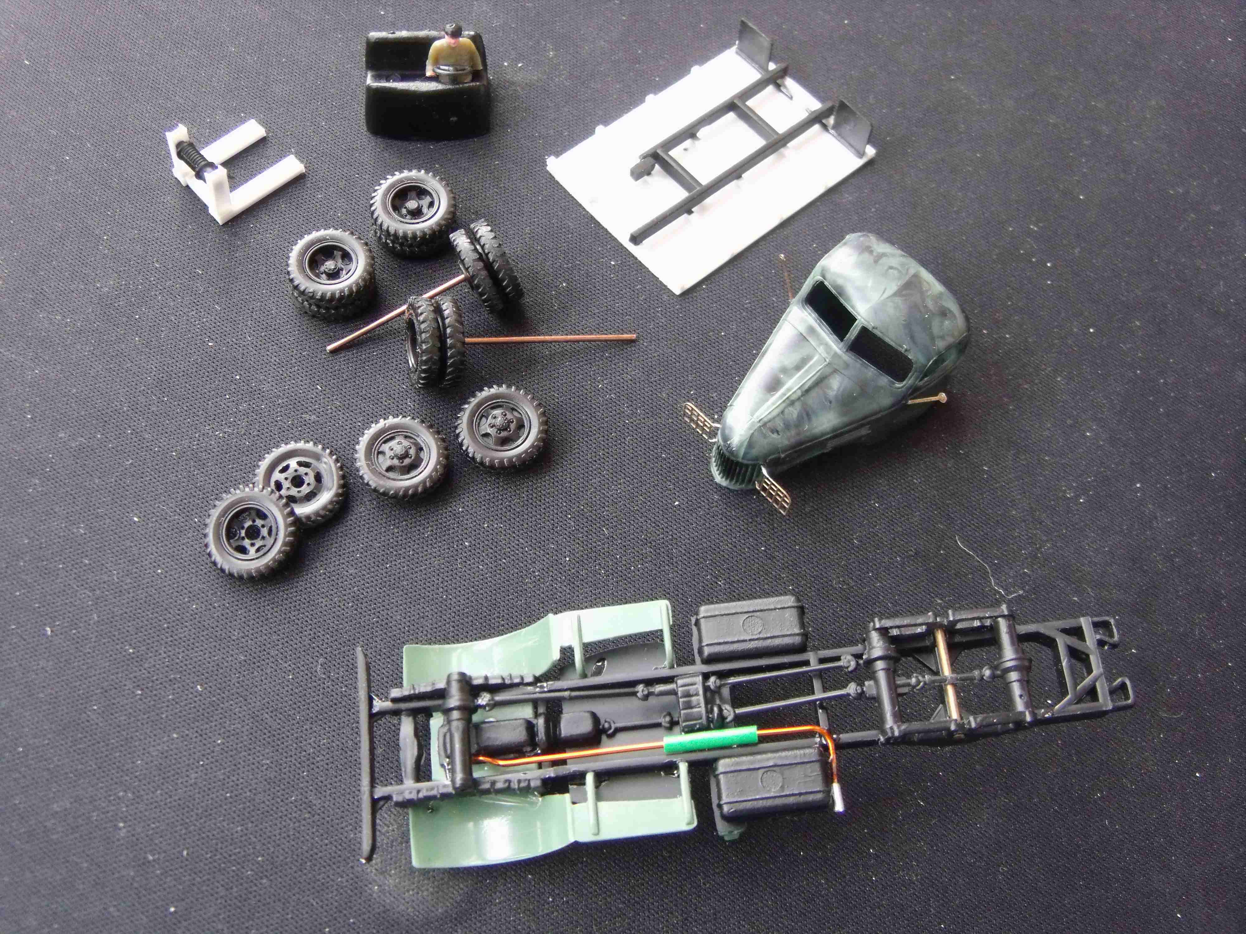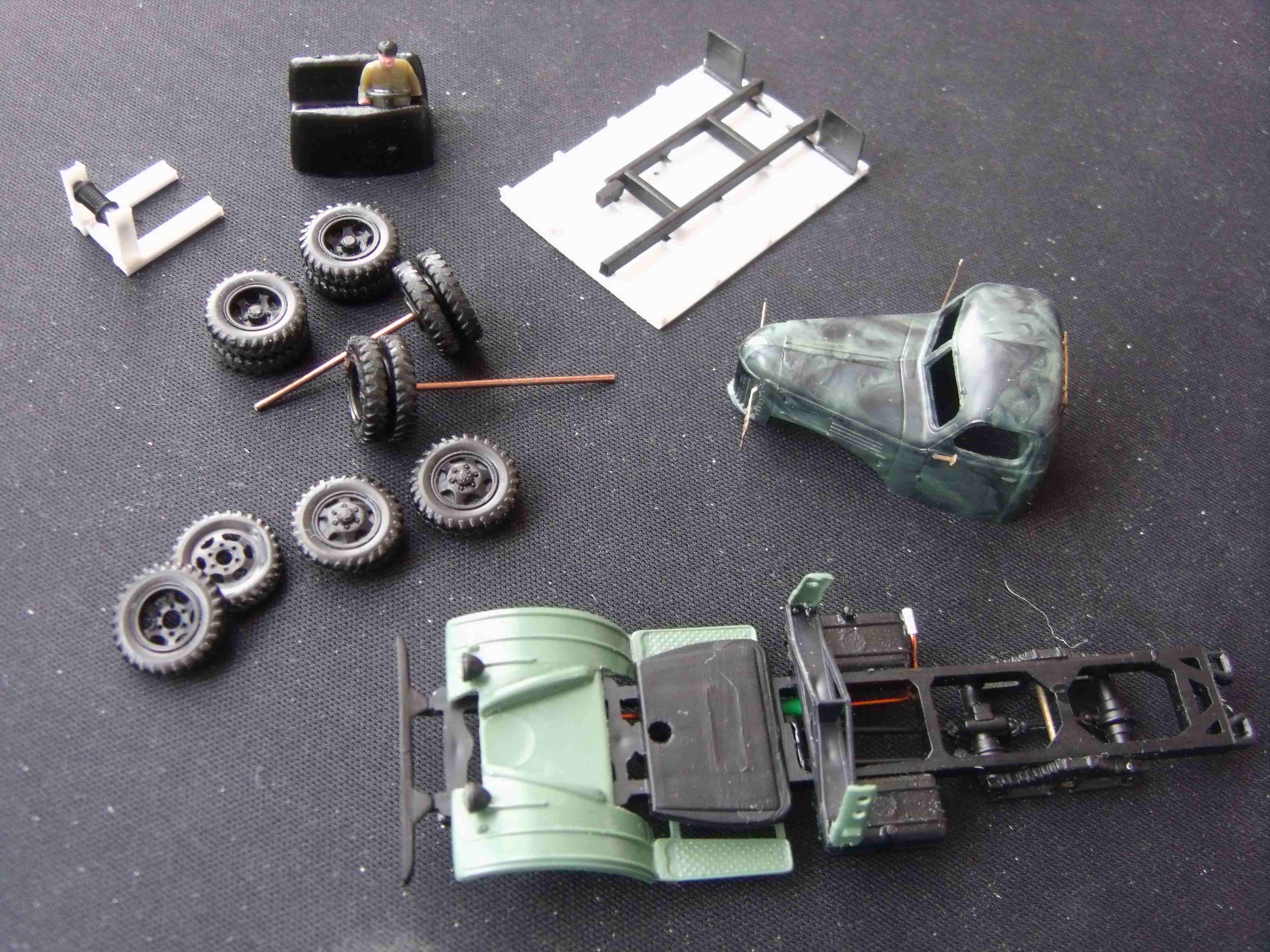 Обточил и подогнал все детальки друг к другу, сделал новый кузов-платформу из пластика, новую выхлопную трубу.