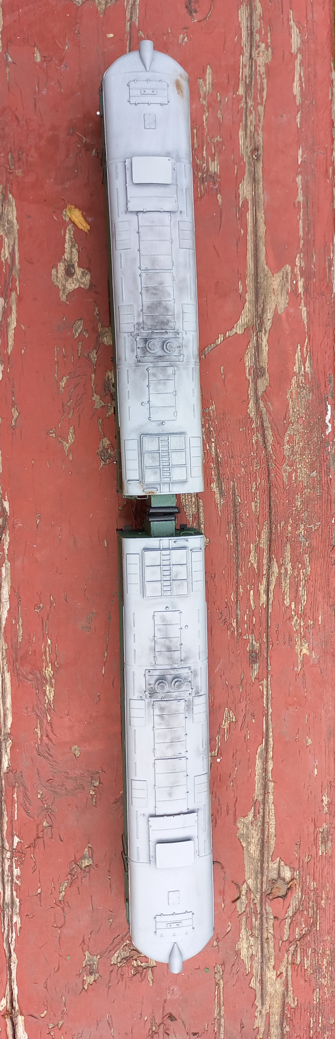Все никак не могу угомонится. Ну раздражали меня "машкины" баки... Нашел смоляные боковины, видимо перелив оригинальных. Но только две штуки. Также проблема этой смолы в том, что ни одна краска, включая эмаль от "Ревелл" там не держится. Вспомнил совет, который дал еще давно форумчанин Олег, и макнул детали в жидкий суперклей. Эдакая радикальная грунтовка. Вроде сработало: краска взялась хорошо. Потому отпилил на безмоторной секции боковины бака и вклеил смолу.