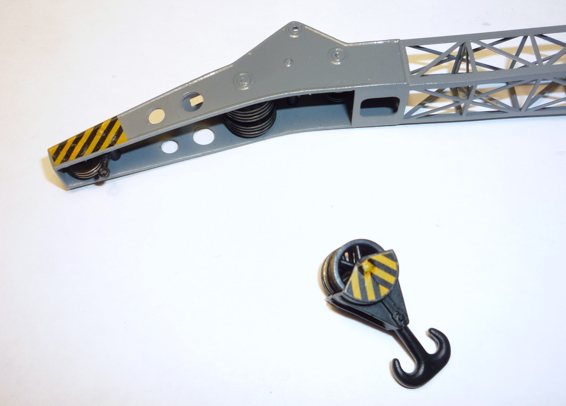 Ну и главное, обдеколил ходовую. В принципе, нормально. Сбоку при увеличении подложку видно, но сверху ещё будет лак. А с такого ракурса гораздо лучше Ну и стрела и крюк. По внешнему виду деколей ожидал худшего, но всё оказалось не настолько плохо. Хотя качество, стиль и техника их исполнения напоминает 90-е годы.