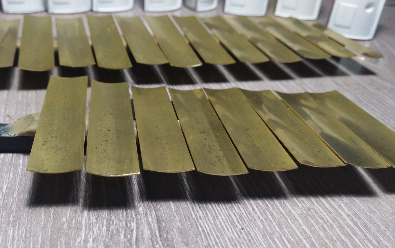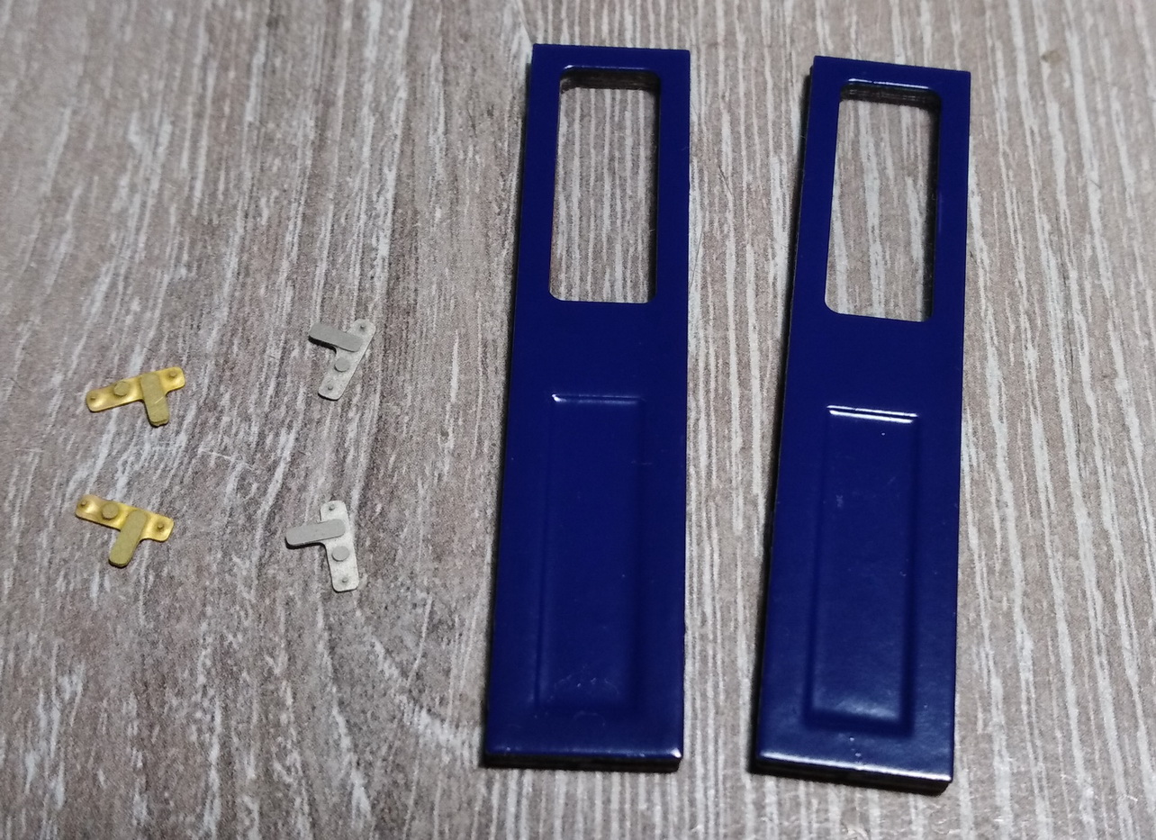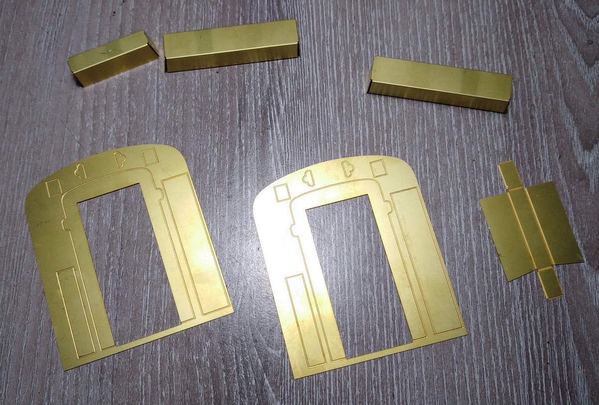 Доклеил всю мелочь внутри умывальников. Долго думал как придать изгиб латунным дверцам. В итоге подобрал лист алюминия с изгибом и отрезок металл. трубы. Матрица и пуансон. Вроде получилось. Покрасил внутреннюю часть в белый цвет, наружную ждёт та же процедура, что и стенки купе - бумага и полоски шпона. Ещё оси для возможности открытия, ручки и зеркала.