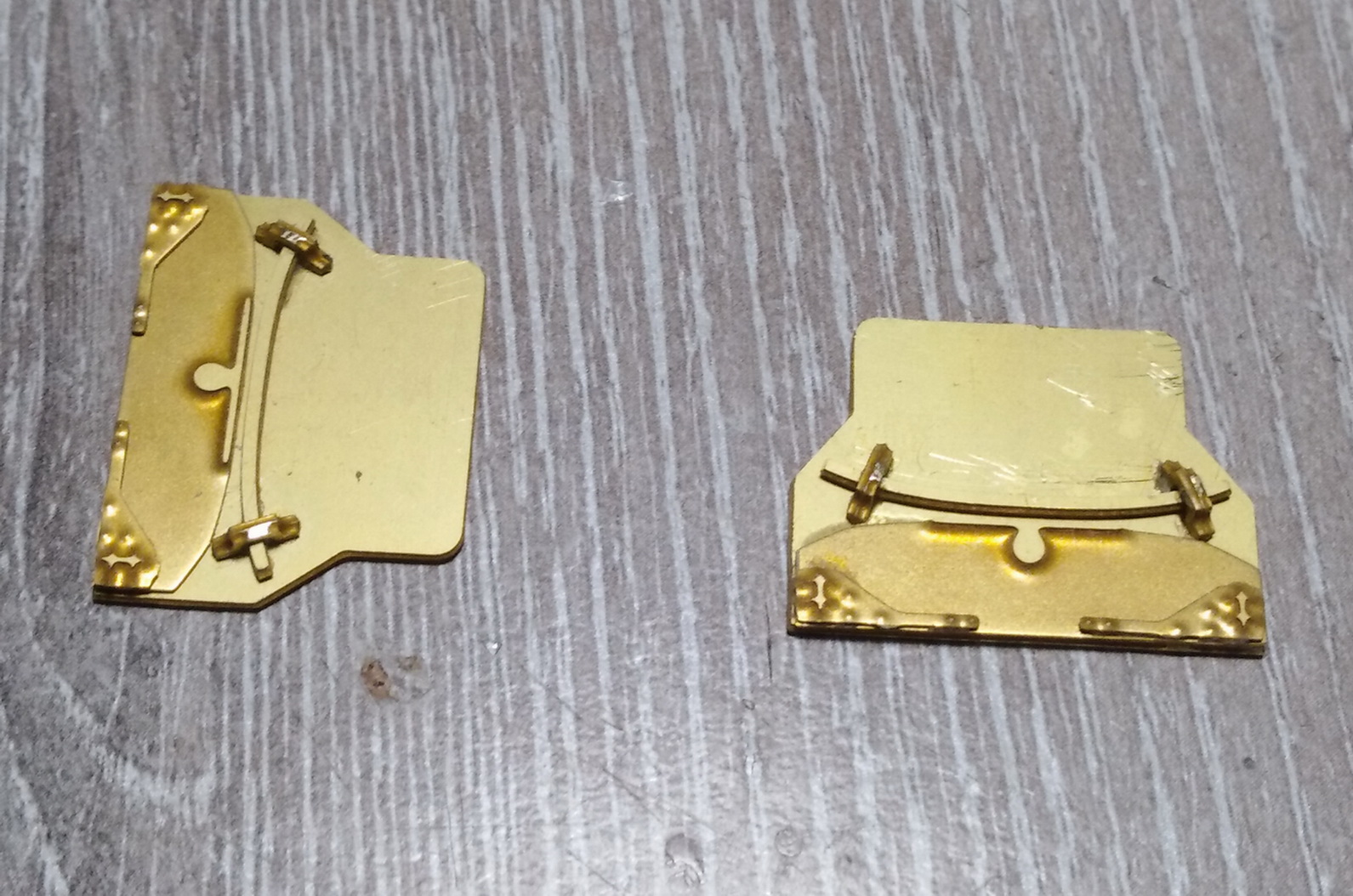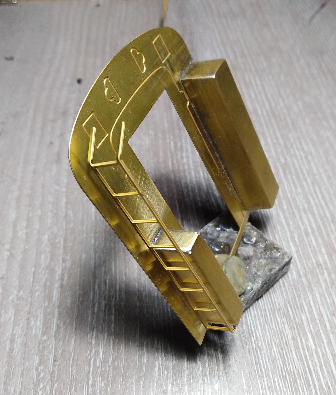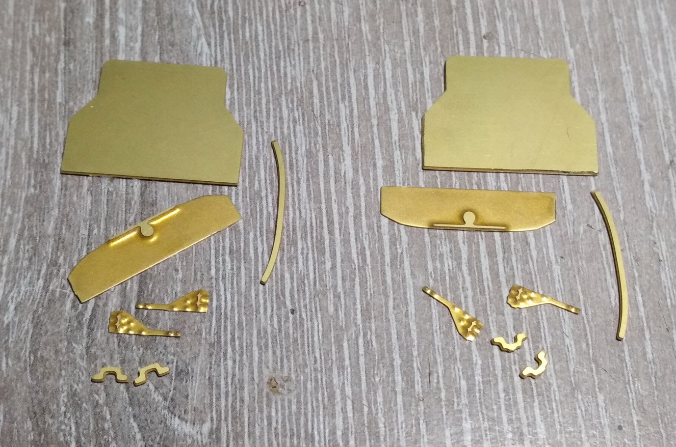 Доклеил всю мелочь внутри умывальников. Долго думал как придать изгиб латунным дверцам. В итоге подобрал лист алюминия с изгибом и отрезок металл. трубы. Матрица и пуансон. Вроде получилось. Покрасил внутреннюю часть в белый цвет, наружную ждёт та же процедура, что и стенки купе - бумага и полоски шпона. Ещё оси для возможности открытия, ручки и зеркала.